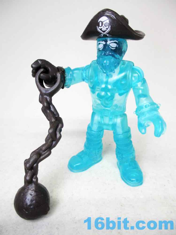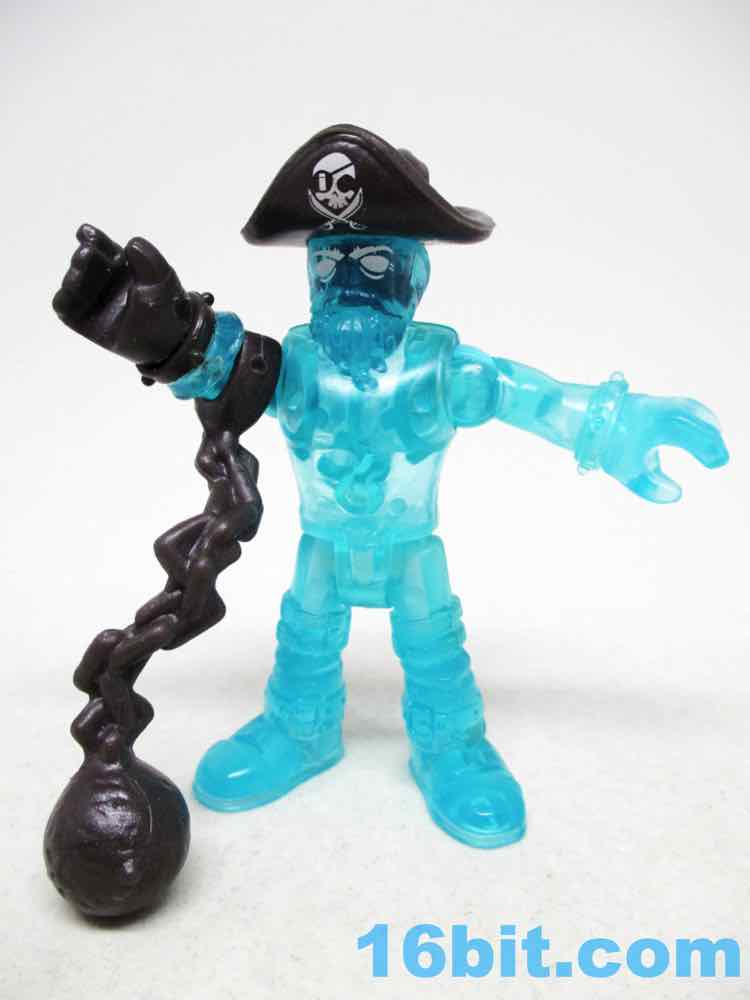 The 3-inch figure comes from the same template as other figures, and it appears that it's a redeco of Billy Bones - a pirate from their very nifty humans vs. sharks & whales line of pirates, of which I couldn't say no to the orca and a blind-bagged shark. (I mean, they're like Battle Beasts.) This figure has Billy Bones' iron hand, with a matching shackle painted on his wrist. There's also a matching ball and chain accessory which clips to his wrist, which seems to give us the cause of death for Mr. Bones. It's grim - the figure has the same hat with the "i" symbol in the skull, the same bare chest, with the coat piece removed. I mean, for budget and general aesthetic reasons, it was wise to drop it. The hat is fused inside the head, so you can't remove it. Much like Shackles couldn't remove his iron glove and the weight which undoubtedly caused him to drown in the sea.