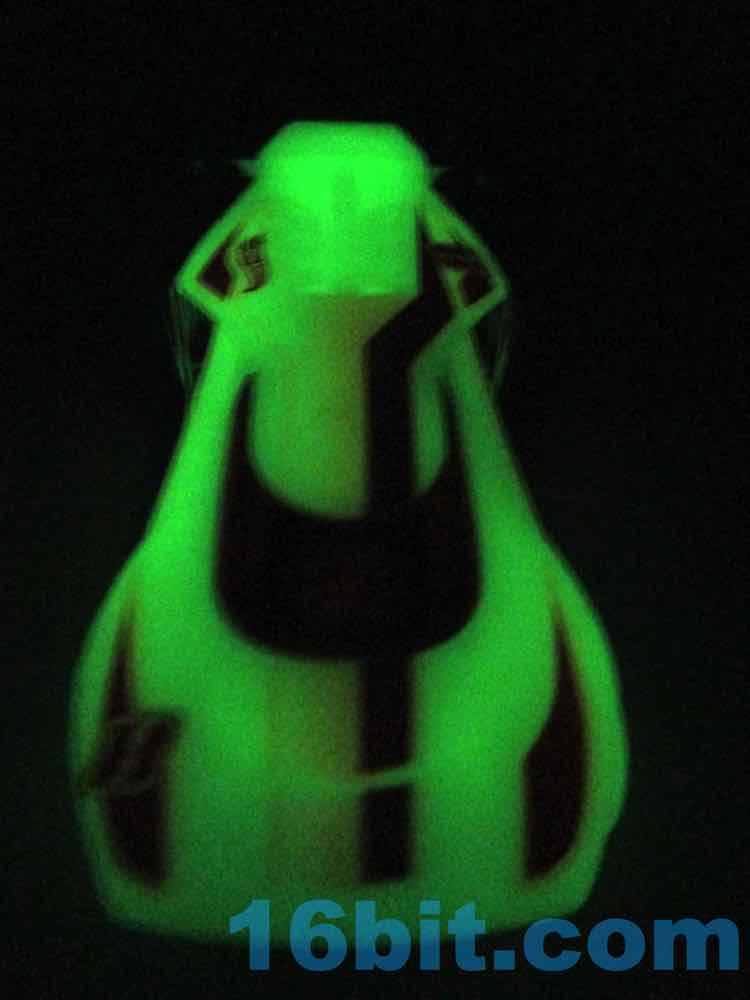 What's less good are the characteristics of glow plastic and painted detail - it's easily absorbed. The orange and red printing on the car is surprisingly ornate but difficult to see the halftone dots and various words, particularly the orange ones. If you shine a UV black light on the car, everything pops wonderfully and it's much easier to read or see the graphic design work they put into this. It's nothing too fancy, but I do like seeing a glow toy that sings nicely under the UV lights. What's more, there's more chrome in the interior under the clear red windshield which also pops a little bit, even in low-light conditions. Vac-metal plastic and glow plastic are frequently excellent choices for low-light situations, because glow will shine light back at you and the chrome will reflect any tiny amount of light in the room back. Since this does both, I assume it may make it harder to step on.