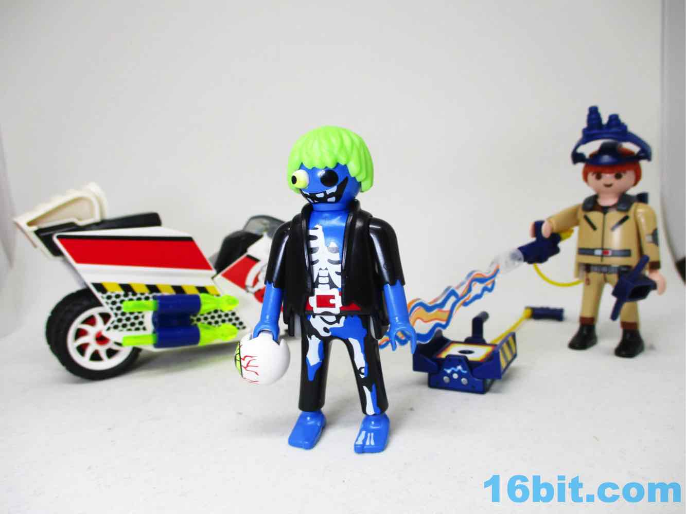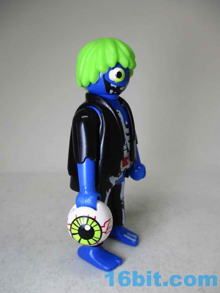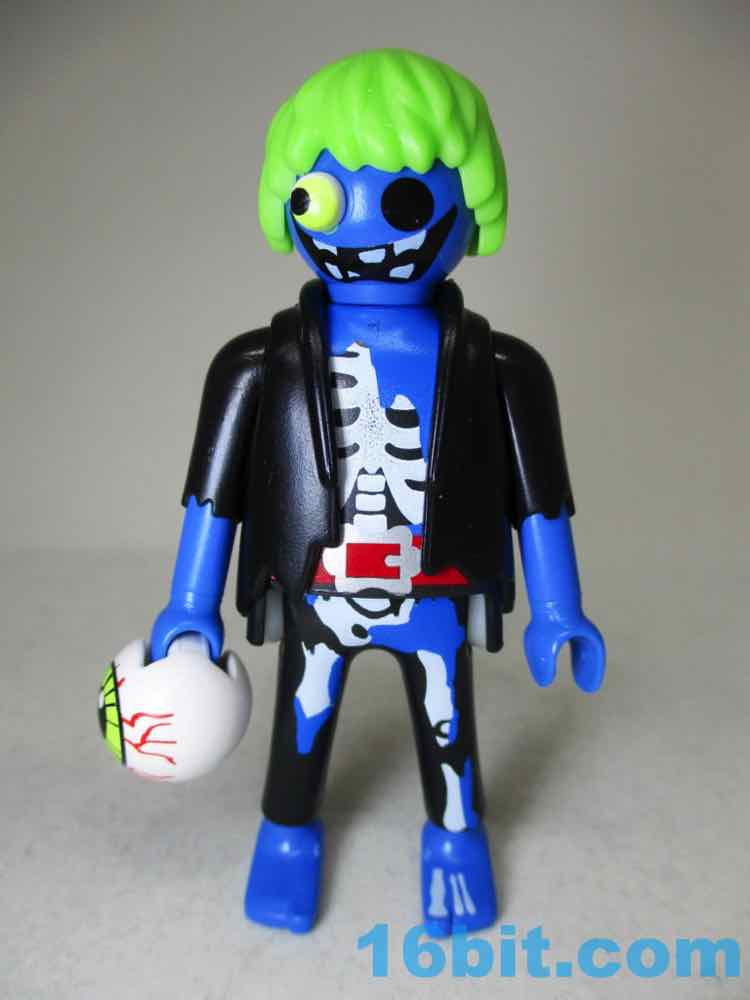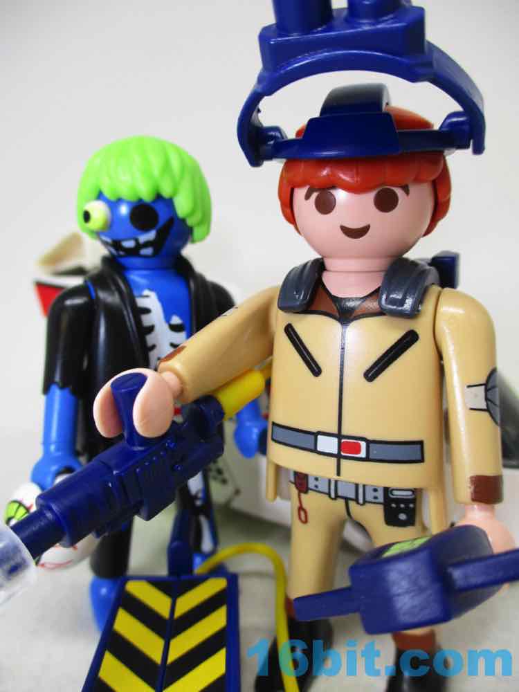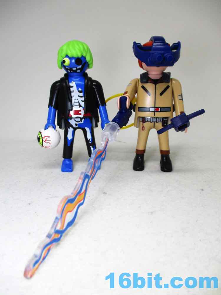 His companion is a bizarre designer art toy that somehow crept into a Playmobil set - with one bulging eye, another removed an dplaced in his hand, and a grotesque smile - also a blacked-out socket from where the eye was - this is probably one of the most disturbing Playmobil figures I've ever seen. It's brilliant. If they sold this thing for $20 in a gallery by itself it'd probably have sold better - in this set, a generic sheet ghost, or Slimer, or something from the series would've probably helped to sell the package. With the somewhat visible bones, the green hair, the tattered clothes, and the absolutely horrifying face, I can't really understand why it's even part of a licensed set like this. The artists behind it did a great job, but in this context, one has to ask "why?" Or maybe "Why not?" since they got something creative and weird out, and I assume down the road that this blue creep is going to be why people will want this set. Ghostbusters fans will come and go, but a weird figure is forever.