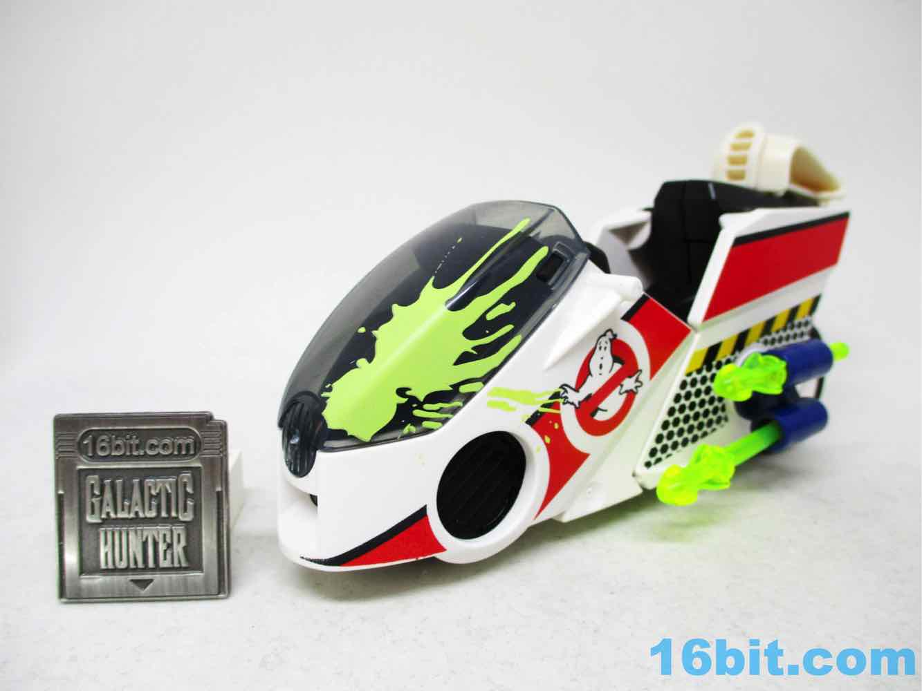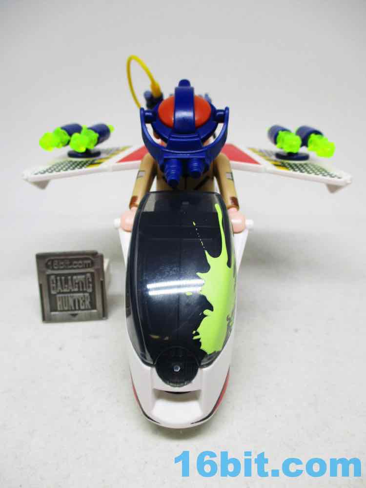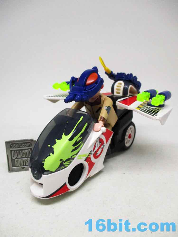 The Sky Bike assembles quickly and is mostly good - one of the wheels on mine doesn't spin very well, and two of the rockets are a little loose in the launchers. But other than that, it's basically a lot like an old Kenner M.A.S.K. toy in that it's a bike, and then it has pop-out wings for a flight mode. It's a real toy! More specifically, it's a redeco of an old non-licensed toy, which is also the kind of thing Kenner was famous for doing in the 1980s. It clicks together easily and the flick-rockets fire pretty far. Unfortunately, they don't necessarily hold in place - so the clear, neon green projectiles could fall out if you aren't careful. The vehicle has no problems holding a standard adult figure in pants, plus there's a nice mounting area for the proton pack. Unfortunately, there's no on-board storage for the beam, the trap, or the PKE meter - so expect to lose those if you aren't careful.