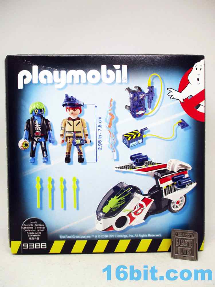 Item No.: No. 9388 Manufacturer:Playmobil Includes:Ray Stantz, PKE meter, wand, energy beam, Proton Pack, Eyeball Ghost, headgear, 4 launching rockets, bike, sticker sheet, Ghost Trap Action Feature:Rockets fire, Bike wings open and close to simulate wings Retail:$19.99 Availability:May 2018 Other:Shares parts with 5288 Top Agents 2 Skybike from 2012, 2021 Back to the Future Part II 70634 2015 Hill Valley, and more in between