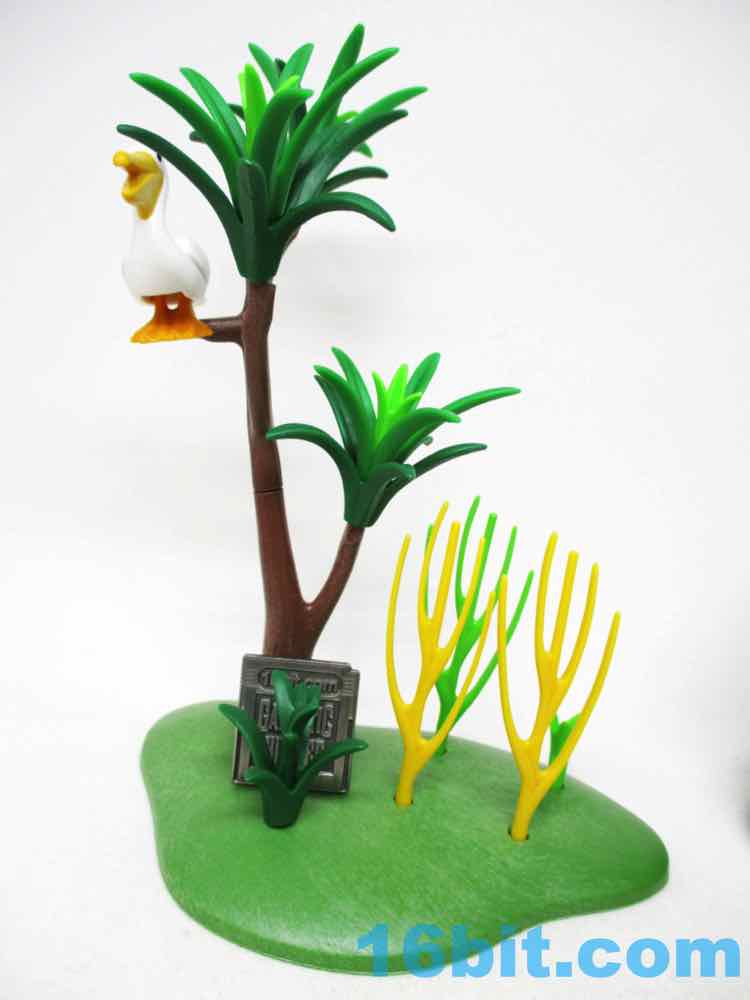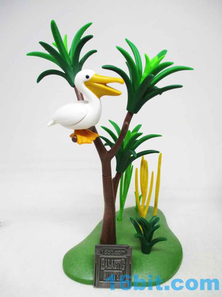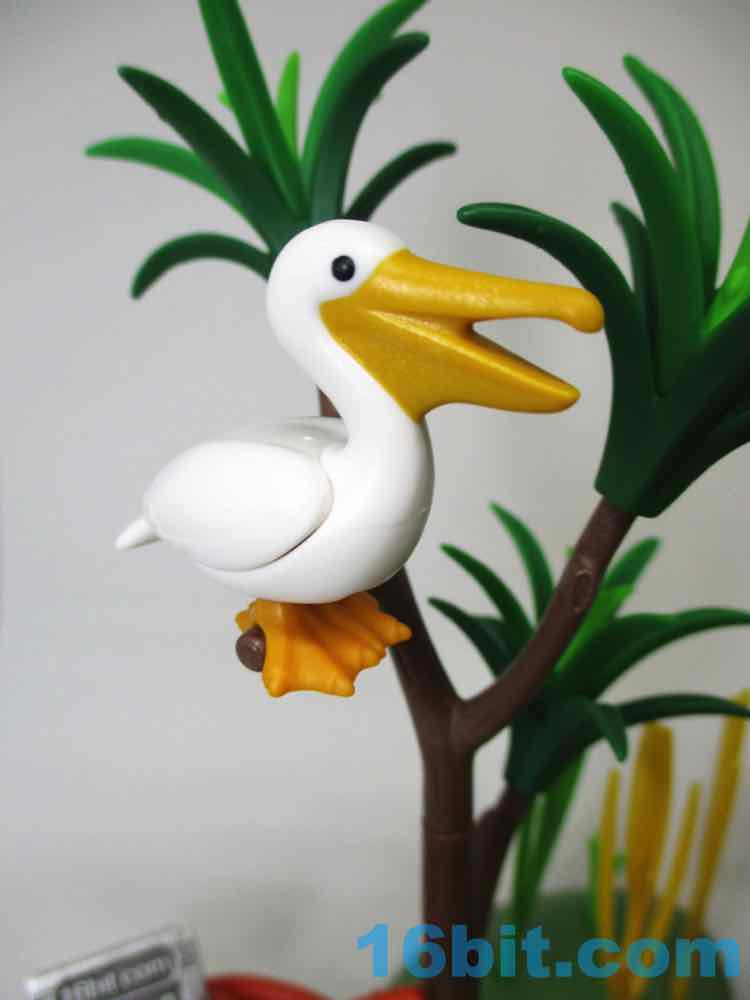 Joining them are a small selection of animals. There's a pelican you can perch on the tree! It's cute. There are two tiny turtles, and you have to assemble them with their shells. The selling point may be the alligator, which is a smaller version with articulation at the neck and jaw. Other versions have moving legs or limbs, but not this one - it's smaller and cheaper, and has unpainted yellow eyes. How is this possible? Playmobil dual-injection molds many of their toys, so there's a yellow plastic piece inset in the toy's head - so if you scuff it, the eyes are still yellow. There's no paint to scuff off, the gator is entirely molded in color. This is true for many of the toys they produce, which keeps them looking nice much longer than some of the American equivalents. This is also why they may cost more. Also, our reptile friend can float in water too.
