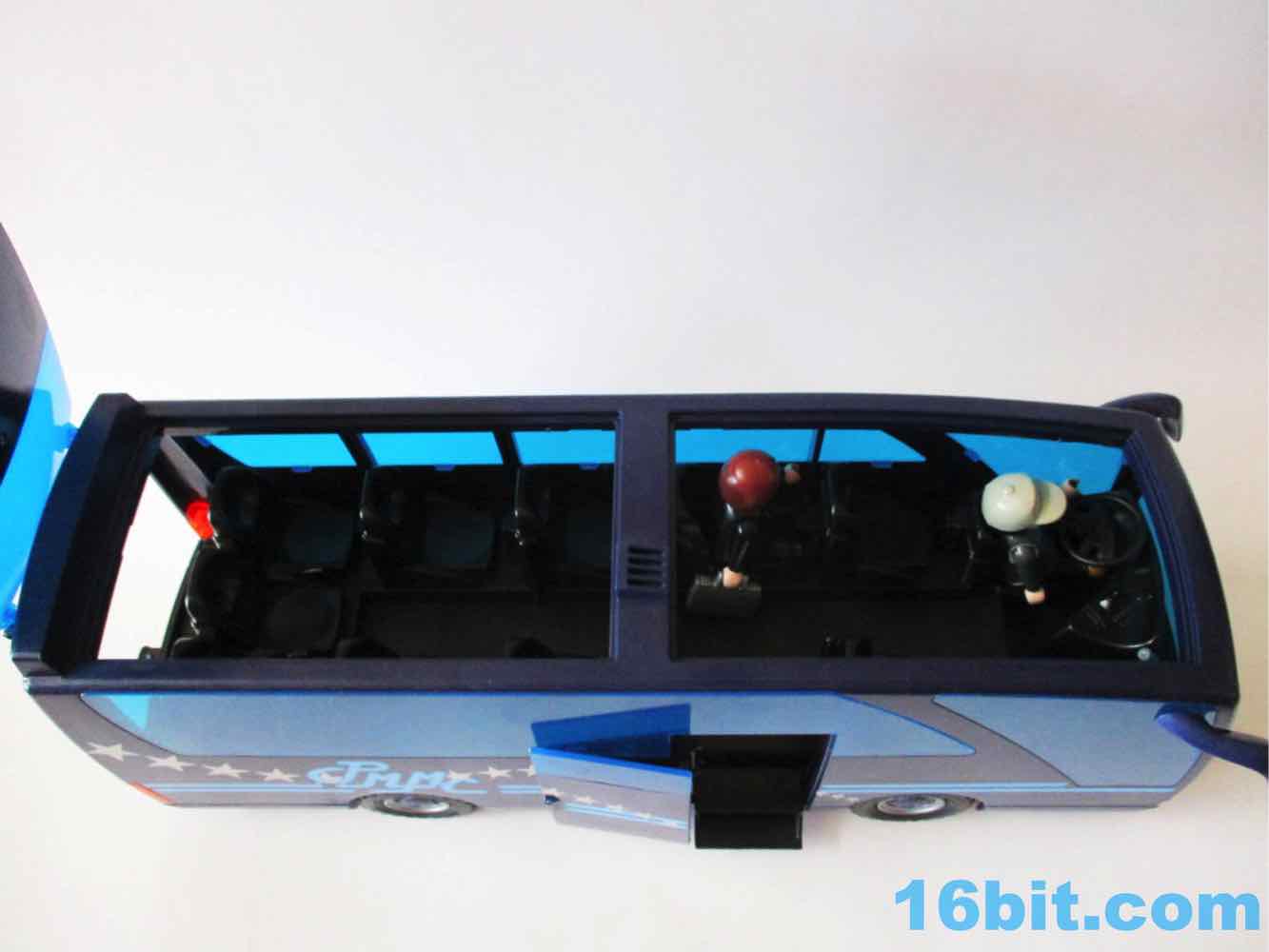 The bus is one of the bigger vehicles, coming in a box that's mostly empty space. Assembly is easy - there's a blog you plug wheels in to, and then you plug that in the bottom. If you have the RC Module, you can also make it a remote control toy. But I don't, because I only wanted to spend $11. It feels light - there's a dock on the driver's dashboard for a walkie talkie/cell phone, but one is not included. There's on-board storage for luggage, but only one briefcase.