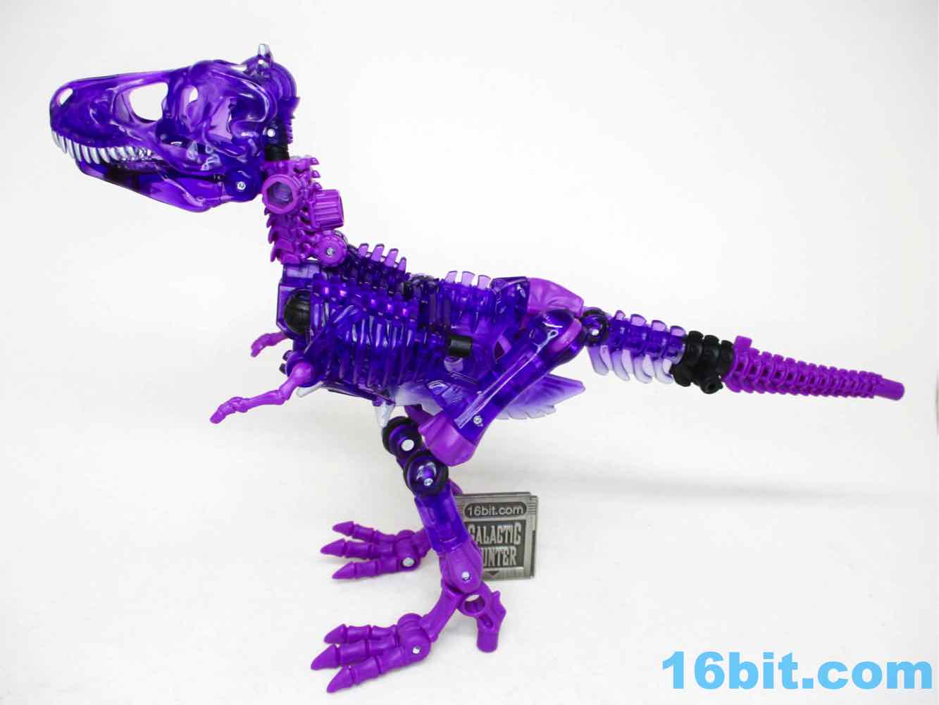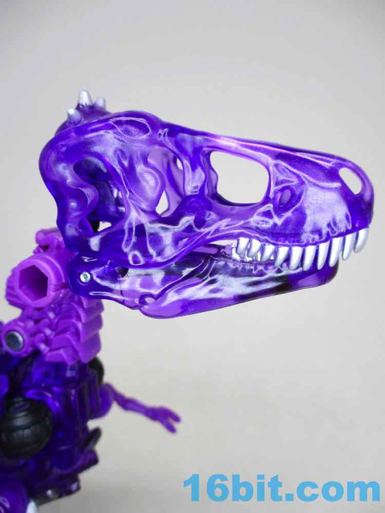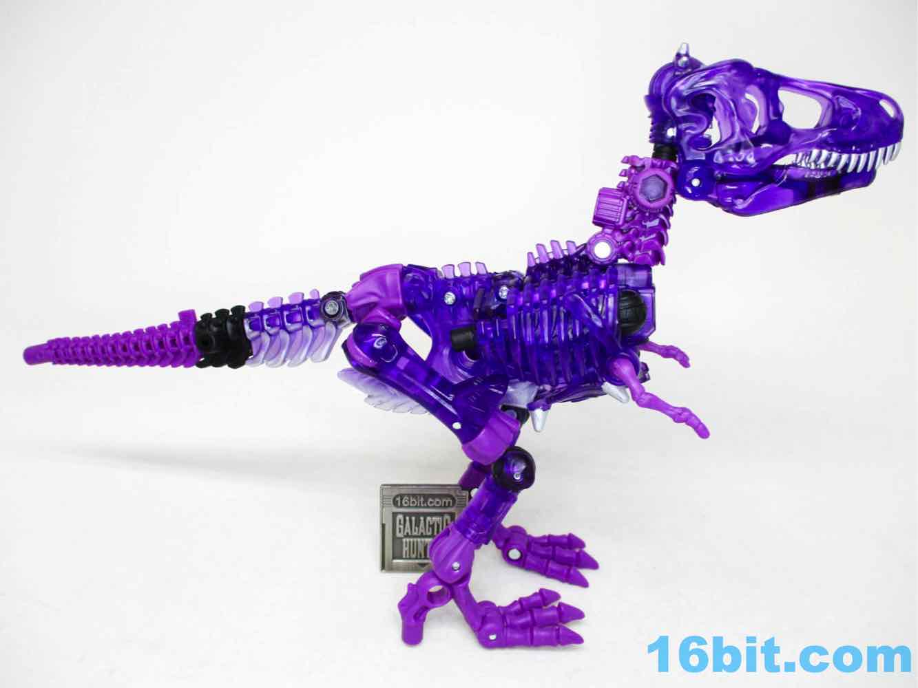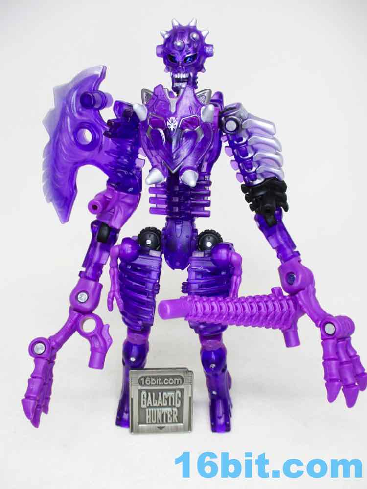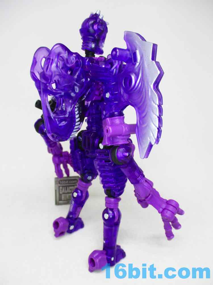 Skellivore is a purple redeco of Paleotrex [FOTD #2,277], an exquisite figure in bony deco that is absolutely worth your time. The clear purple redeco is cool in its own right, but it's clear, so you'll want to be careful with it. It reminds me of some Glyos figures, with excellent silver highlights to bring out some of the bone detail. You can read the Paleotrex review for the nuts and bolts of how it works - you pry it apart and have to reassemble it to make a t-rex skeleton or weapons for other figures. It's a very good design and much more interesting and different than Megatron.
