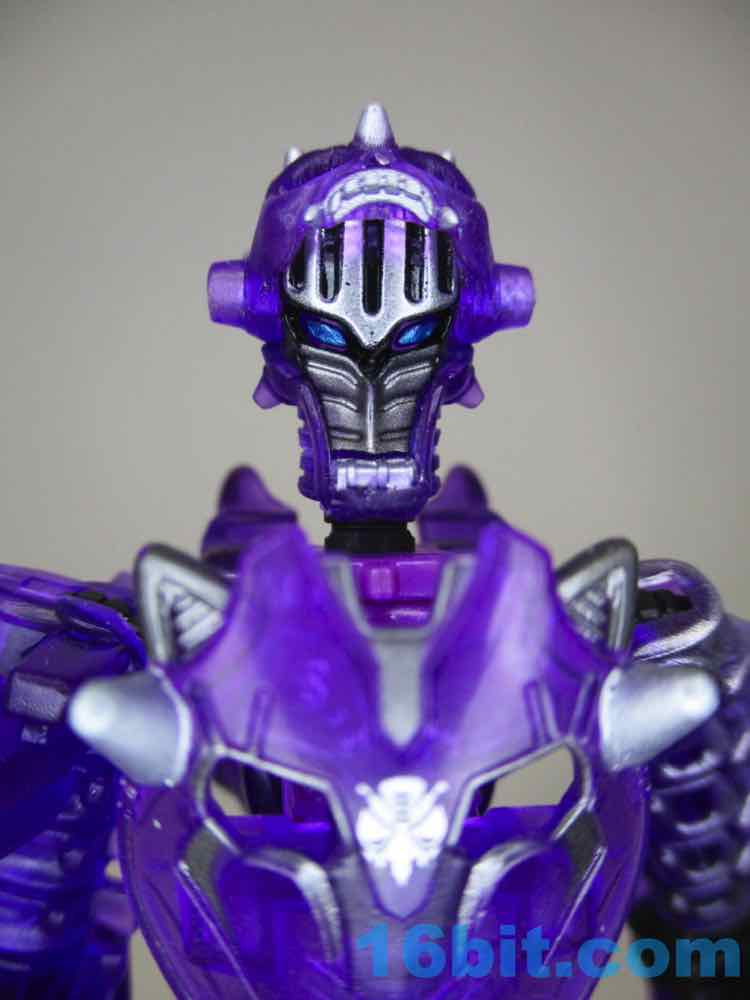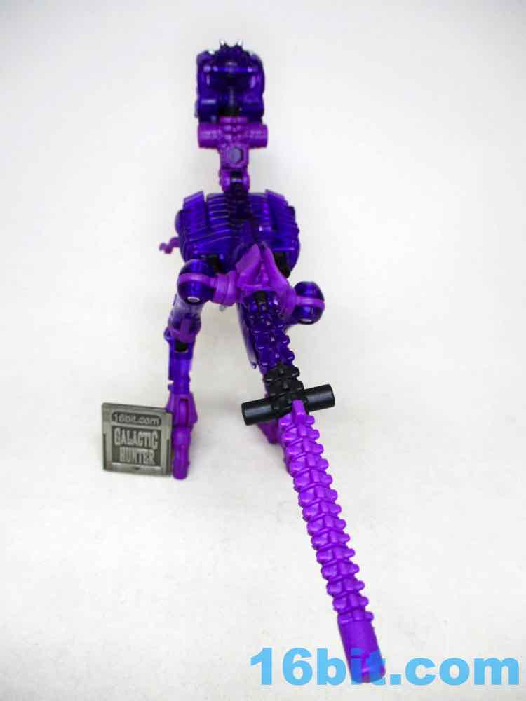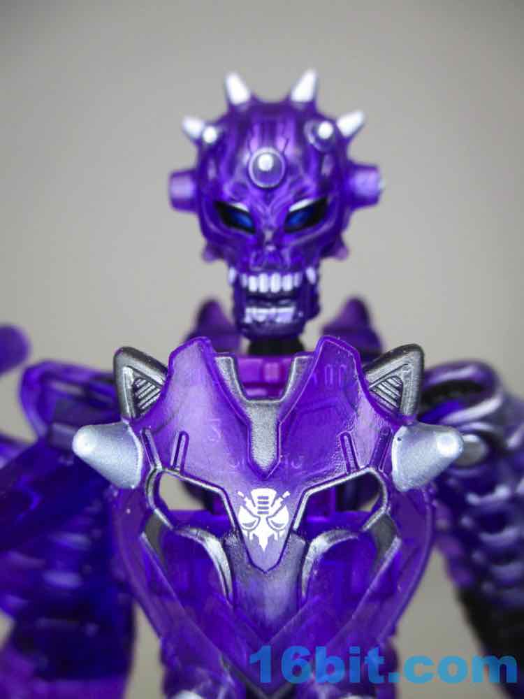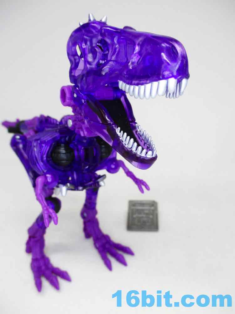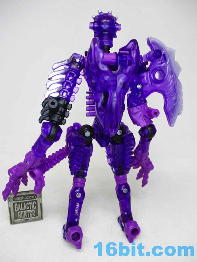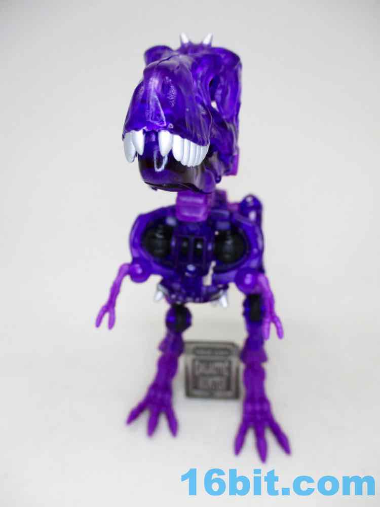 Skellivore is a purple redeco of Paleotrex [FOTD #2,277], an exquisite figure in bony deco that is absolutely worth your time. The clear purple redeco is cool in its own right, but it's clear, so you'll want to be careful with it. It reminds me of some Glyos figures, with excellent silver highlights to bring out some of the bone detail. You can read the Paleotrex review for the nuts and bolts of how it works - you pry it apart and have to reassemble it to make a t-rex skeleton or weapons for other figures. It's a very good design and much more interesting and different than Megatron.