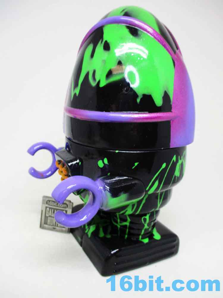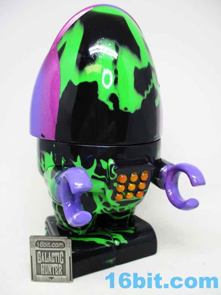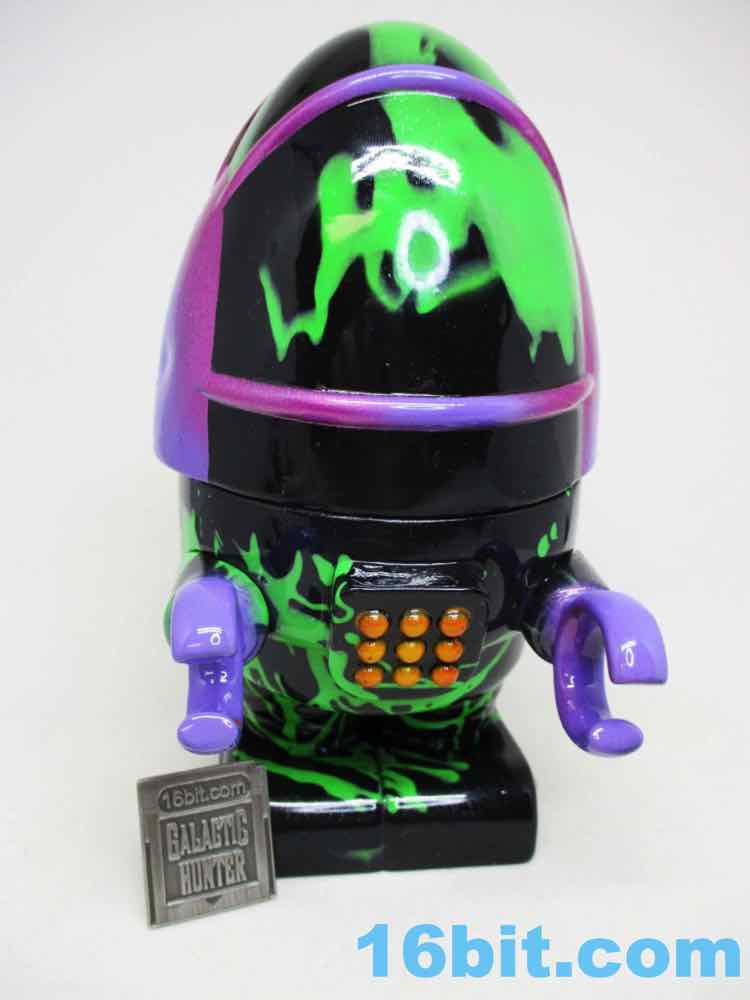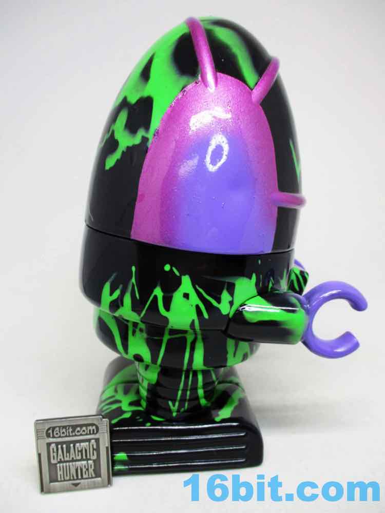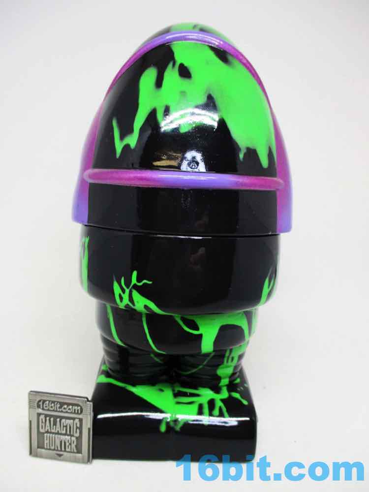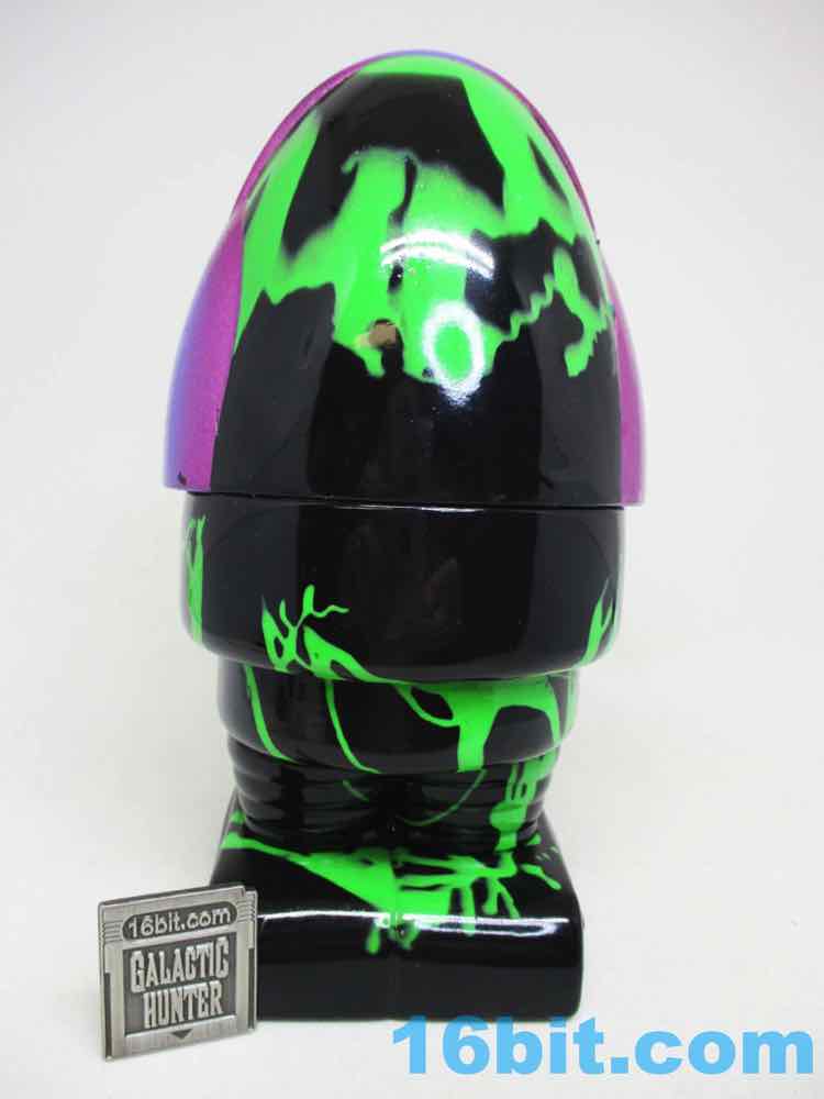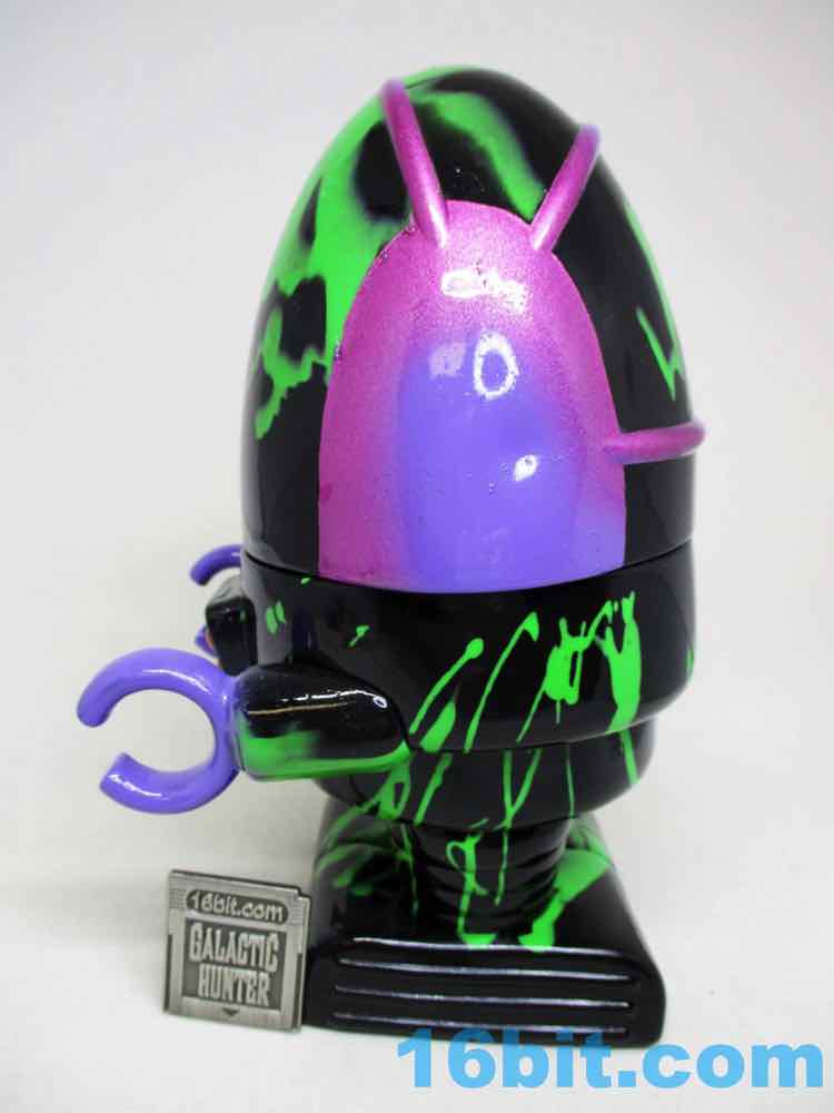 Due to its massive foot base, which isn't necessarily legs, or wheels, or a hovering mechanism, this 5 1/2-inch fellow is unsurprisingly quite sturdy. Th chest has nine painted buttons, two painted claws, and lots of little details which are overpowered a bit by the marvelous green and black coloration. The legs have bands like the Michelin Man or a number of robots, and the legs have some raised lines like a number of vintage vehicles. The panels are largely smooth, with a big, giant L'eggs-sized head covered in bands to give the head some definition. Again, I'm biased, but Seth's paint work is always remarkable - pink fades to purple, and it's this candy-like awesomely bright color that you can't help but immediately love. This is the kind of thing you tend to only see on indie toys, customs, or the odd very rare and expensive exclusive vinyl figure. It looks like it popped off some classic newsprint comic book page from the 20th century.