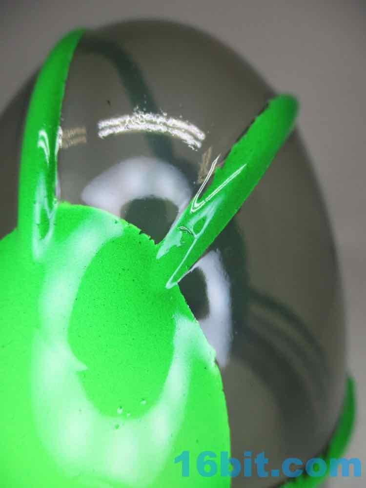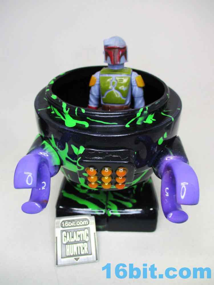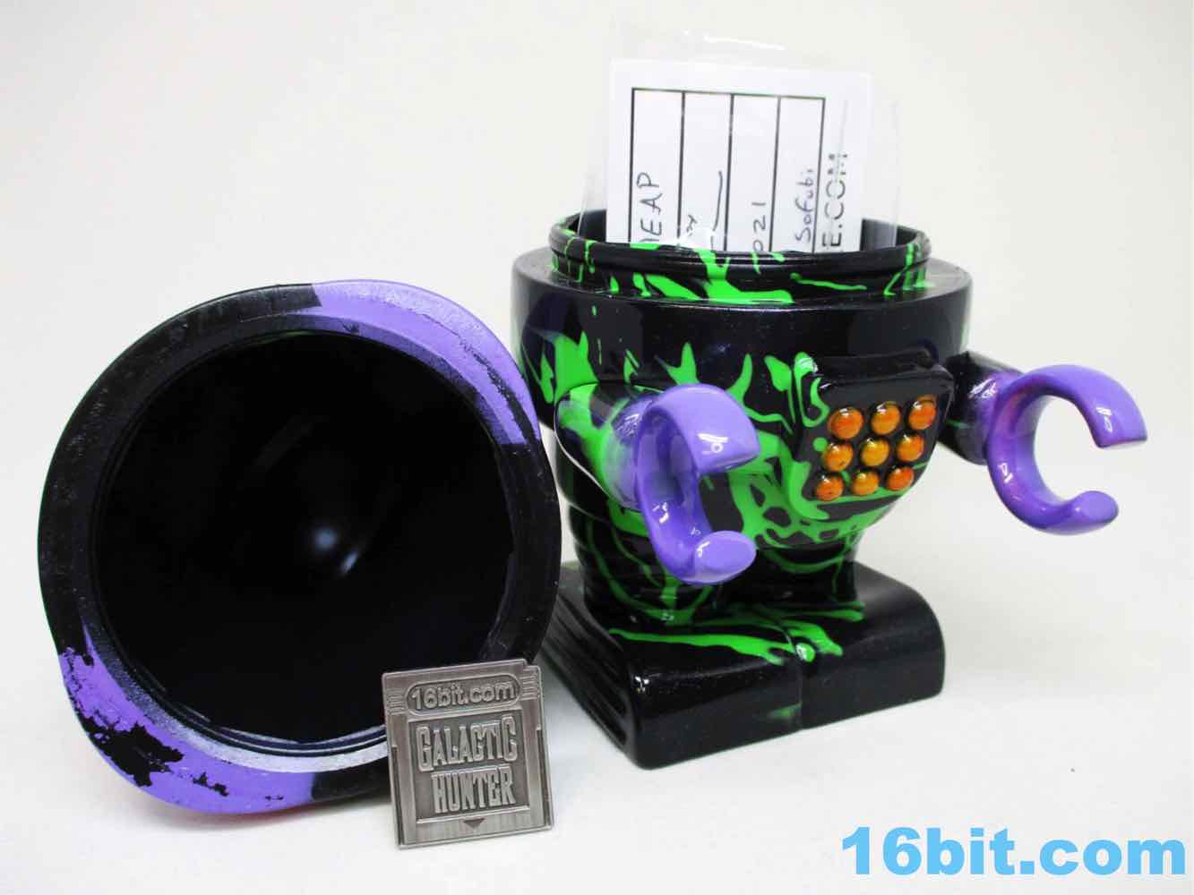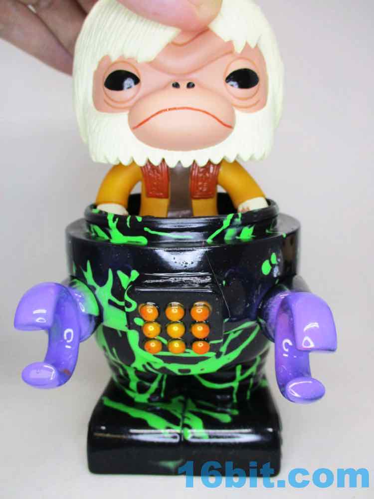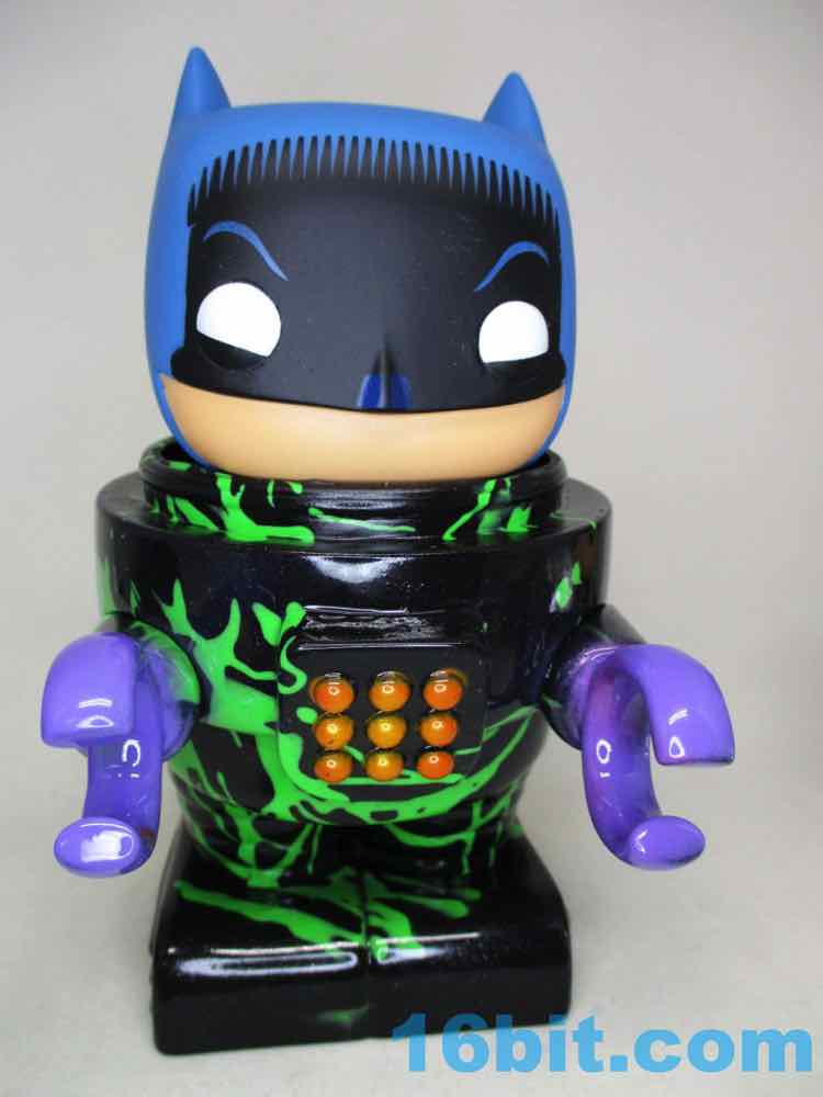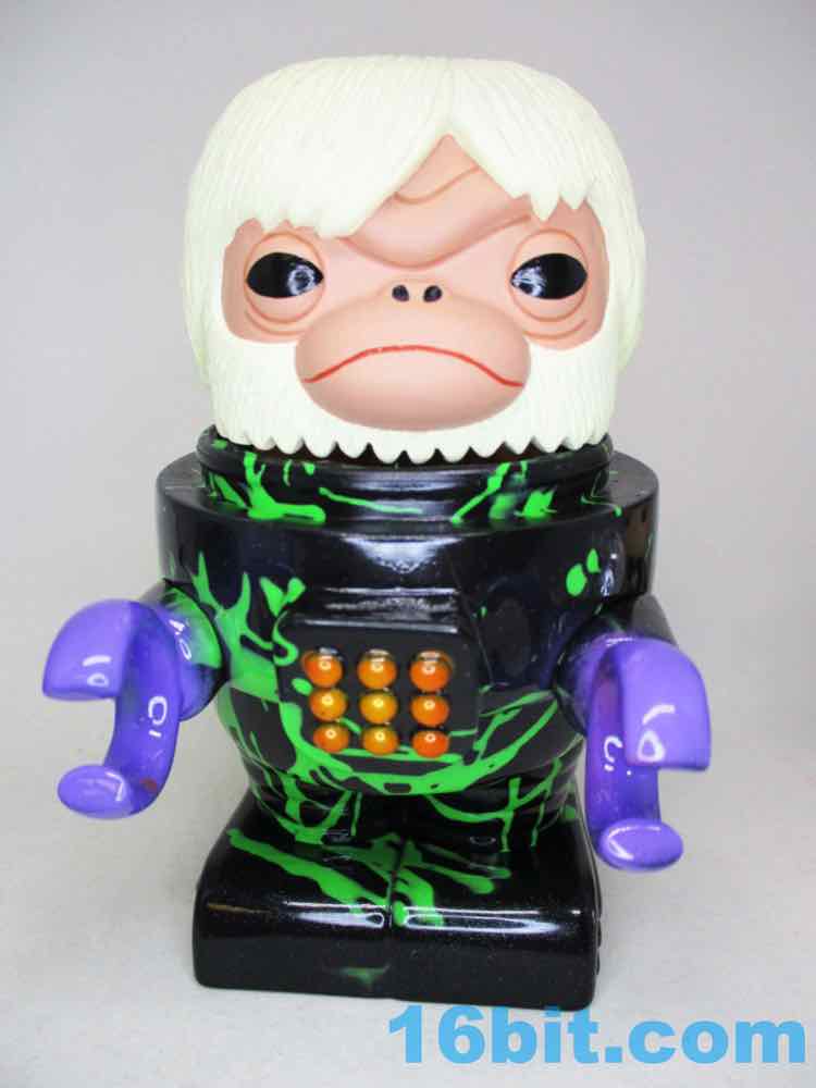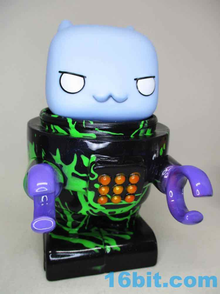 Due to its massive foot base, which isn't necessarily legs, or wheels, or a hovering mechanism, this 5 1/2-inch fellow is unsurprisingly quite sturdy. Th chest has nine painted buttons, two painted claws, and lots of little details which are overpowered a bit by the marvelous green and black coloration. The legs have bands like the Michelin Man or a number of robots, and the legs have some raised lines like a number of vintage vehicles. The panels are largely smooth, with a big, giant L'eggs-sized head covered in bands to give the head some definition. Again, I'm biased, but Seth's paint work is always remarkable - pink fades to purple, and it's this candy-like awesomely bright color that you can't help but immediately love. This is the kind of thing you tend to only see on indie toys, customs, or the odd very rare and expensive exclusive vinyl figure. It looks like it popped off some classic newsprint comic book page from the 20th century.