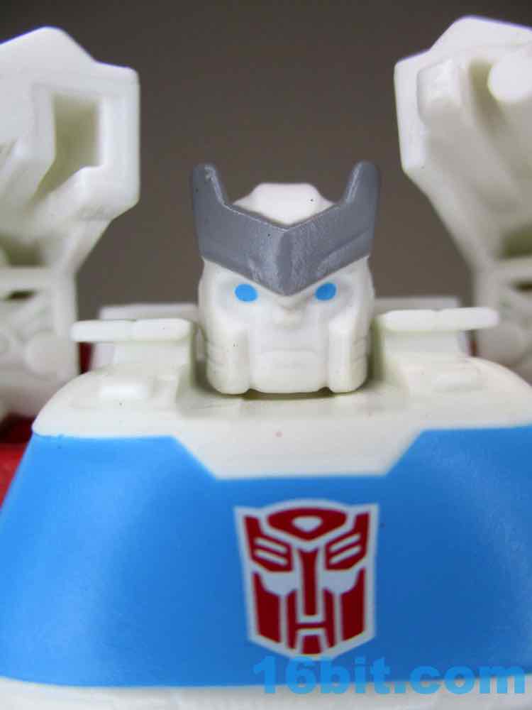 The head sculpt is good, but the paint doesn't help much here. The blue eyes seem almost undefined, and the grey crest floats atop an all-white head. In bright light you can see a mouth, nose, and signs of a chin, but without some sort of darker color to bring out the detail they may as well not be there. If they moved the paint from the crest to the face, I think they'd have a better-looking toy. I also think they make these look a little worse on purpose so collectors don't jump ship from the War for Cybertron guys, but that's just the toy conspiracy theorist in me. Things like fist size and face sculpts are easy to get right without having to worry about the budget - it's just about how much time you want to spend making something better.