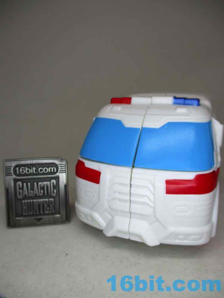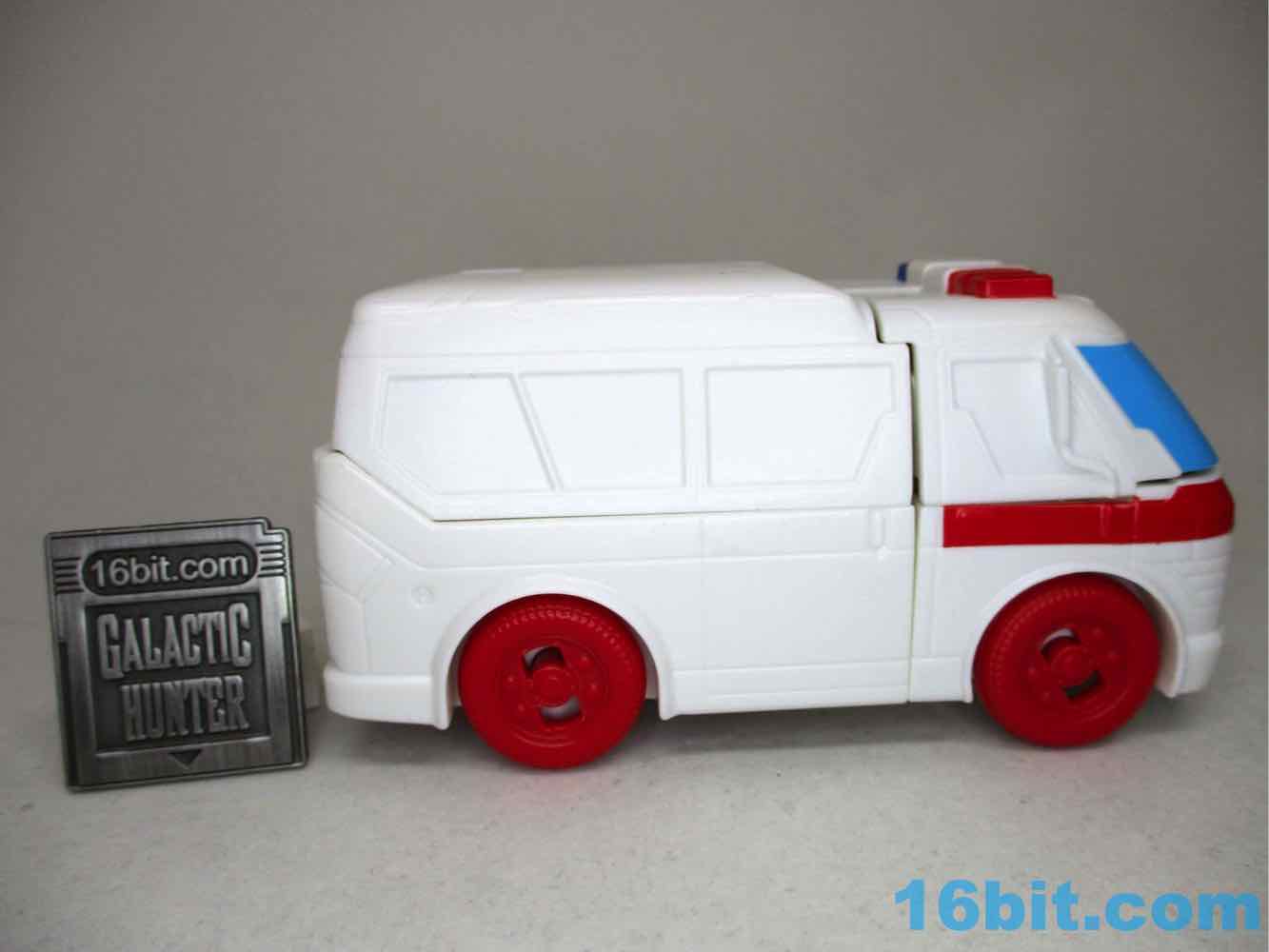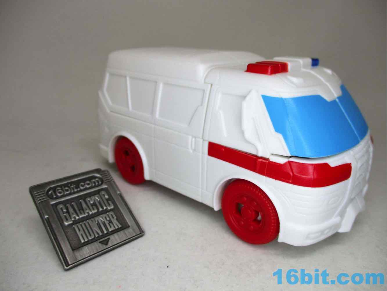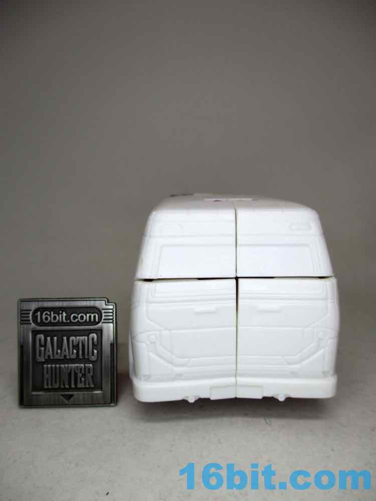 Transformation is easy - the arms fold over to form the front of the ambulance. The legs have an interesting series of nesting panels that unfold to form the back of the van. It's clever, and the vehicle itself looks really good despite the lack of color. The back half is unpainted white with molded red wheels - no painted windows, no special detail of any kind, and no action features beyond rolling wheels.