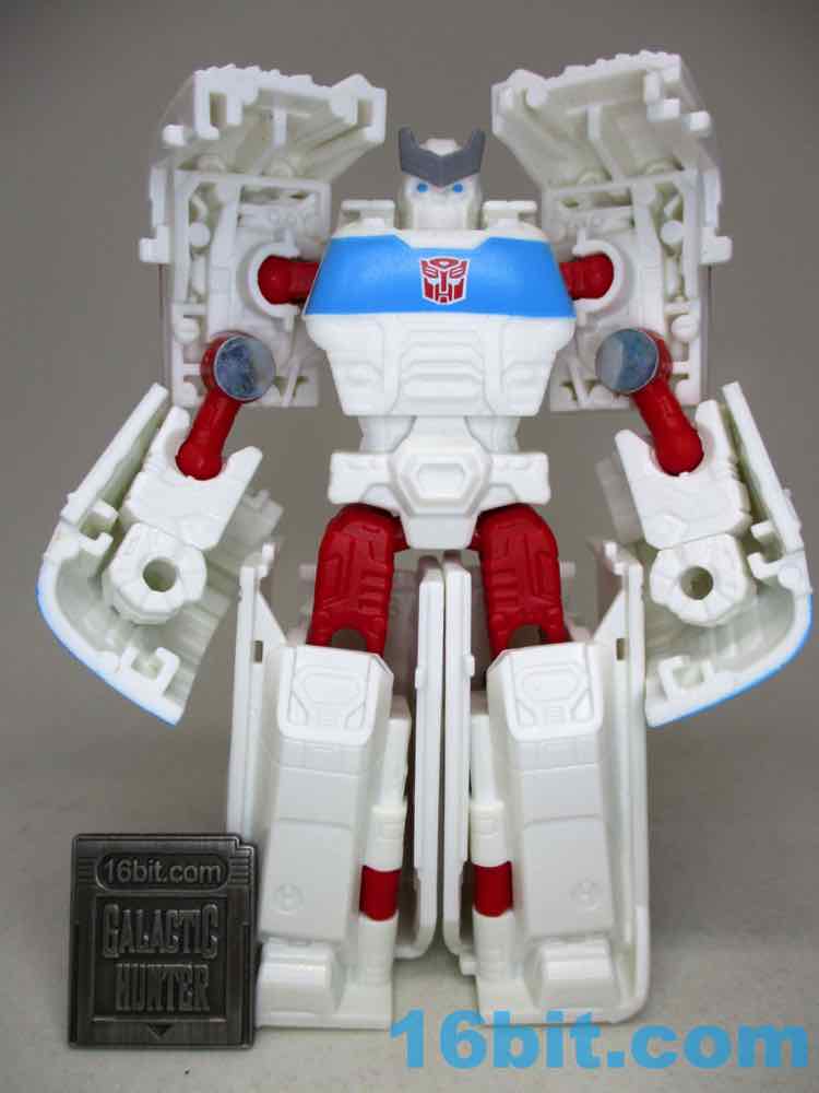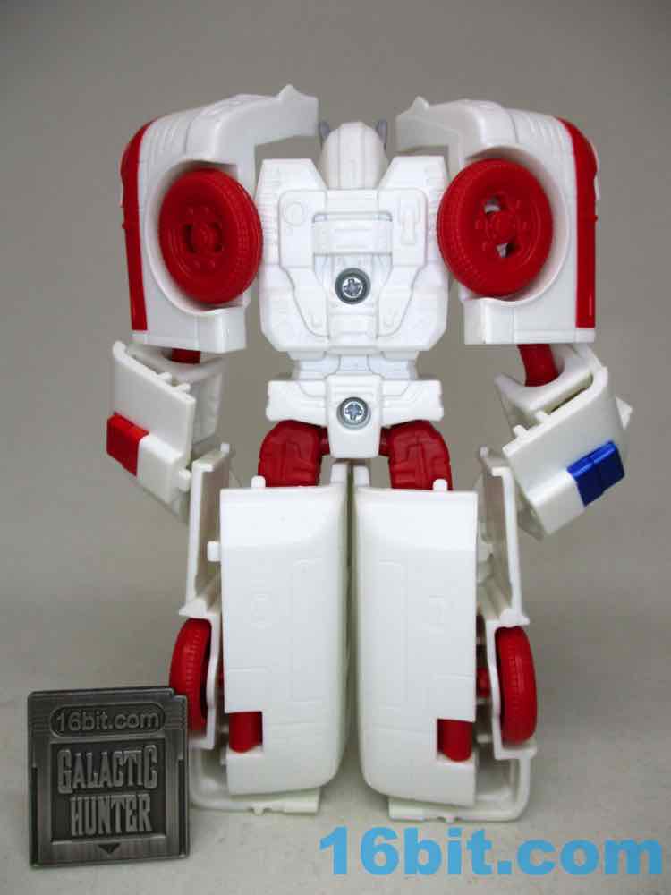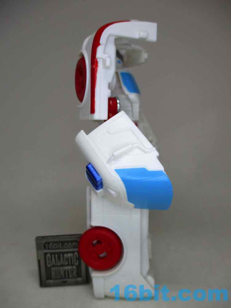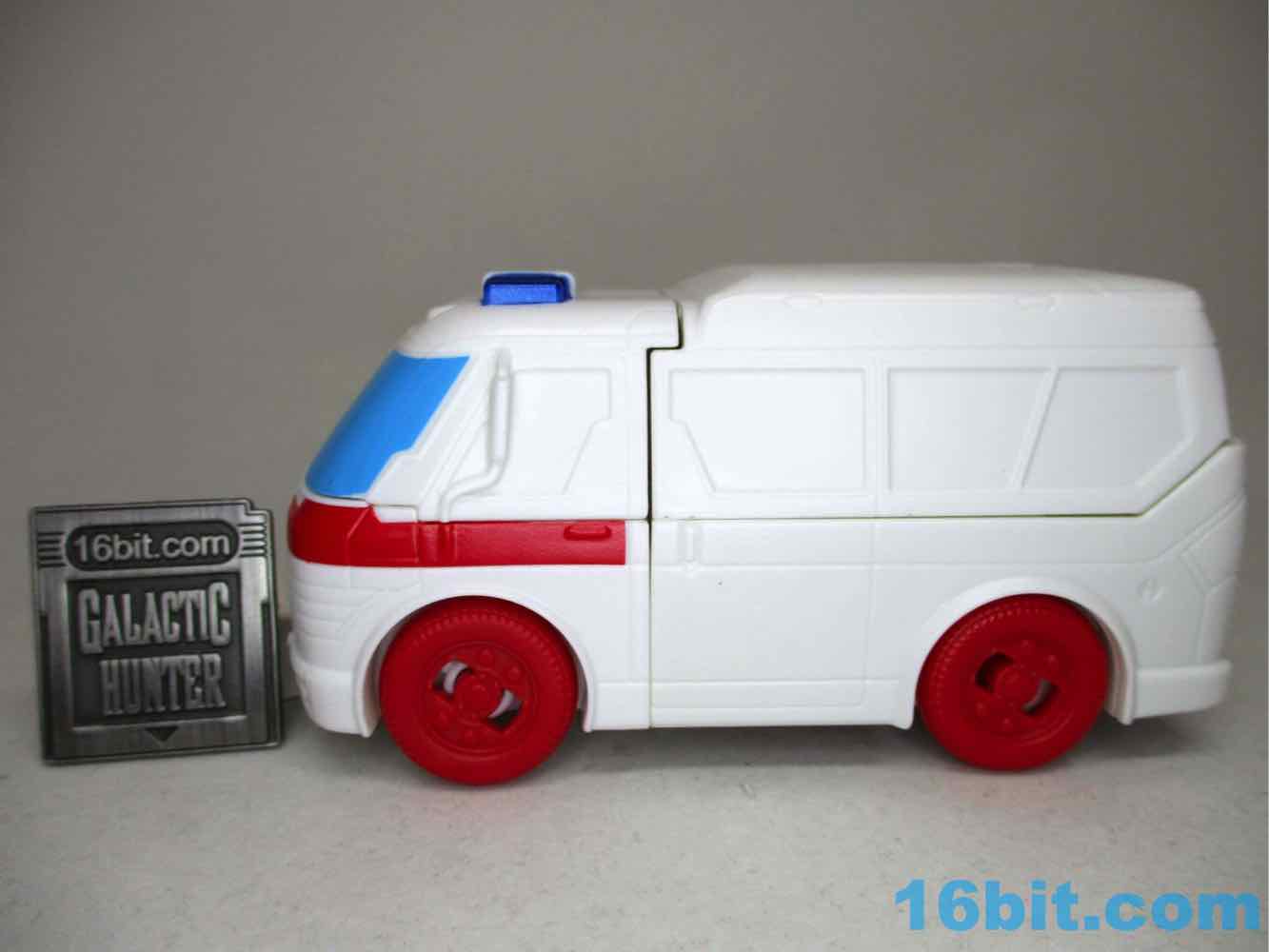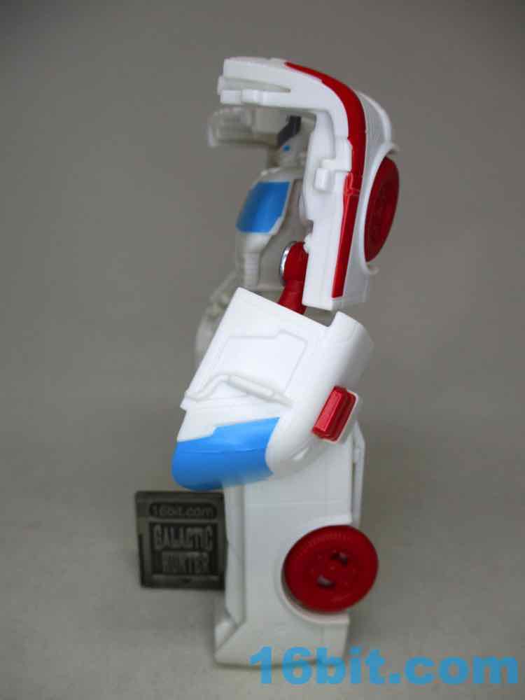 Transformation is easy - the arms fold over to form the front of the ambulance. The legs have an interesting series of nesting panels that unfold to form the back of the van. It's clever, and the vehicle itself looks really good despite the lack of color. The back half is unpainted white with molded red wheels - no painted windows, no special detail of any kind, and no action features beyond rolling wheels.