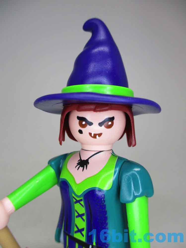 The face is pretty much the same as one from a few years ago in the blind bags. That one had a black dress with orange and a spider web on it. The face had a mole, a weird toothy smile, and these odd eyes with black heavy eyebrows painted above brown dot eyes with tiny white dots in them - this is unusual. Most Playmobil figures just have brown dots for eyes. She has hair that hangs and is a little messy, with a tiny bun in the back.