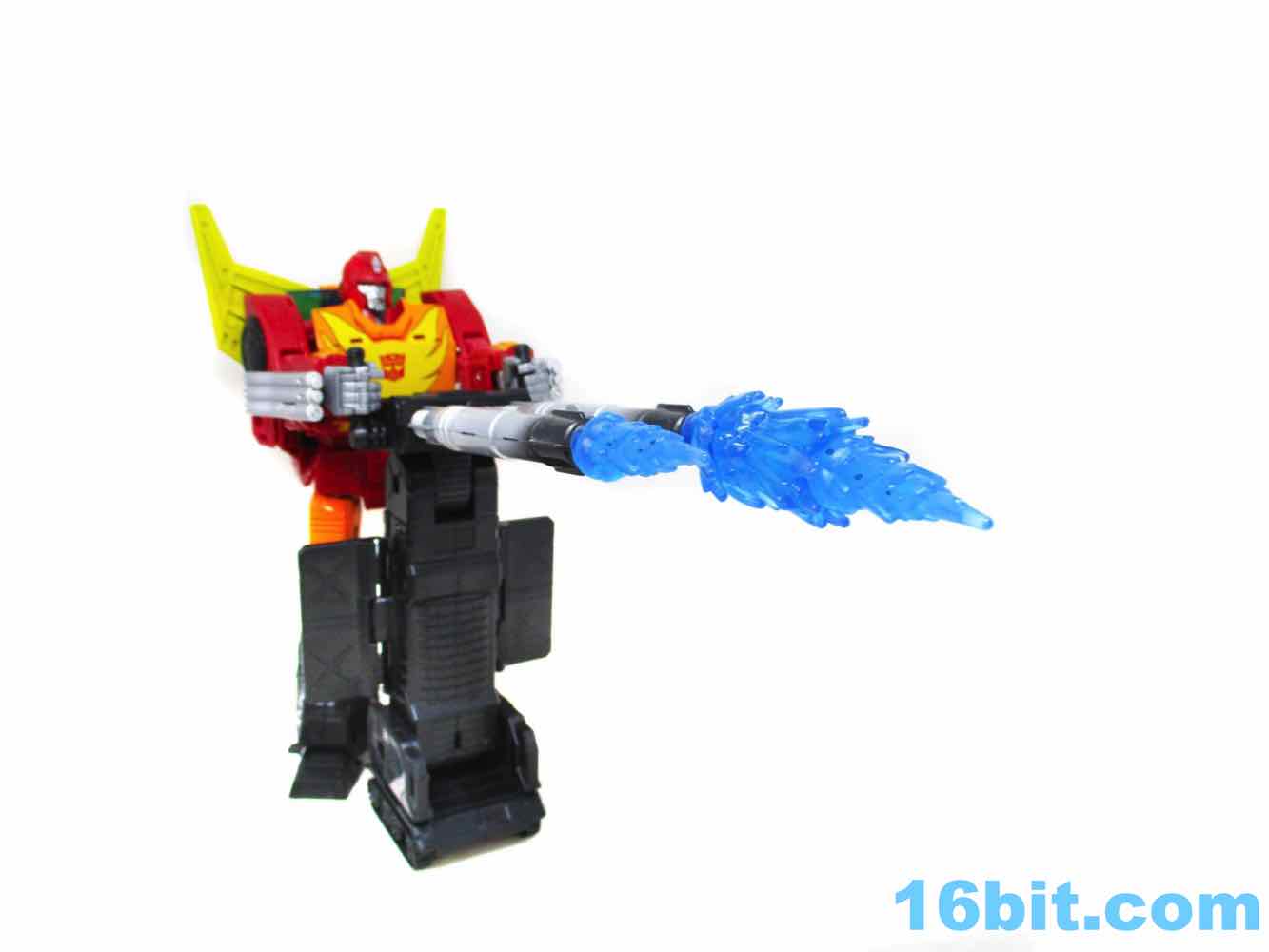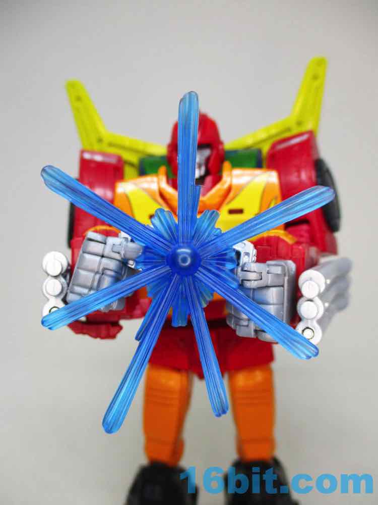 There are few obtrusive C.O.M.B.A.T. pegs on this toy, but you'll see some on his wrist blasters, the Photon Eliminator's got one, and so forth. There are also numerous blue blast effects from Omega Supreme, plus some new smoke ones you can use in car or robot modes.