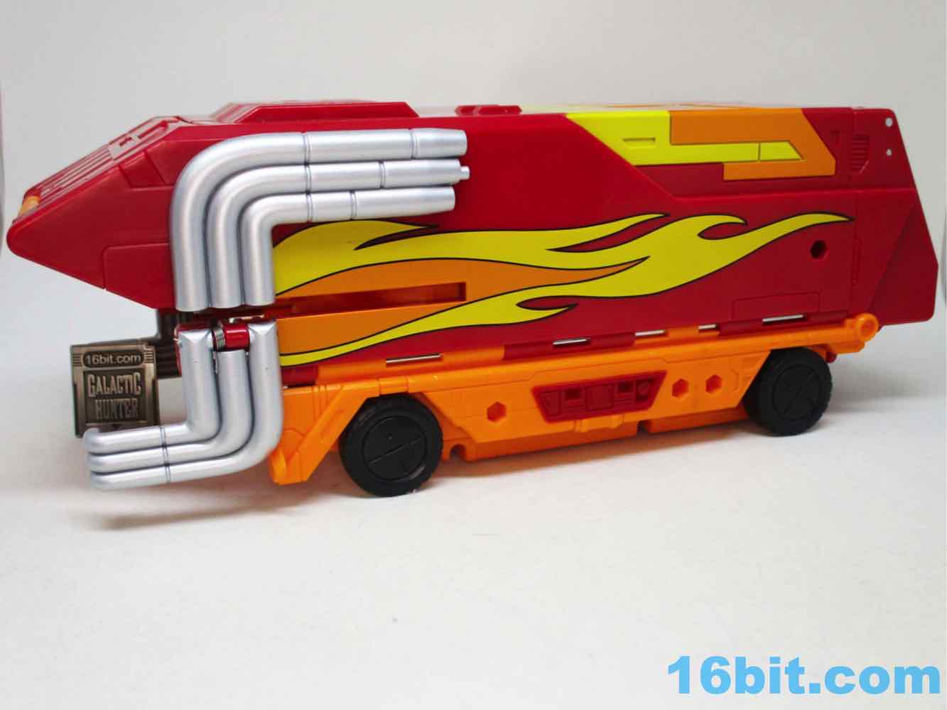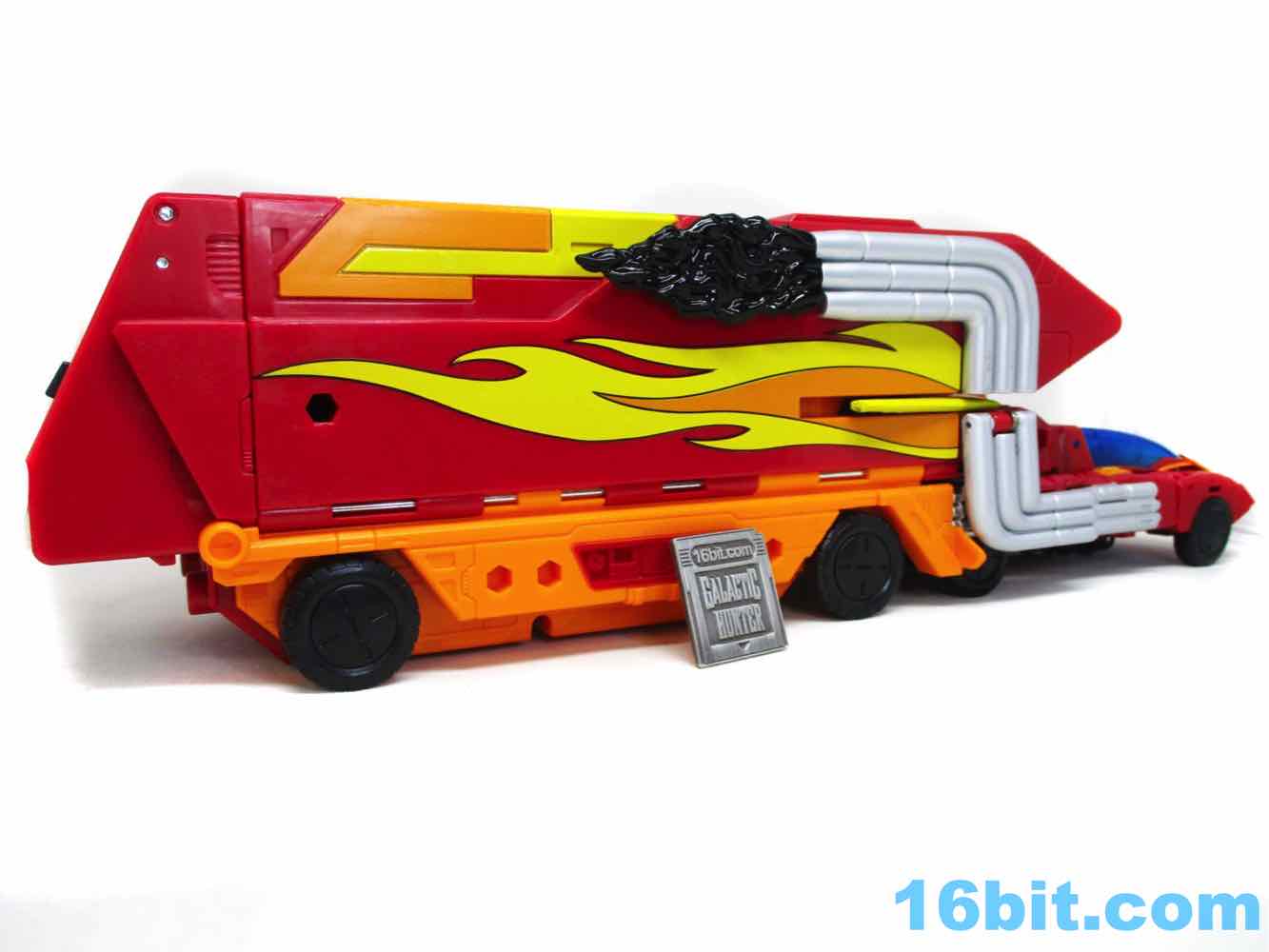 Transformation isn't too tough, and you get a sportscar cab that connects to the trailer. I didn't love this - the original toy dropped the back chunk of the car in order to better fit under the trailer, and I preferred that. The original toy also closed better. But hey, this is big, there are spring-loaded pipes, you can attach exhaust fumes to the chrome pipes, and the wheels are pretty nice too. There are no stickers to apply and just the trailer alone is as big - and seemingly as feature-laden - as a $50 Playmobil Volkswagen Mini Bus. As much as I want to complain about the price, the amount of moving parts and the size of the toy are comparable to or better than a lot of the competition. He's just not super tall.
