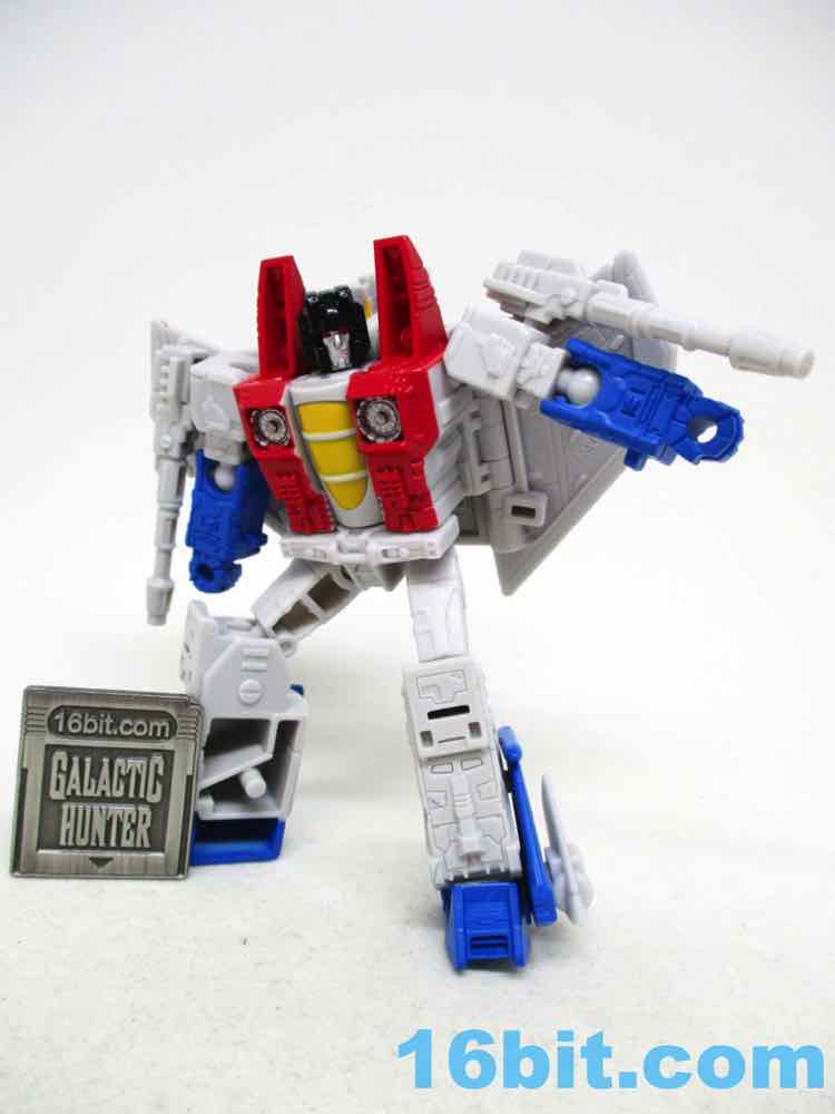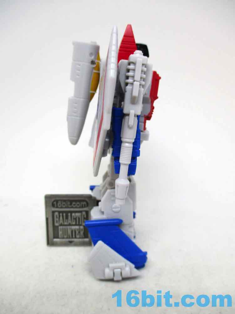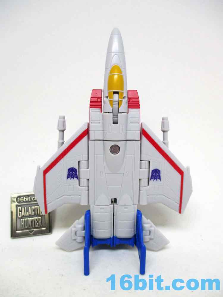While not as big as some other smaller Starscreams, he is a lot more colorful with a painted orange cockpit, some bright blue on his fists and boots, and a lovely slathering of evenly-applied red. The Decepticon markings aren't visible in robot mode, but somehow even more sadly, his SKU is - the wing has F0665 stamped on it, rather than putting it out of sight like under a foot or on the inner leg. This kind of thing is pretty ugly and when Hasbro really started doing it heavily 12 years ago, it was an eyeroll - some figures had it on the front of the leg. Today it seems like there's no excuse for it, but aside from that this may be one of the most endearing little Starscreams. The robot sculpt is based on the Earthrise Voyager, which was based on the Classics and Universe Deluxe, so it will no doubt seem very familiar. The blasters plug in to the fists or shoulders, and it's a perfectly nice little robot.