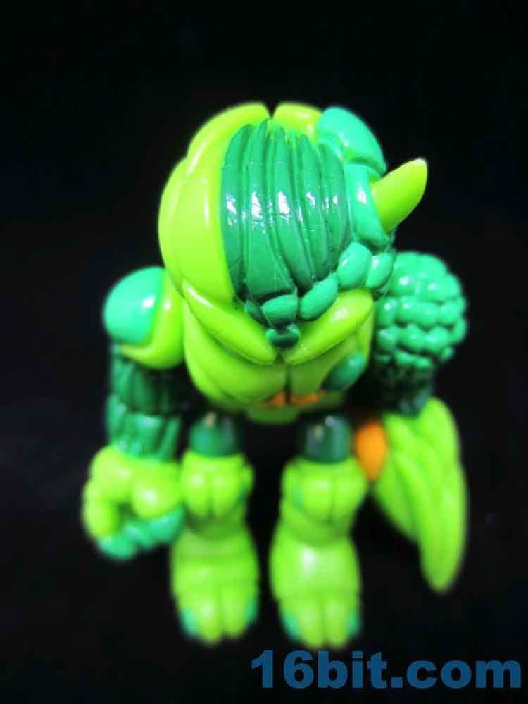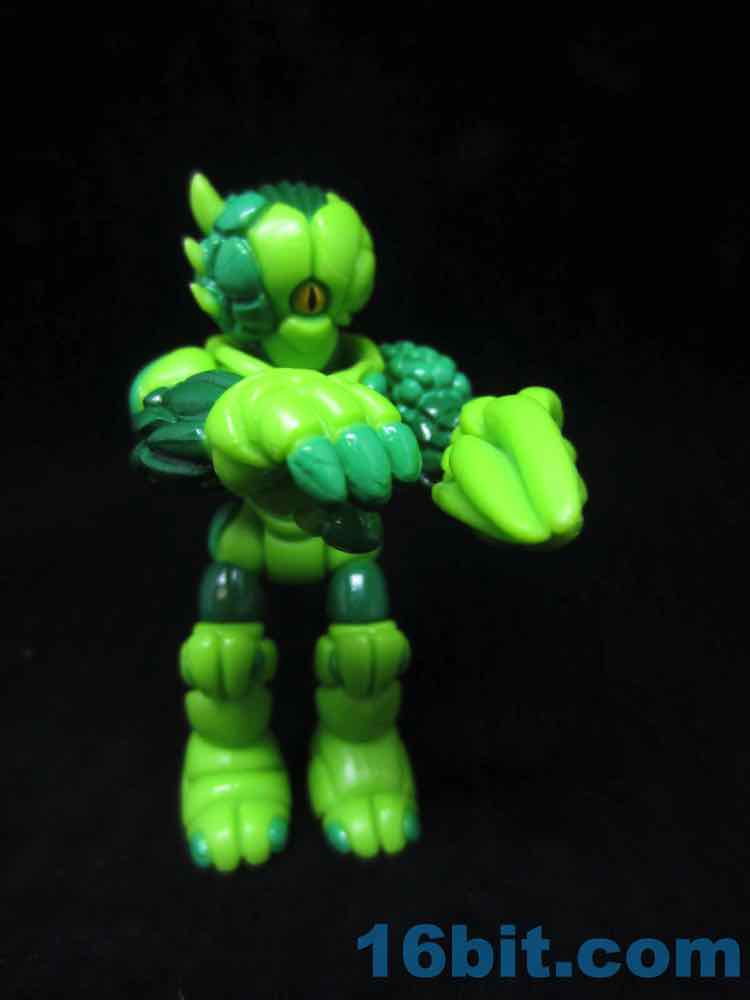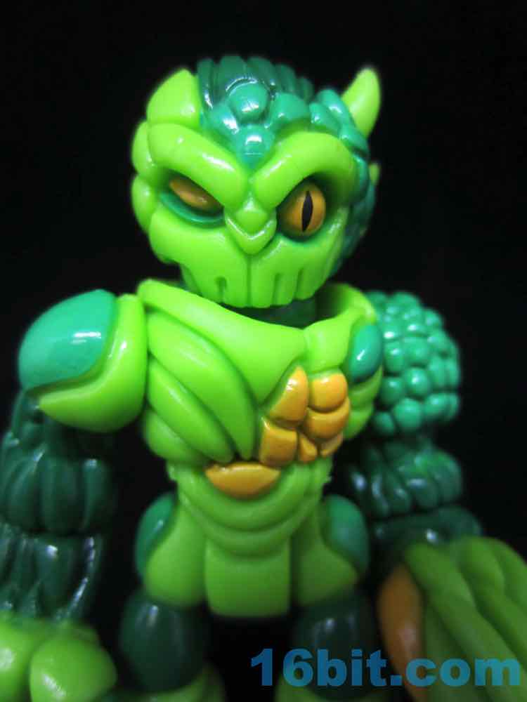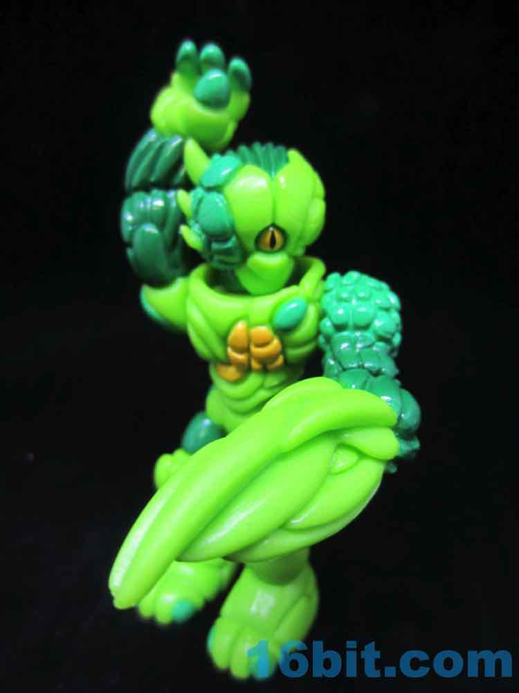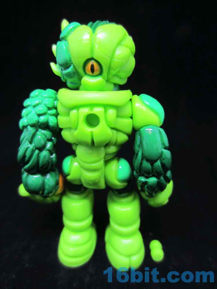 Cast in green, this lumpy little looker was given two shades of green paint as well as some yellow and black highlights. With 12 points of articulation, his build is pretty similar to Pheyden - swivel wrists, swivel ankles and knees, rotating shoulders and hips, and so on. The head and waist turn nicely, too. The figure is sized to fit with your other Onell Design things, but also Playmobil and Imaginext figures.
