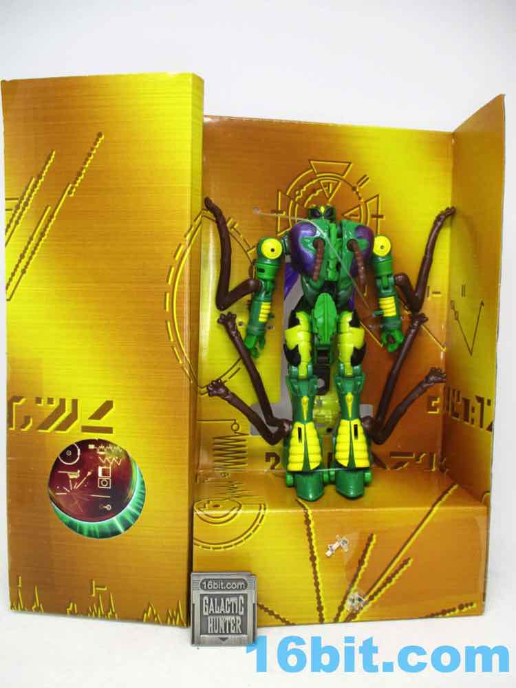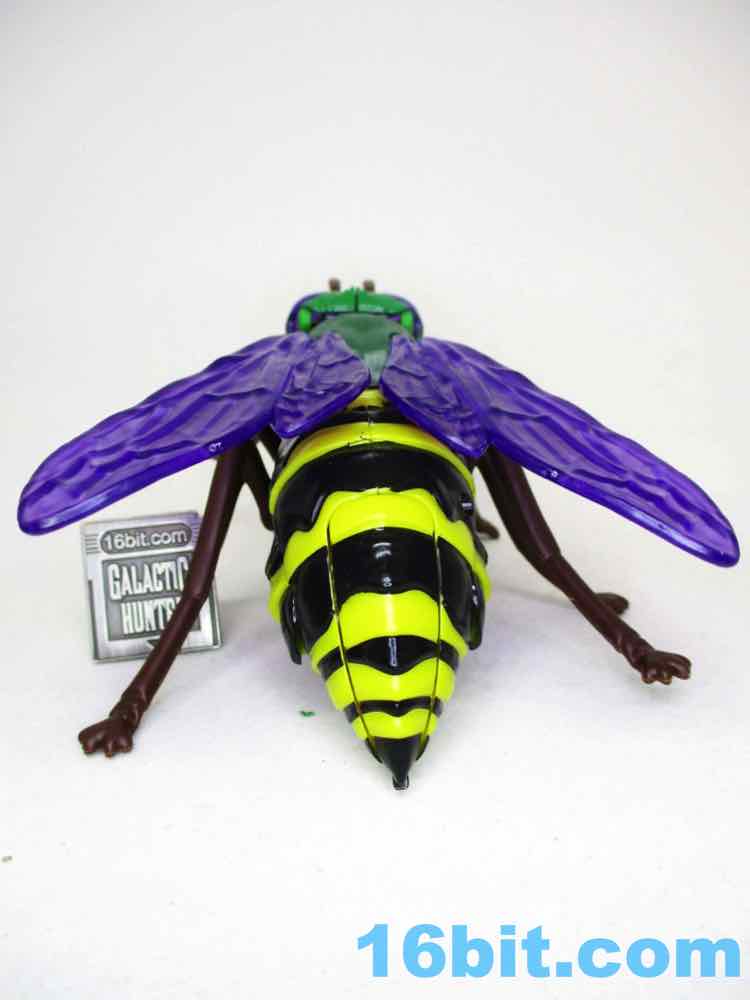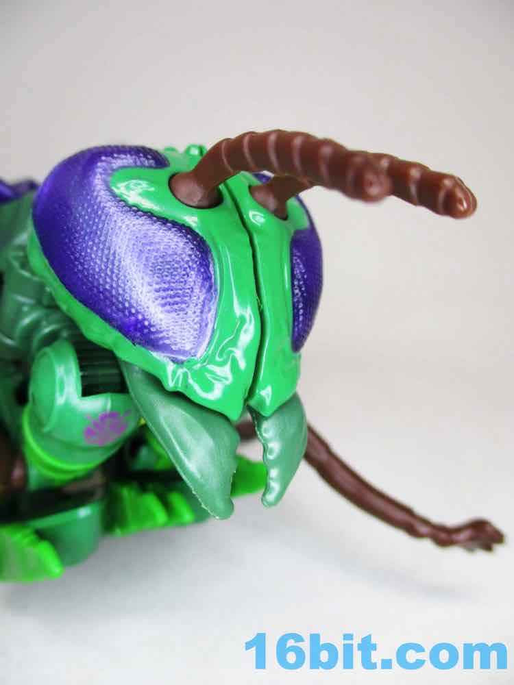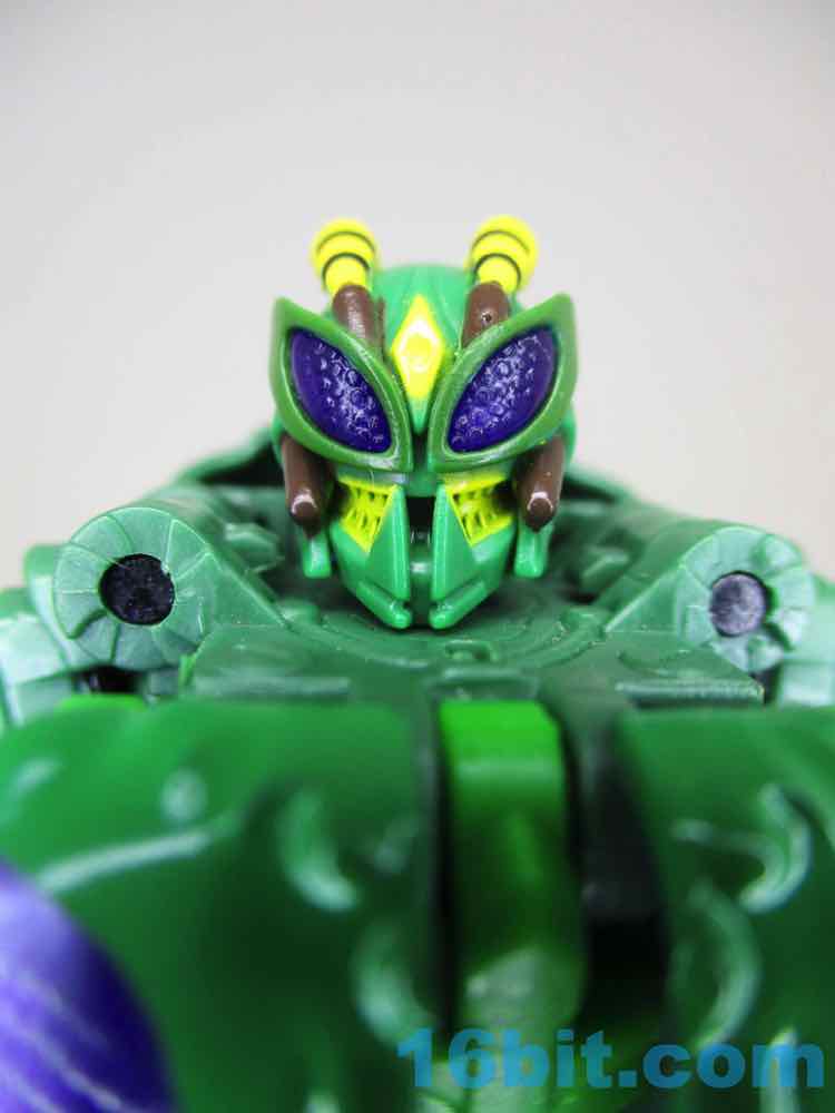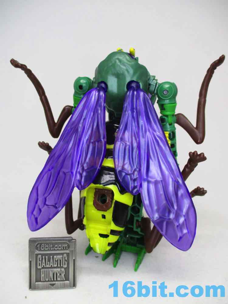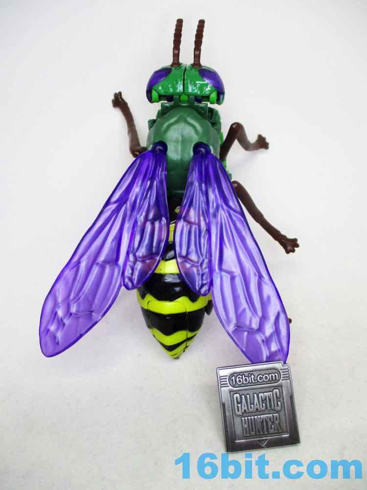 The bug mode is a bit chunky, with black and yellow on the back and purple wings instead of gray. It's arguably better than the show model in terms of being vibrant, but it's not necessarily accurate and there are robot shoulders clearly visible under the now-articulated but head. Also, robot legs under the bug legs. I don't know where else the mass might go - these things are generally designed to favor the robots, but at least you get an acceptable insect form as a bonus.