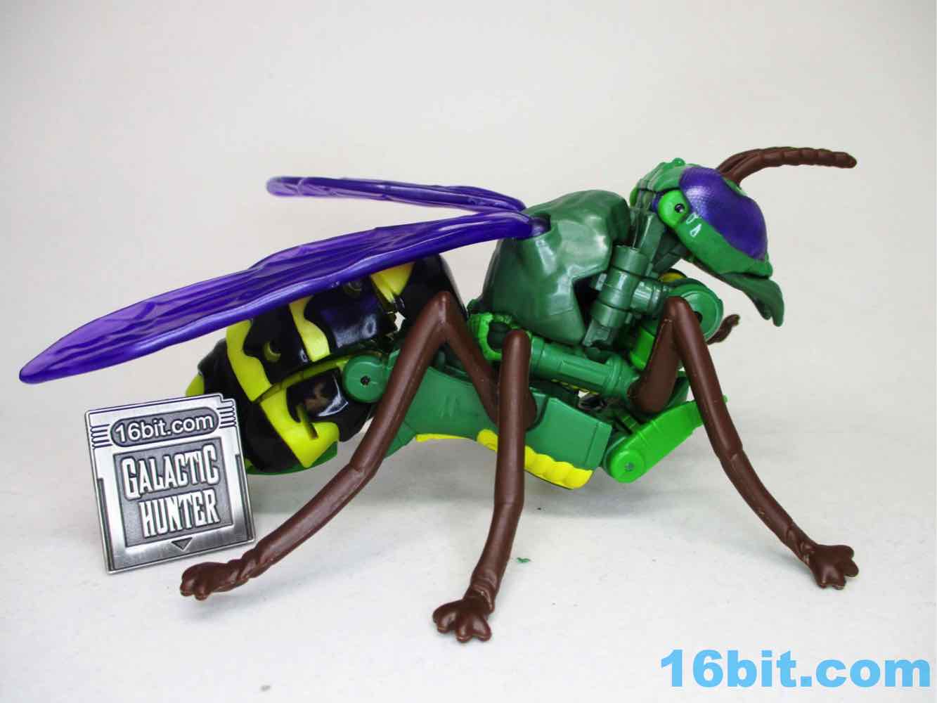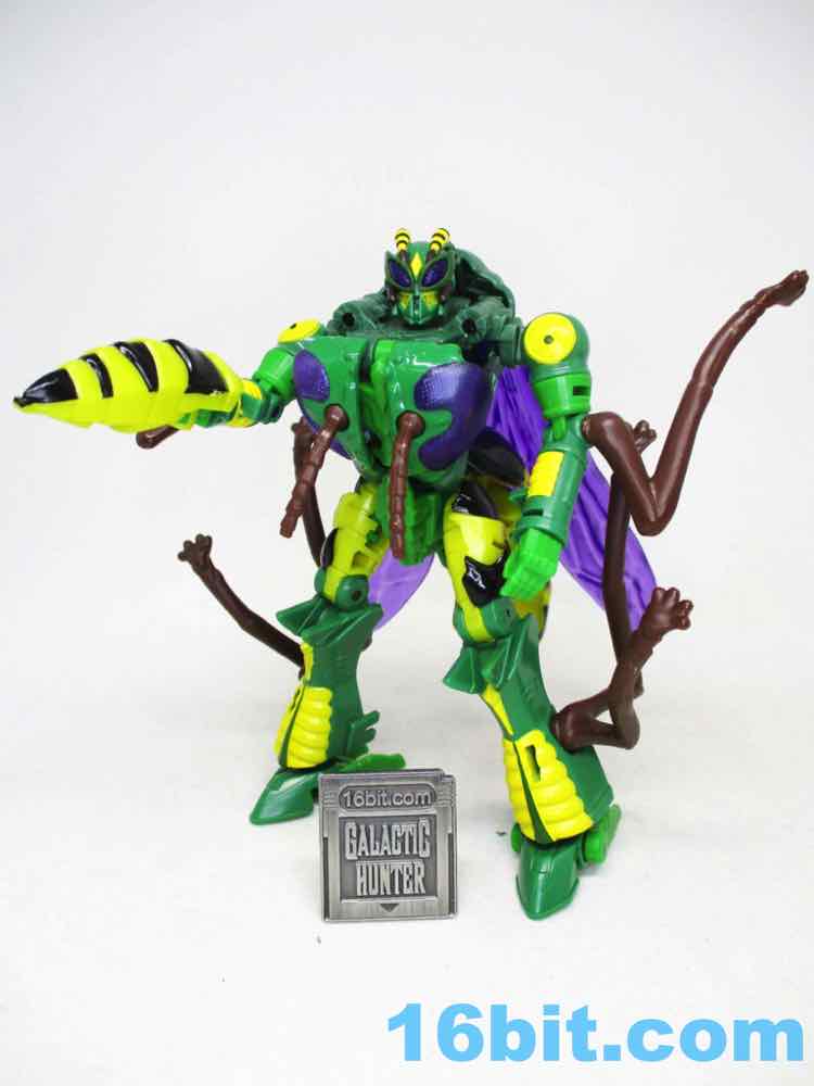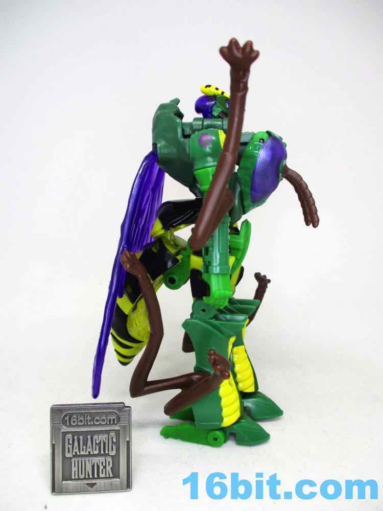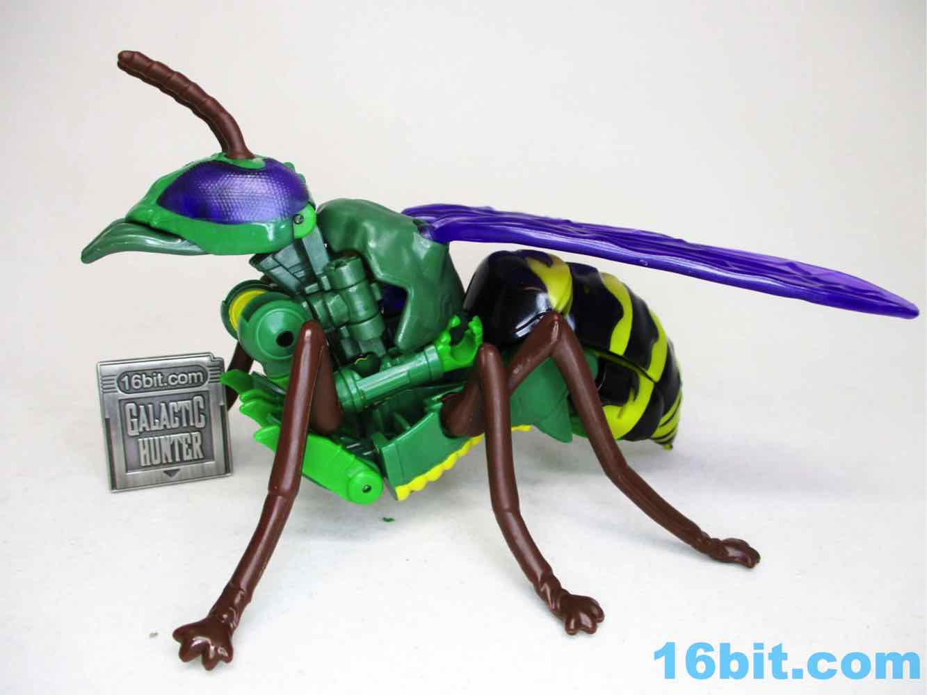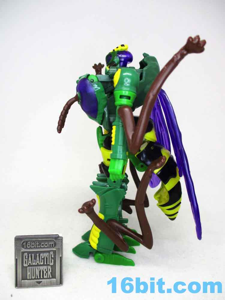 I liked the toy right out of the box - and when I transformed him into wasp mode and back to robot, I stopped liking him. The reason for this is that there are a ton of parts that need to be tabbed in exactly, and it's not a forgiving toy - if you don't put every tab and slot in its home, you get a flopy mess. If you succeed, you get a nicely decorated robot with purple wings, colorful purple eyes, and about 22 meaningful points of articulation. It's not a huge improvement over the range of motion of previous toys, but you get things like rocker ankles and I keep being told those matter. (Counterpoint: the 1996 Waspinator had firing rocket launchers and was $10, and was similarly sized.)