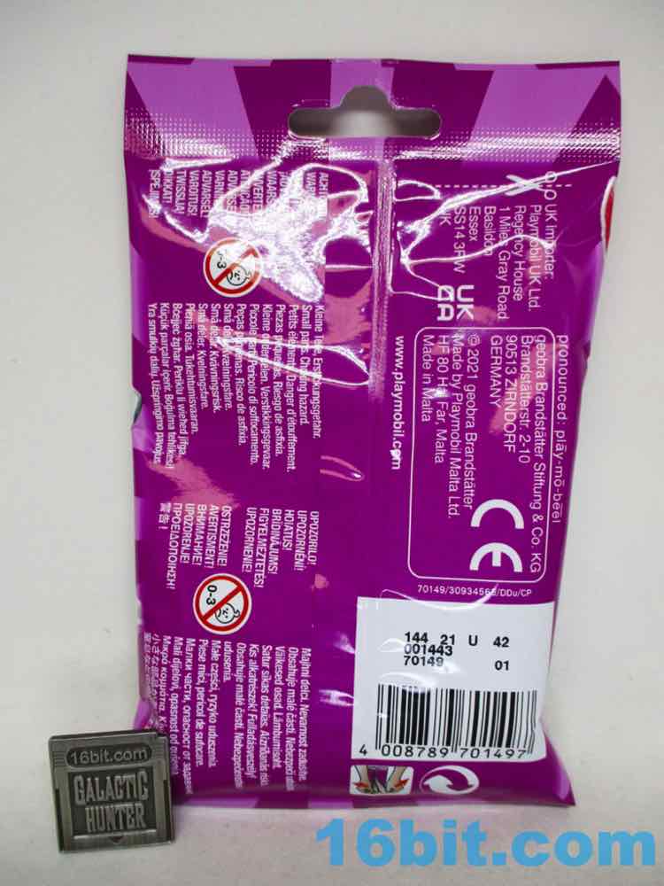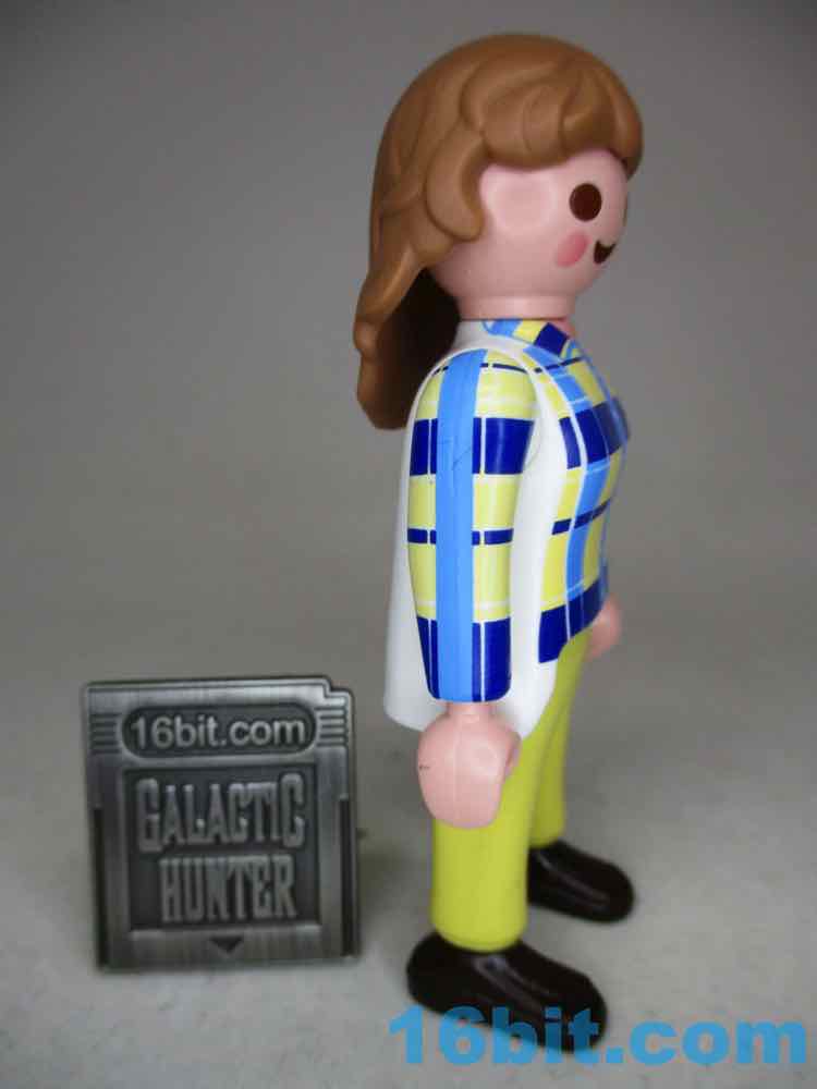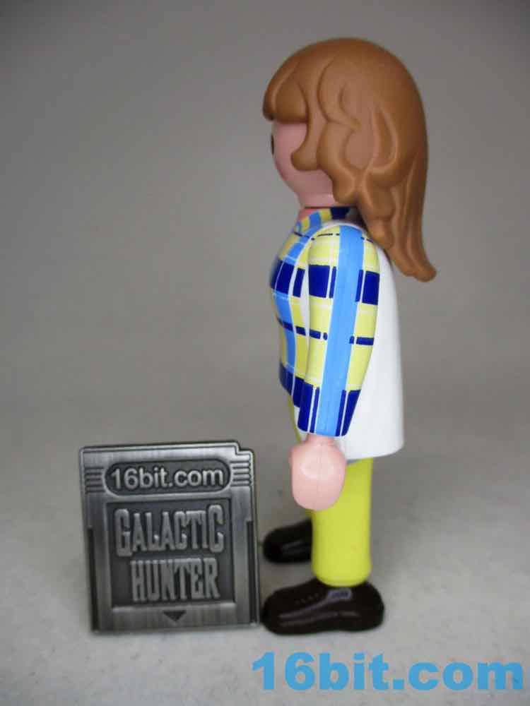 The long, light brown hair sits atop a relatively run-of-the-mill head with red cheeks and an otherwise traditional, plain Playmobil head. No painted eyes or mouth here! The front of the shirt is painted in blues and yellow, with stripes and buttons on the front and stripes (no buttons) on the sleeves. The back is, sadly, blank white - Playmobil tends to be inconsistent about what backs get painted, precious few do.