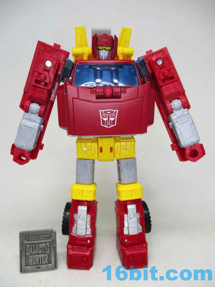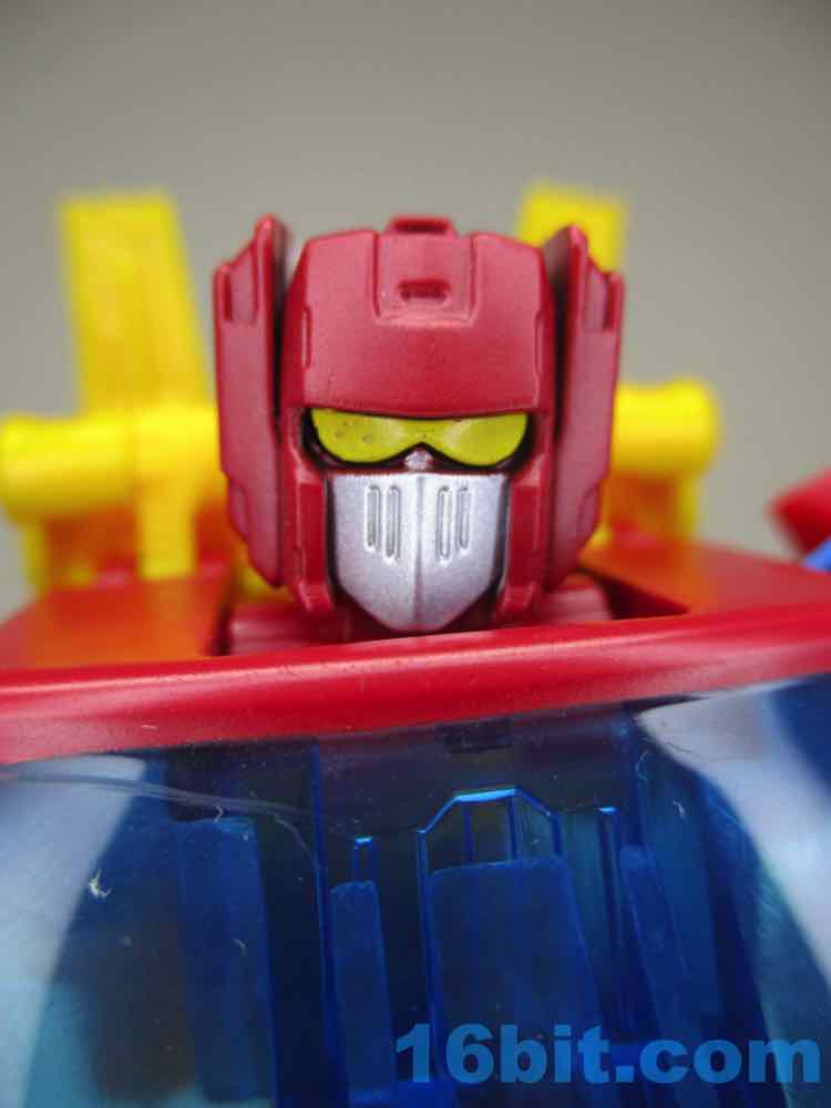 His hand-held blaster weapon looks like a hand, and it's painted silver but molded in yellow. You can mount a C.O.M.B.A.T. effect in the barrel if you like. You can rotate the wings on his back, and the light array can move too. Articulation on the robot is pretty good, with about 24 meaningful joints including double-knees and kind of weird lateral arm movement. There's a lot to like here, but the wing kibble - true to the 1980s toy - is something I'm just not fond of at all. But you can't fault them for not trying to be authentic. The head sculpt matches Hoist, which largely borrows from the animation model. It's pretty good.