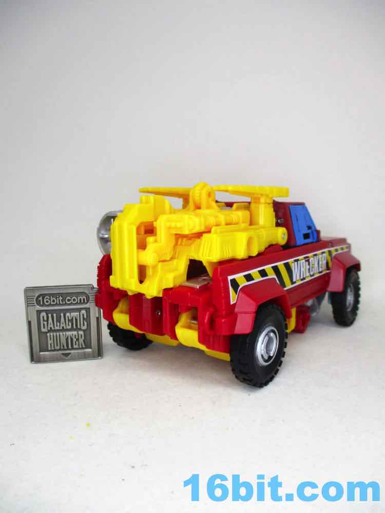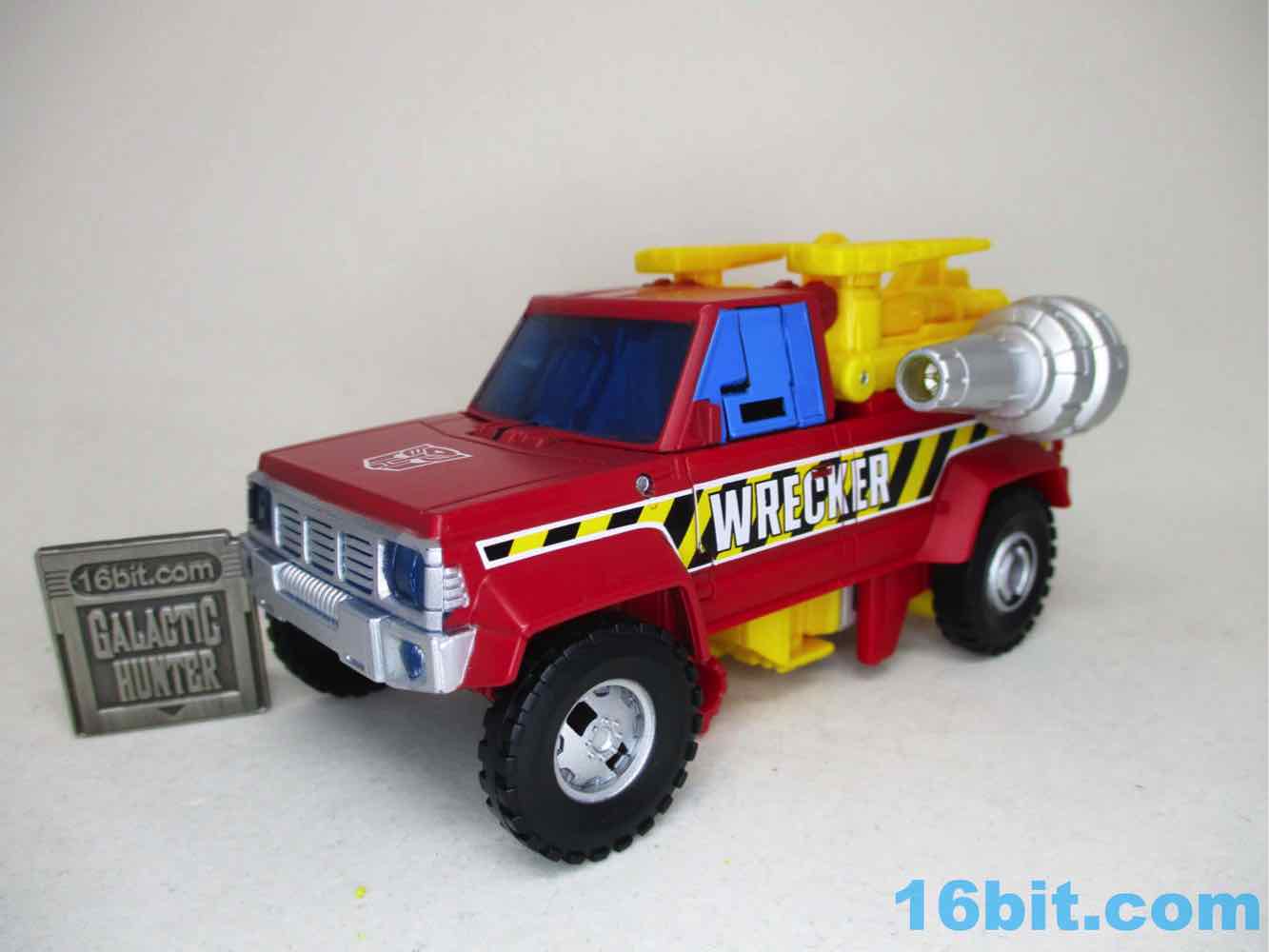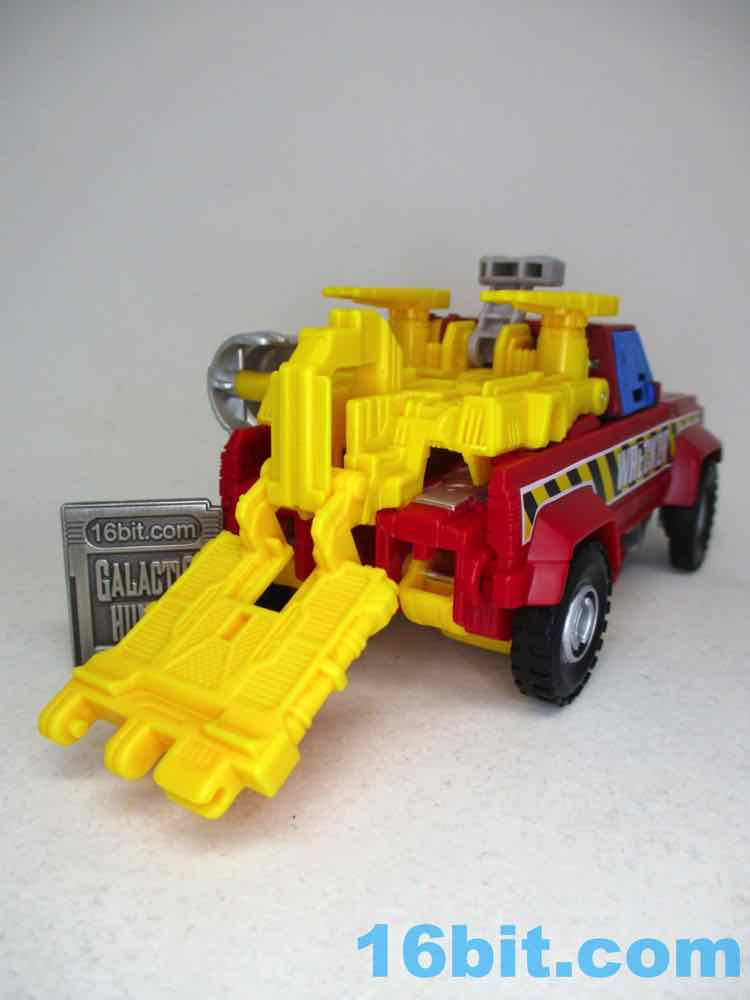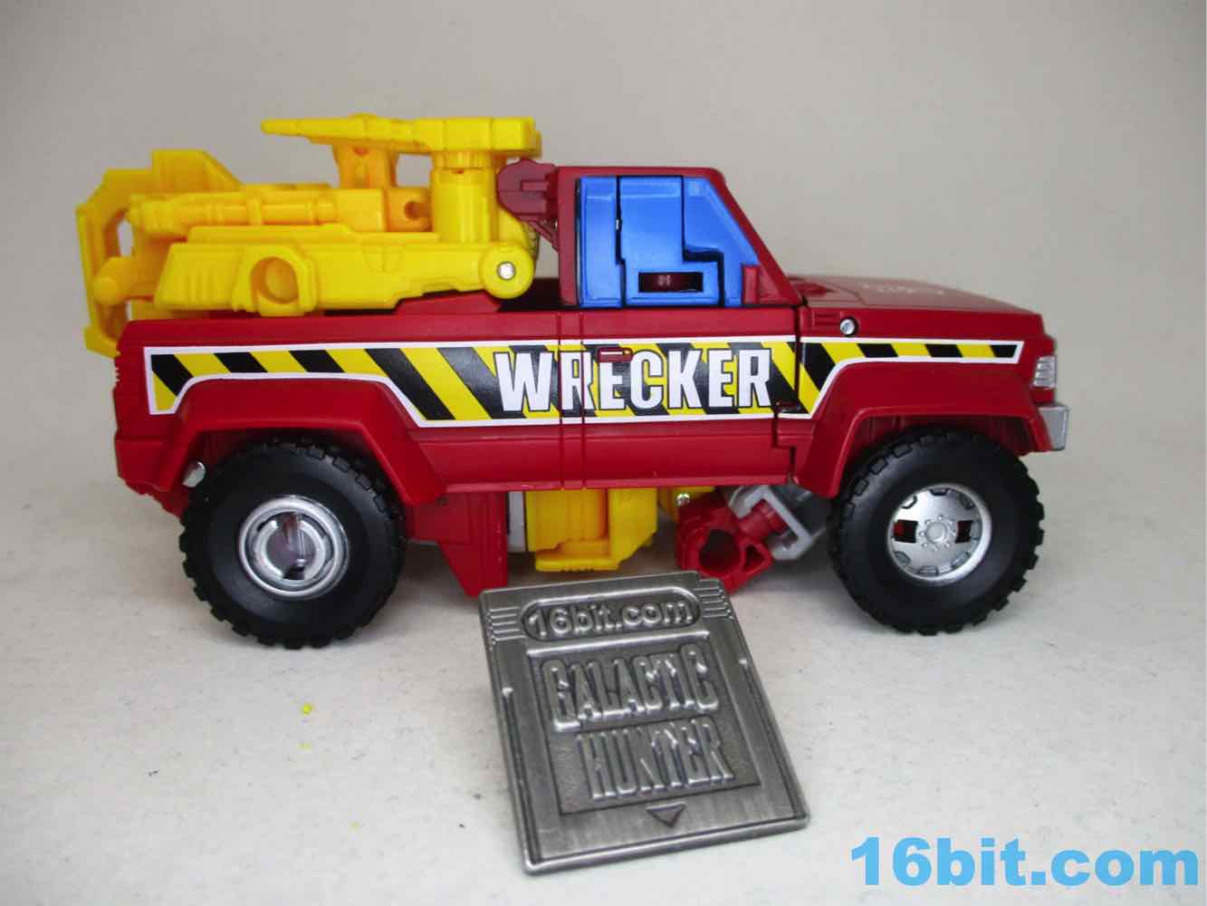 Transformation is much like Hoist and Trailbreaker, and I suggest consulting the instructions. A lot of parts snap into place with "am I going to break this?" level force, with tabs and slots having tolerances that are incredibly tight. It's sturdy in both modes, but you want to be sure you're doing it right. The truck drags the robot knuckles along the ground, which isn't really a good look and it's not terribly good for the "driving around" function either. But it's a nice truck - it looks exactly as it should for a Hoist repaint, I love the "WRECKER" markings, and the colors are nice. You can mount his blaster on the side, and there's a ramp you can pull down to connect to bases. Why would you want to do this? I have no idea. I don't want to do this, but it's there.