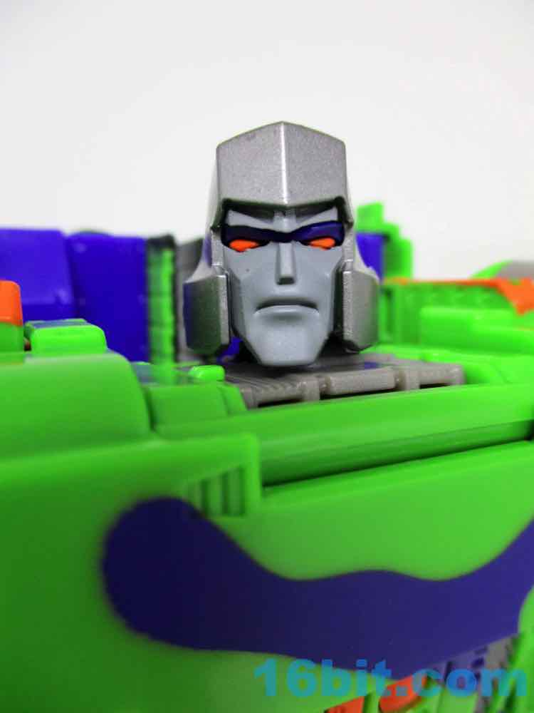 The robot has all the same functionality of previous releases - meaning no swivel wrists, but decent and sturdy joints for the same poses you've done before. The question now is if you want a new color - if you've had it with gray, the bluish face, orange "camo," and green plastic make for a much more striking presence. It may not scream out "Megatron" to most fans, but to certain fans - the right fans - it's perfect.