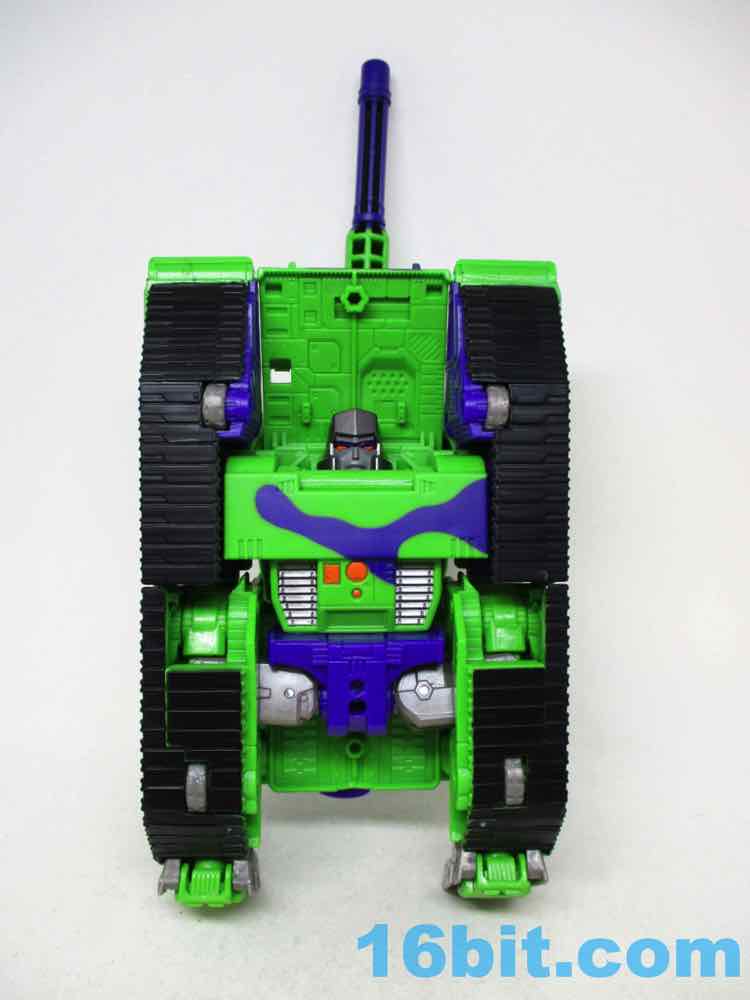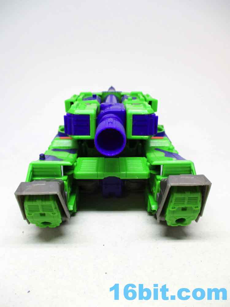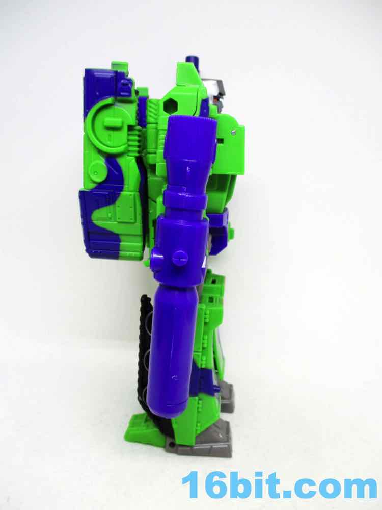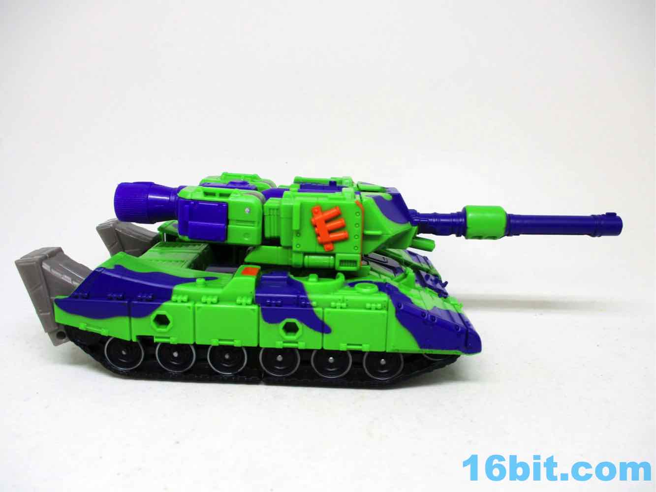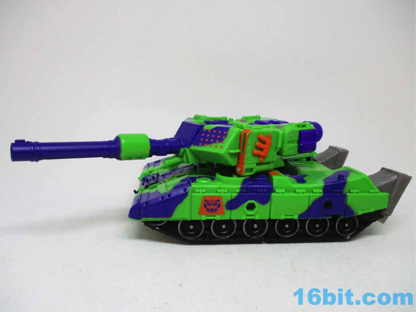 Provided you don't have the original, it's a fine substitute - until they do another one, which undoubtedly also be pretty great. I would have loved a G2 Decepticon symbol - or something - visible in robot mode, but a nicely articulated green robot is what you would and should expect from a toy like this. Some more orange would be nice, but again, I'm picking at nits here - what you get is a perfectly good repaint, with some attempt to recreate the original toy's shoulder cannon using the tank turret. It's clever but doesn't work as good as I might have hoped - thank goodness for the original-style fusion cannon!