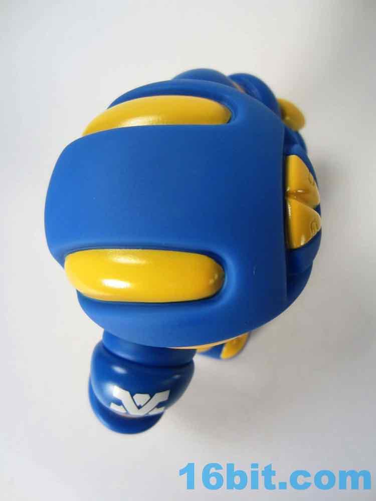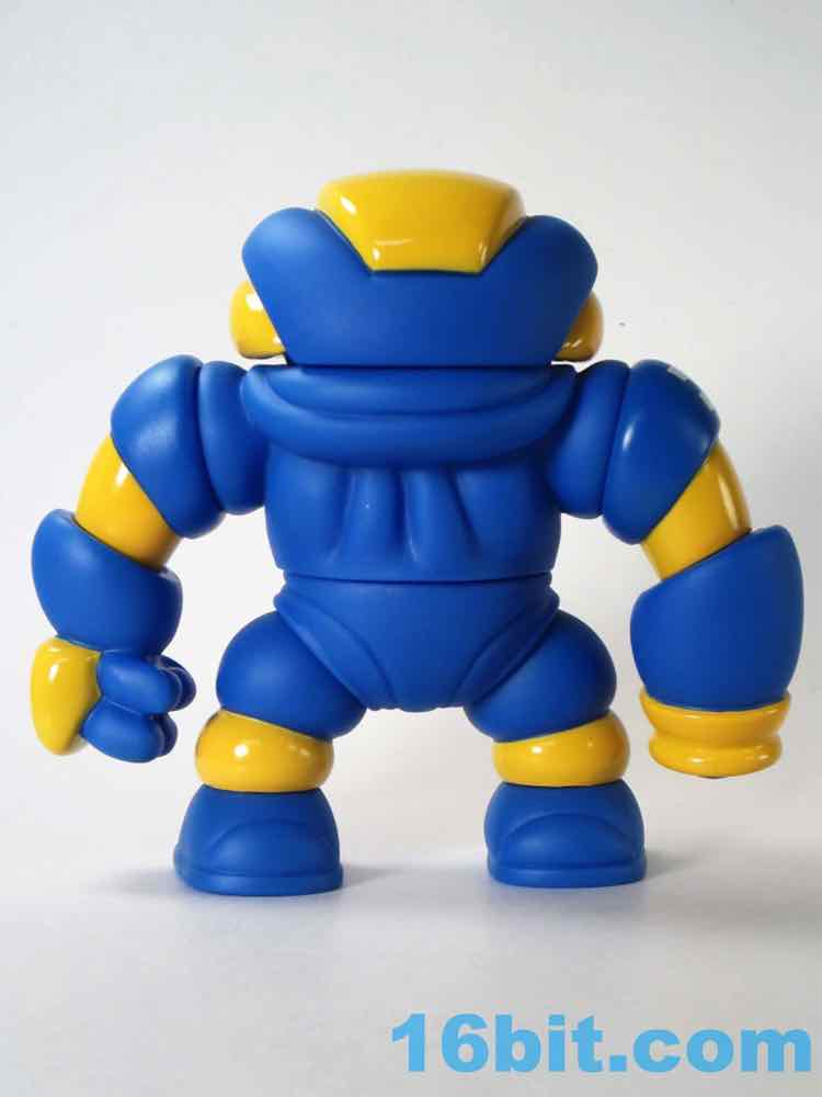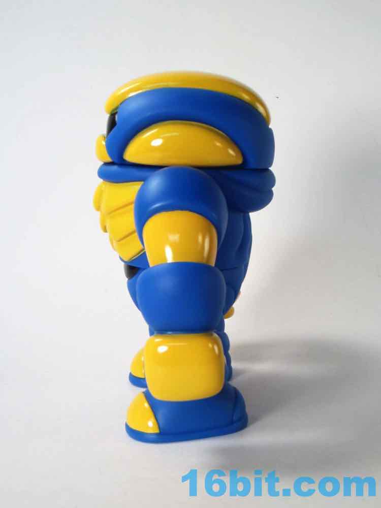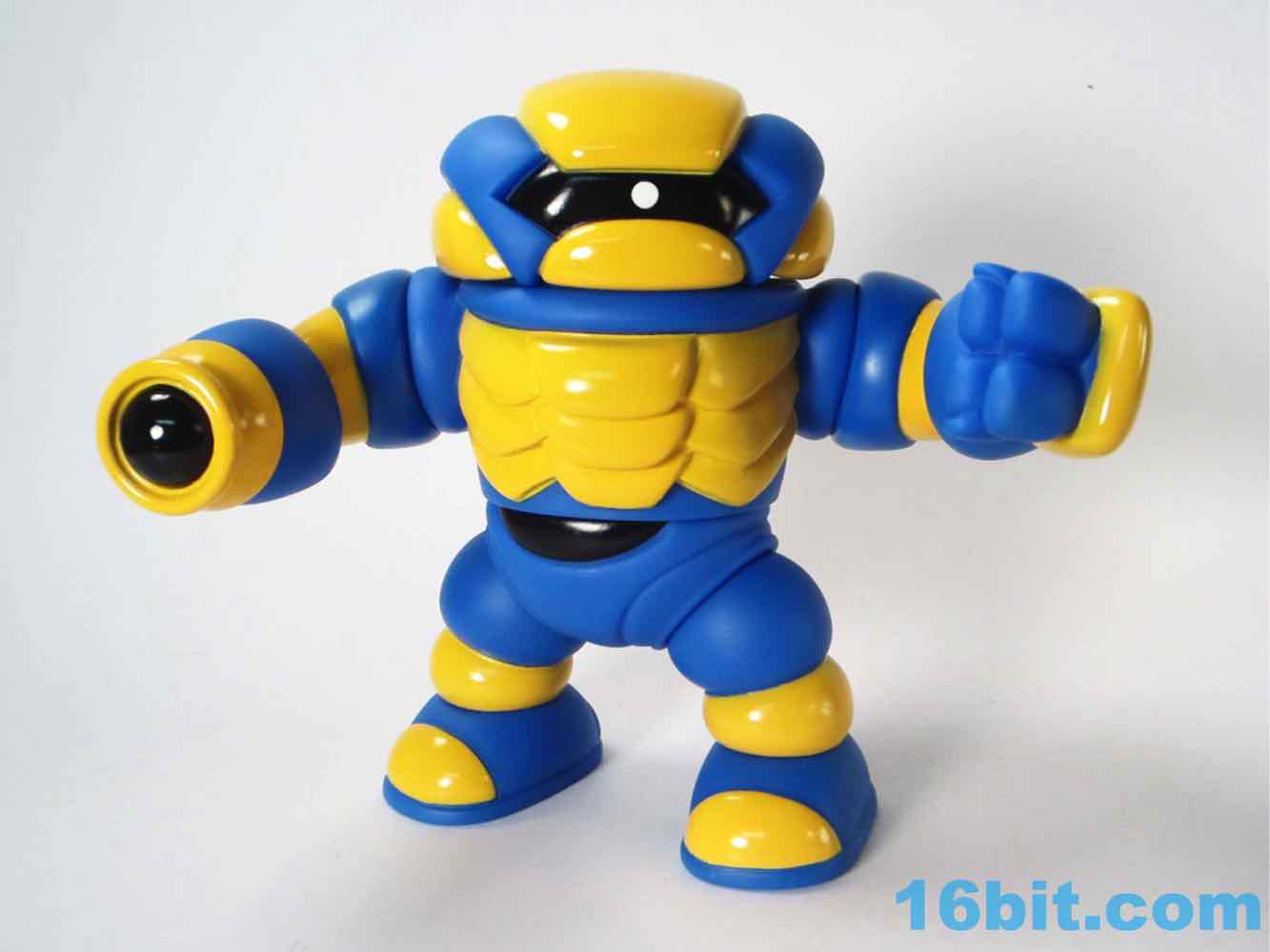 Molded in a bright blue vinyl, this figure is also coated in thick, glossy yellow paint that really looks amazingly good. Most figures get a thin layer of paint - Onell Design coats it so well, they probably undercharged us. Some older 1980s vinyl figures had the color of the plastic peek out, but not this one. It has no painted panel lines, but each yellow segment is vibrant and the big black eye has a white dot in the middle. Glossy black plastic is also used on a belt buckle and the arm cannon. Our hollow plastic friend is made up of 11 pieces that can be popped apart and reassembled. I don't recommend that you do this, as they're hard to get apart and even harder to get back together. You'll probably want to make sure the figure is heated a bit before you do this, so maybe just don't do it.