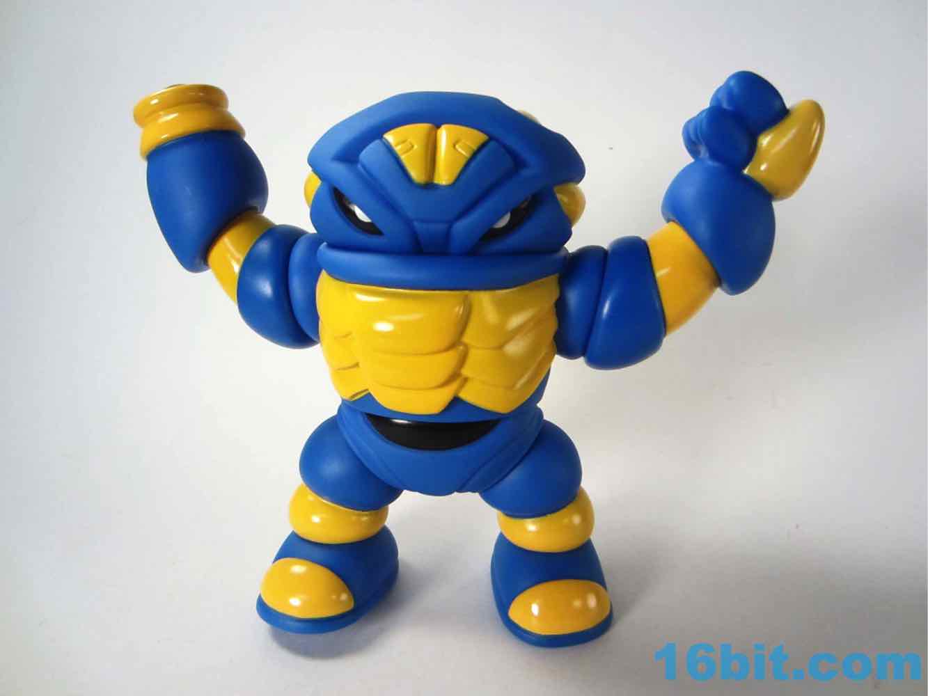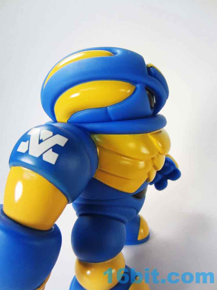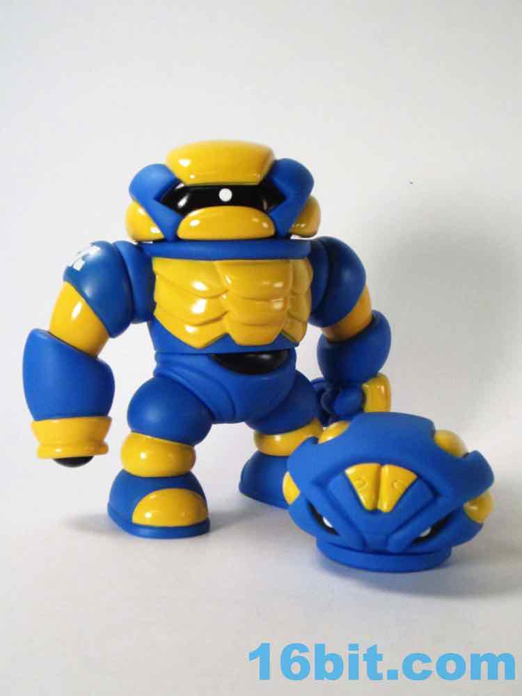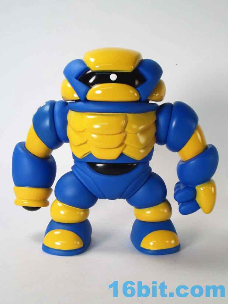 Molded in a bright blue vinyl, this figure is also coated in thick, glossy yellow paint that really looks amazingly good. Most figures get a thin layer of paint - Onell Design coats it so well, they probably undercharged us. Some older 1980s vinyl figures had the color of the plastic peek out, but not this one. It has no painted panel lines, but each yellow segment is vibrant and the big black eye has a white dot in the middle. Glossy black plastic is also used on a belt buckle and the arm cannon. Our hollow plastic friend is made up of 11 pieces that can be popped apart and reassembled. I don't recommend that you do this, as they're hard to get apart and even harder to get back together. You'll probably want to make sure the figure is heated a bit before you do this, so maybe just don't do it.