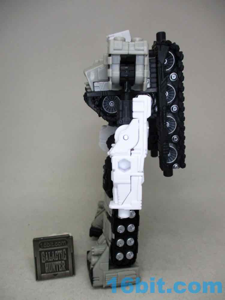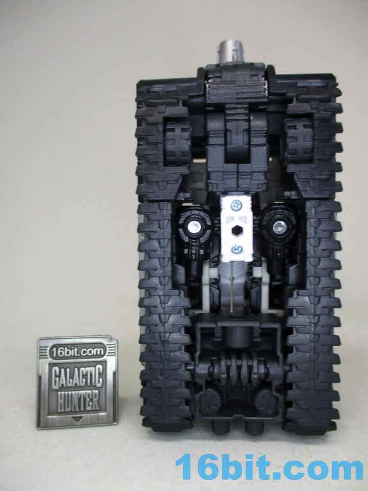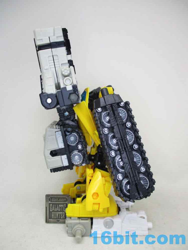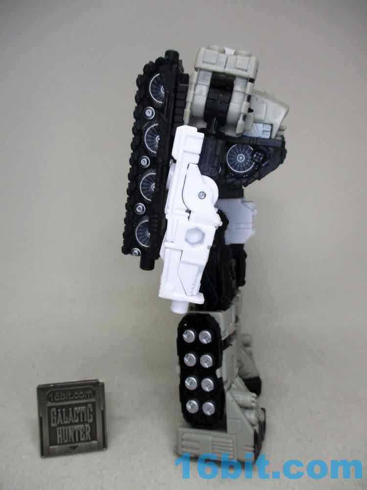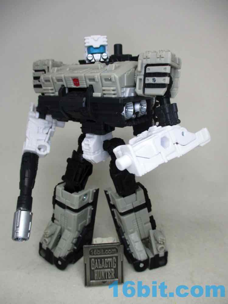 Within seconds of popping him out of the box, the tread backpack popped off and one of the arms came loose when I posed it. This is pretty much what you can expect from Slammer - it's a great looking robot that looks like a buffed-up armored Tailgate, with big blue optics and a face mask. It also reminds me a lot of Rook from Combiner Wars in its blocky silhouette, which I love, and the articulation is just as good as the other figures we've been getting in this line lately. You can even see lots of ample detail here, and a place to mount a blaster barrel on a 5mm peg on a hand. But the waist is wobbly, and the limbs are loose, and parts come off easily when you pick him up to pose it. Most other figures had slightly more friction to help keep them together until you wanted to pop them apart.