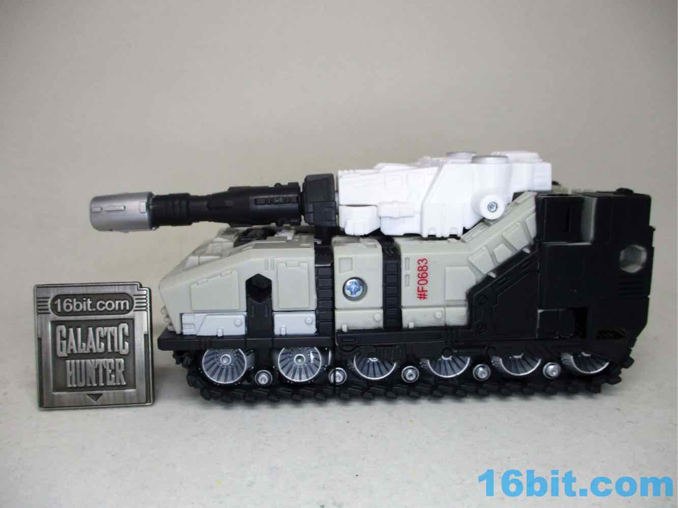 Deco is more ornate than the original, with some nice stripes, silver, and grays and blacks breaking it up. It also has the item's product SKU stamped in red, right on the side, where it's plainly visible in tank mode. I hate that. Hasbro has had a lot of weird factory issues with ugly date stamps and SKUs marring an otherwise attractive toy, and I'd love for it to stop. Beyond that, it's a very nice looking little tank... but Warpath is a much better Kingdom tank toy.