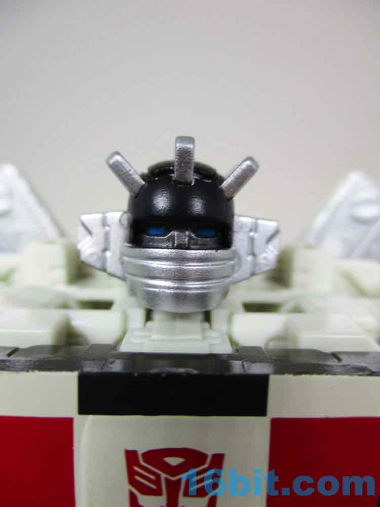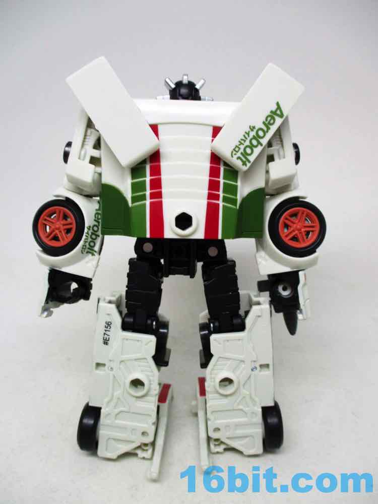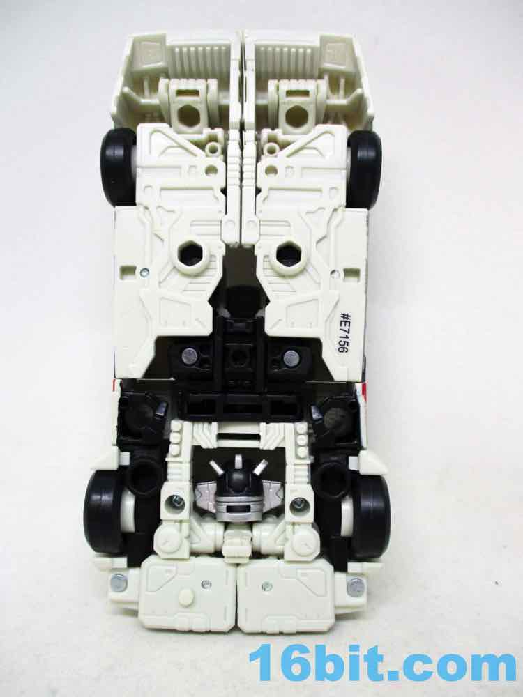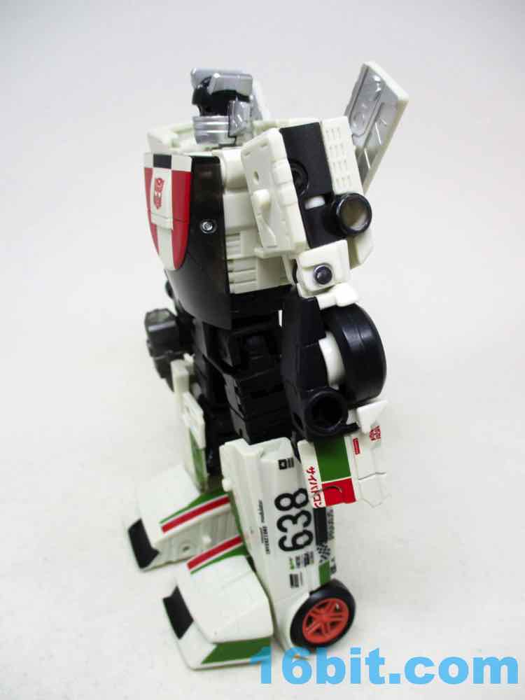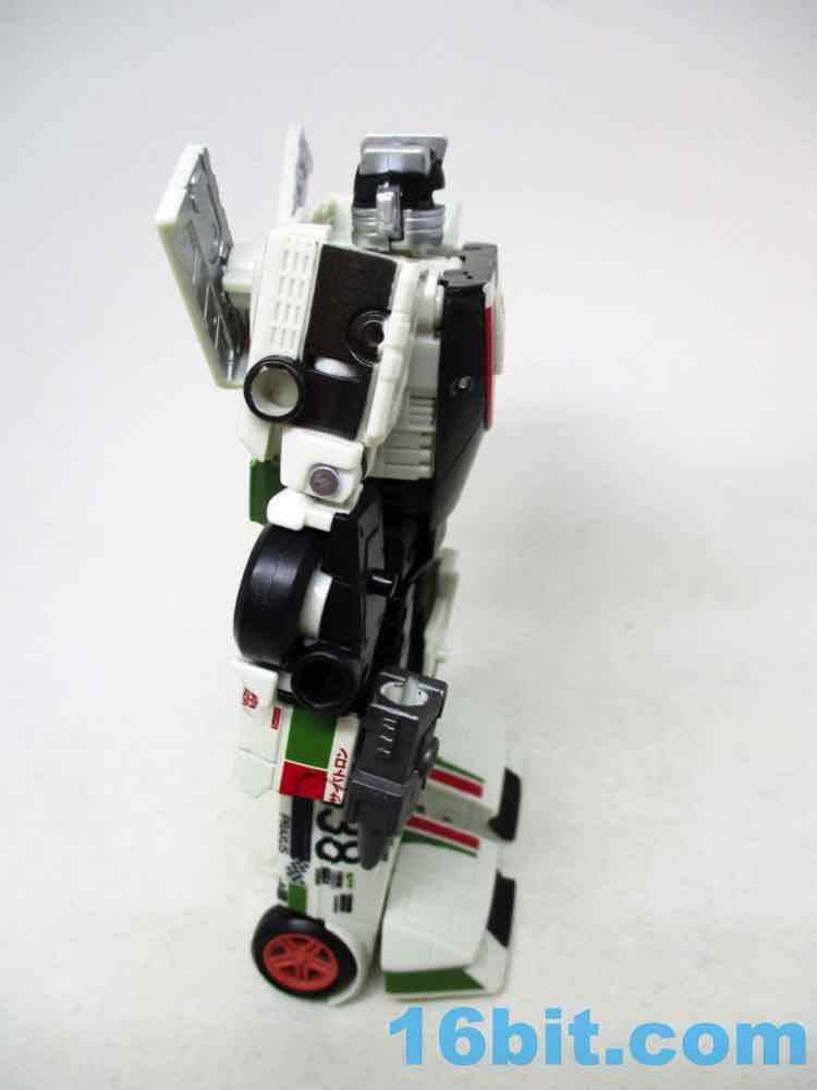 Packed in robot mode, the 5-inch figure is more or less exactly what you'd want. He's off-white, so hopefully he won't yellow much over time. He's got about 26 points of articulation with swivel wrists, rocker ankles, and a lot of other twisty parts in the arms and legs. Most of these exist just for the purposes of transformation, but it also makes the robot a lot of fun. It's not a perfect translation of the original toy or cartoon, but it's Wheeljack-esque. The head has the mask and ears, the colors are pretty close, and it doesn't trod on the very specific copyrighted car on which the original was based. He still has blue eyes, but they're somewhat dark since they're recessed in his sockets.