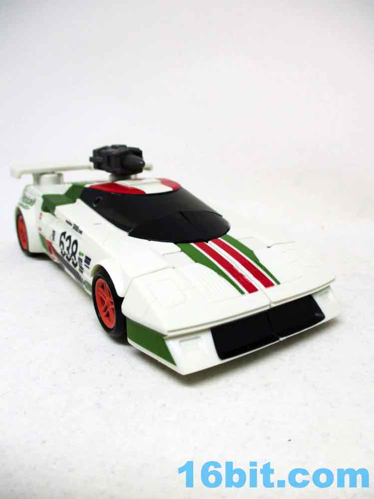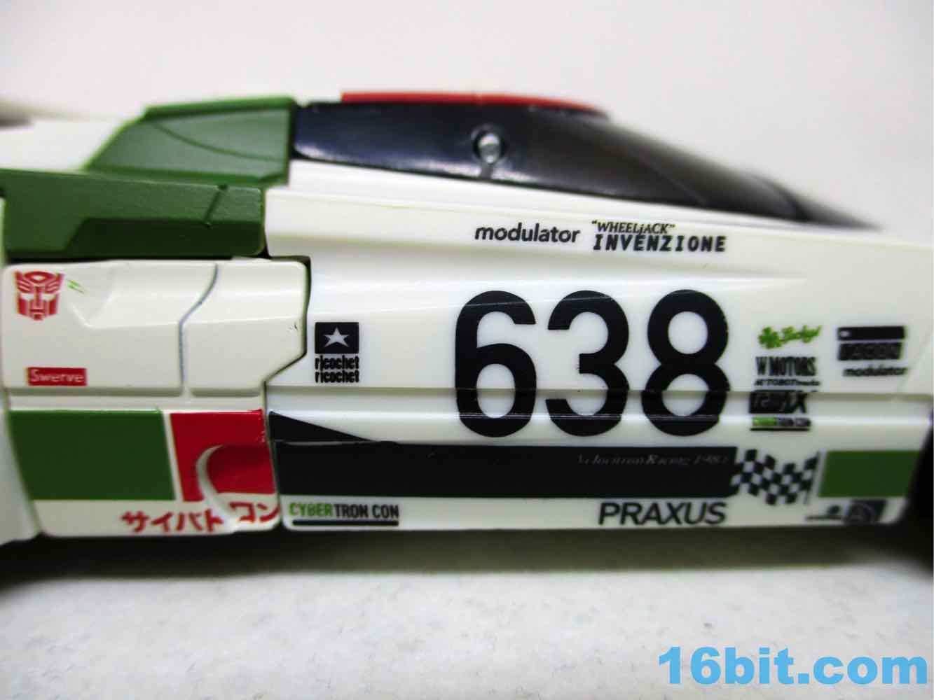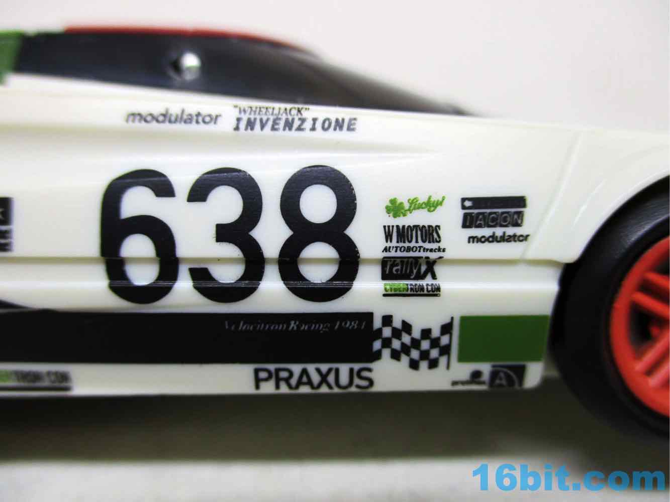 Once you massage it into a car, it's a pretty nice one - the rally marks are great, and so are the fake brand logos all over the car. The teeny-tiny logos are so impossibly small, it's amazing to see just how fine the detail work can get on a mass-produced figure. That or my eyes are bad. Some of the logos are a little hard to focus in on, but you can see "Modulator" and "Invenzione" among others like Cybertron Con, Praxus, Rally X, and goodness knows what else is here that may be an in-joke or something we're all better off not knowing about.