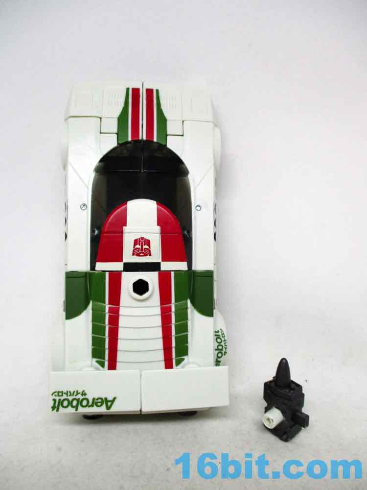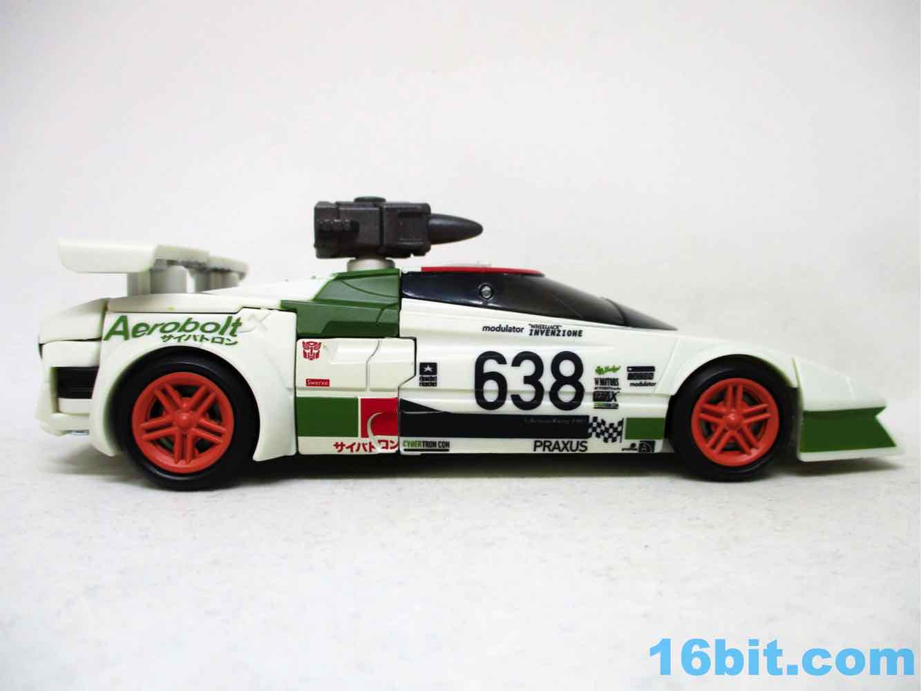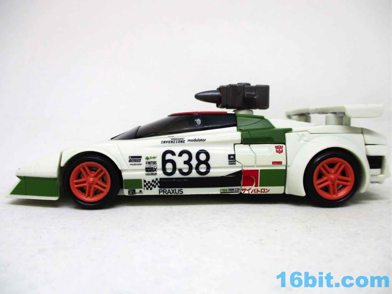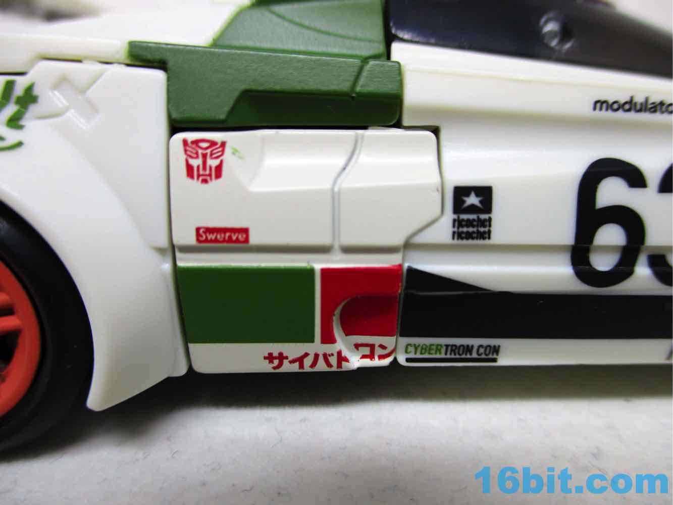 Once you massage it into a car, it's a pretty nice one - the rally marks are great, and so are the fake brand logos all over the car. The teeny-tiny logos are so impossibly small, it's amazing to see just how fine the detail work can get on a mass-produced figure. That or my eyes are bad. Some of the logos are a little hard to focus in on, but you can see "Modulator" and "Invenzione" among others like Cybertron Con, Praxus, Rally X, and goodness knows what else is here that may be an in-joke or something we're all better off not knowing about.