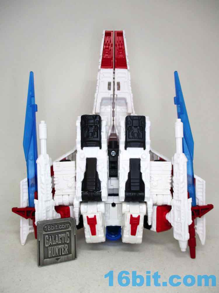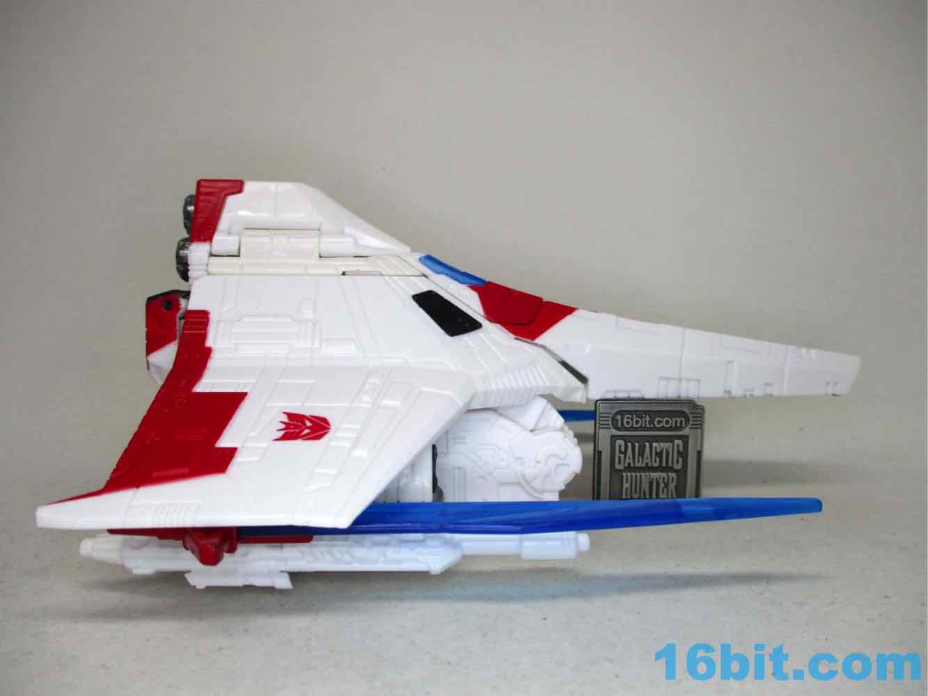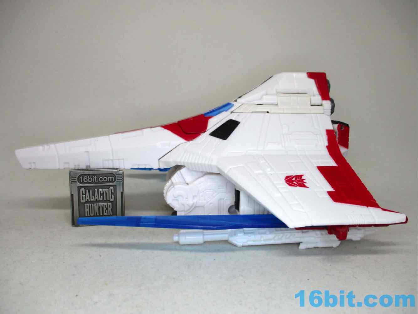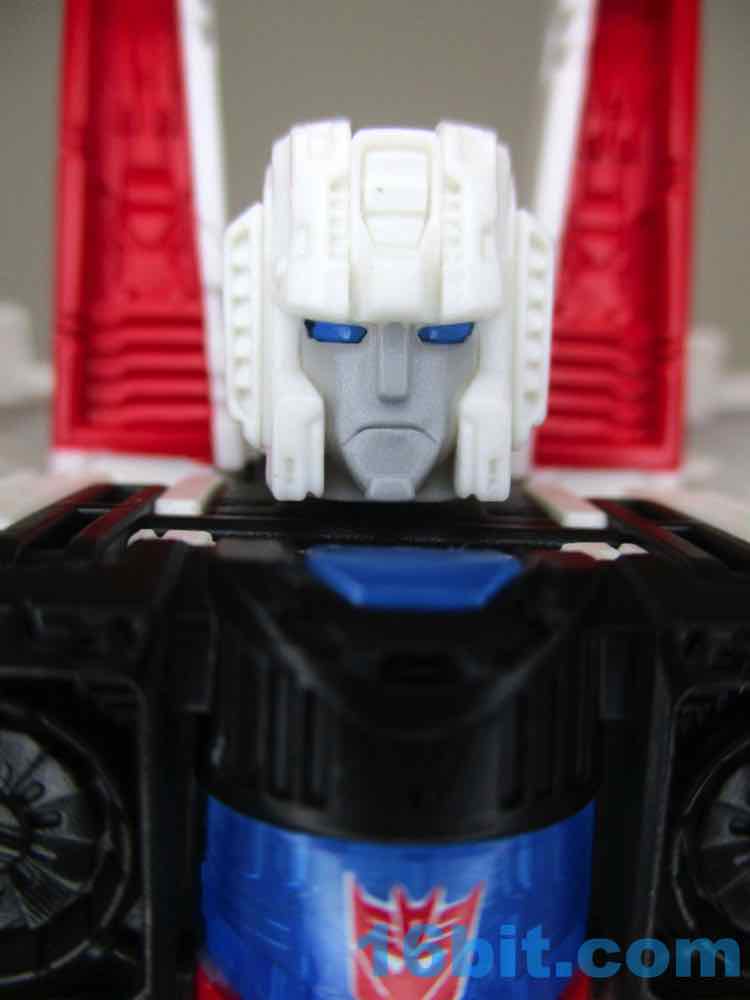 I assume by now you've bought this mold as one of multiple Starscreams - or Thundercracker, Red Wing, Skywarp, Sparkless Seeker, Ion Storm, Acid Storm, Nova Storm, Hotlink, or whoever else - and you know it's pretty good. The bulk of the robot action figure serves as undercarriage junk for a tetrajet/Colonial Viper that takes inspiration from older sci-fi designs, but it more or less something new. Starscream's eyes are light clear blue with an unblocked window on the back so they can sing if you shine light behind them! They're nice. The coloring works better than a lot of the darker light-up eyes we've had over the years, mostly because under bright light they look good and in a dim room, they also look good. Screamer's scowly face is painted light grey with a white plastic helmet, and the bulk of this toy is molded in white or clear blue plastic. Articulation is just as good as always, and the teeny tiny red Decepticon face on the chest is a nice touch.