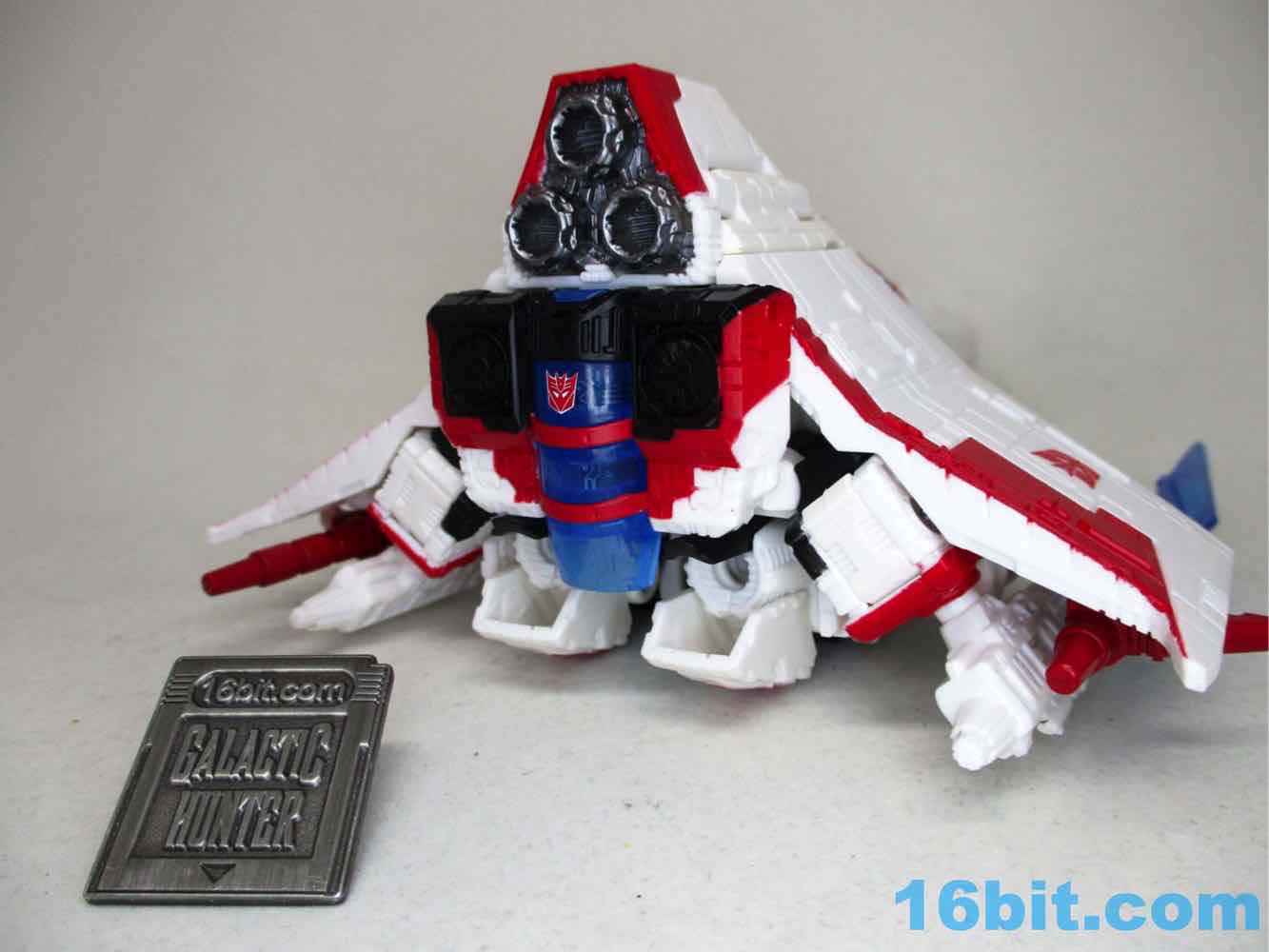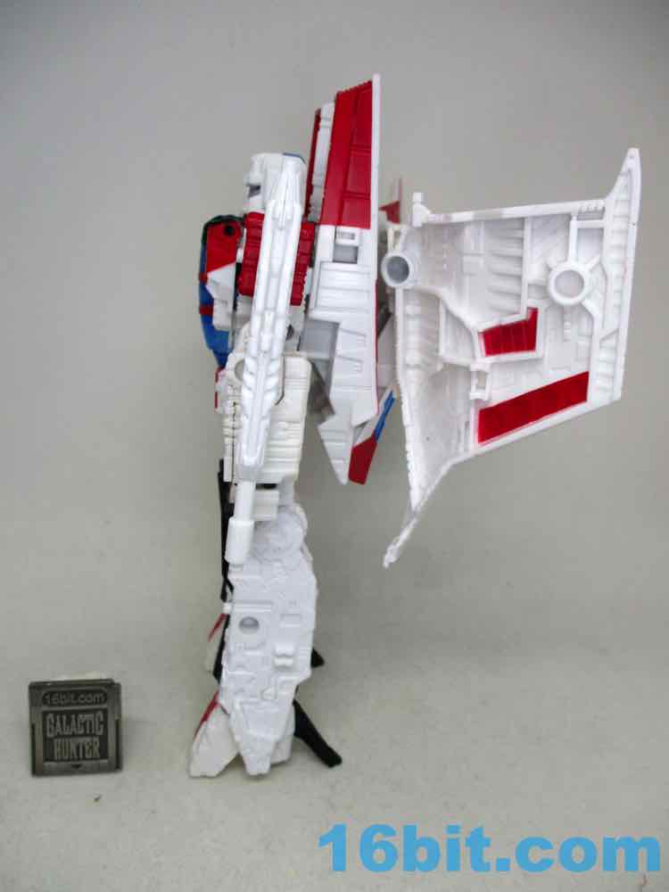 Unsurprisingly, he holds his weapons well and looks great. I would've loved Decepticon faces on his wings, but it was not meant to be - at least not when you're looking at him in robot mode. Even though this mold is three years old, it still works great with double-jointed elbows and a surprisingly flexible knee joint. And rocker ankles. With lots of sculpted detail. While not all the white plastics match perfectly, it's still a very nice looking figure and should remain so if you keep it out of sunlight. And most other light. Dark closets, people, they exist for a reason.