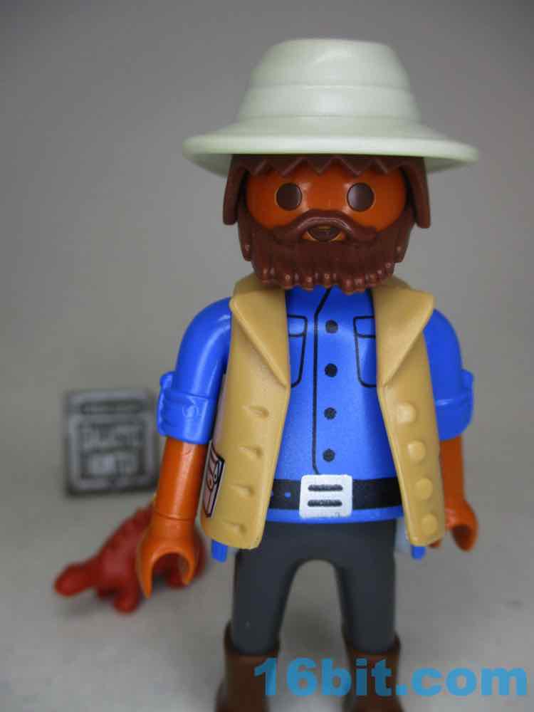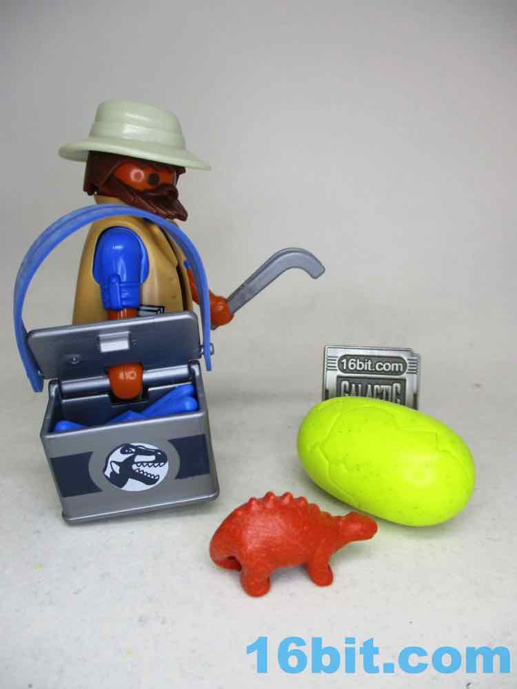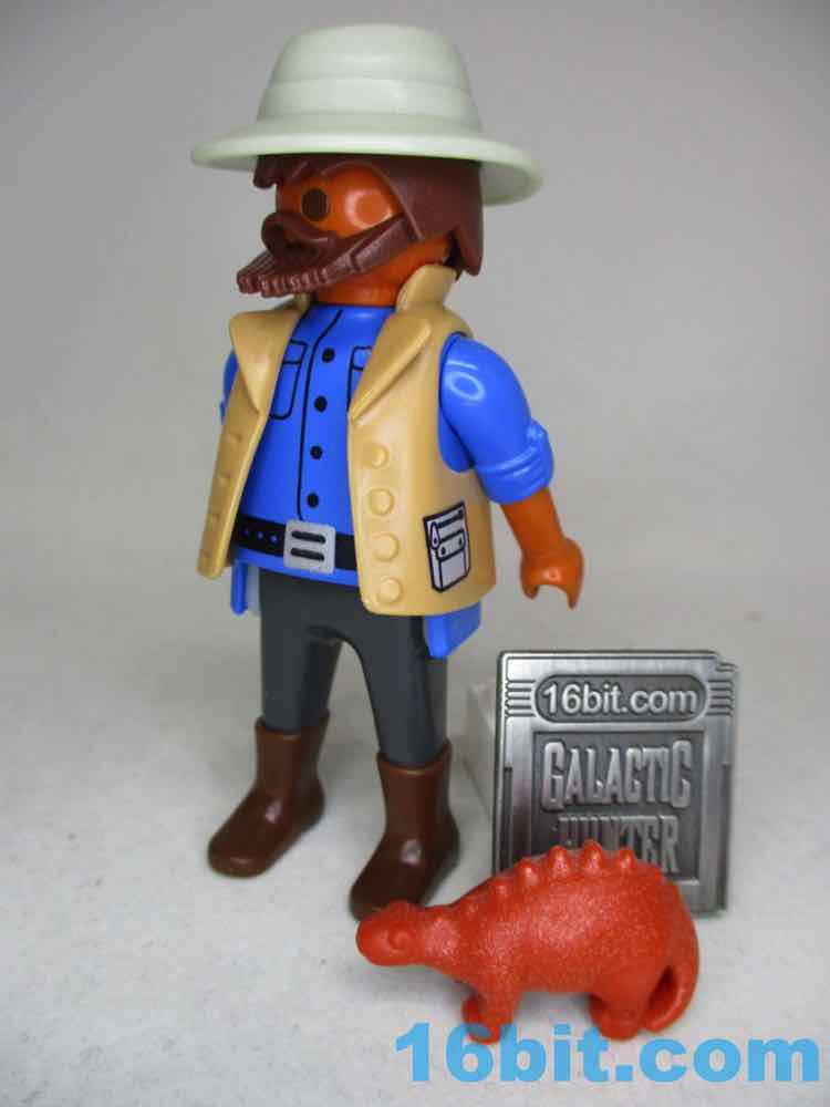 Your human figure has tanned (or darker) skin, a beard, rolled-up sleeves on a blue button-down shirt, a brown vest, and brown boots. There's nothing particularly striking about the figure, but he does seem like a pastiche of paleontologists and/or Jurassic Park movie people. There's no JP credential tag or t-rex skeleton on his vest, but this looks like the way someone who probably digs through dirt for bones might dress. As always, the figure stands, sits, and grips accessories with no problems. He's a Playmobil figure. Generally speaking, even the bad ones are perfect.