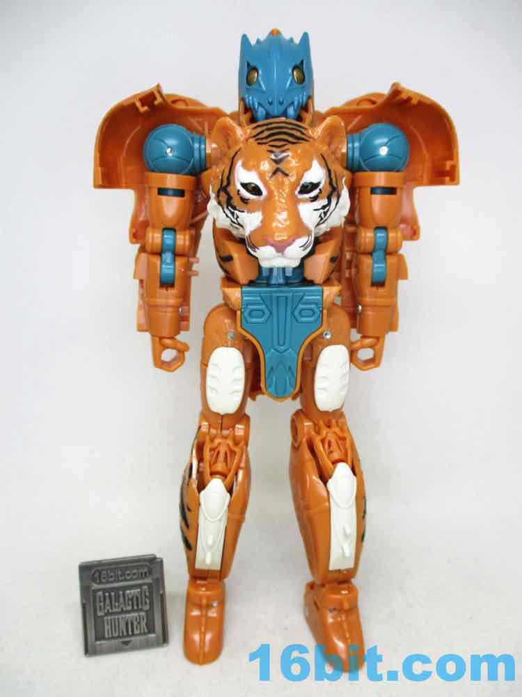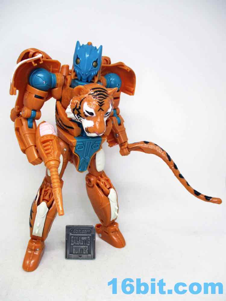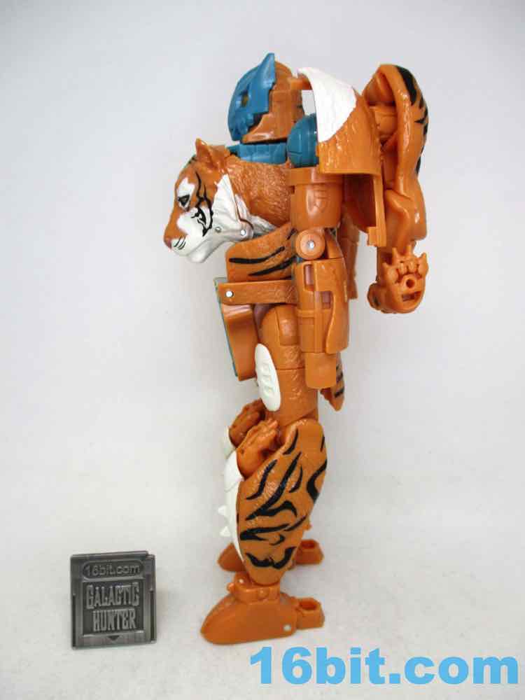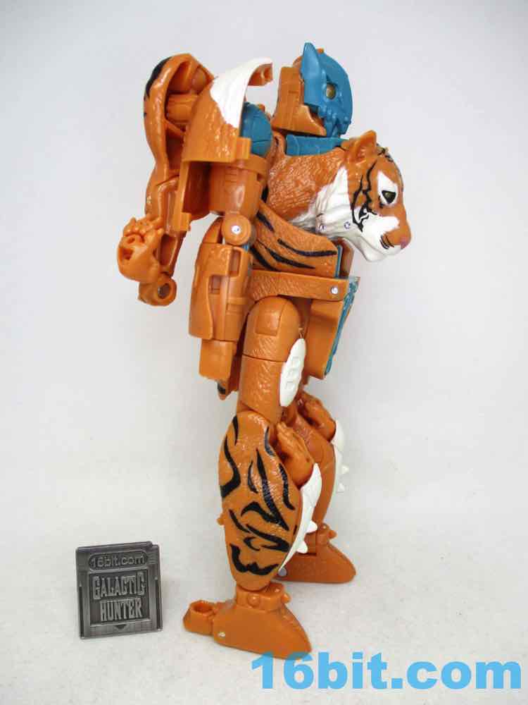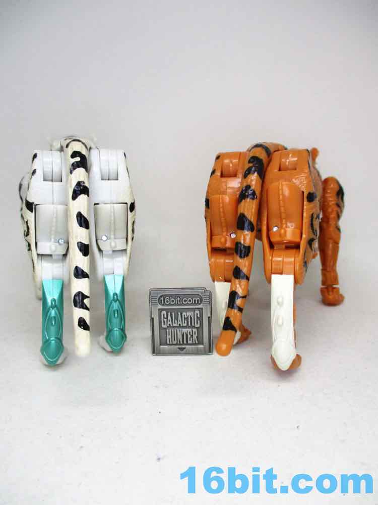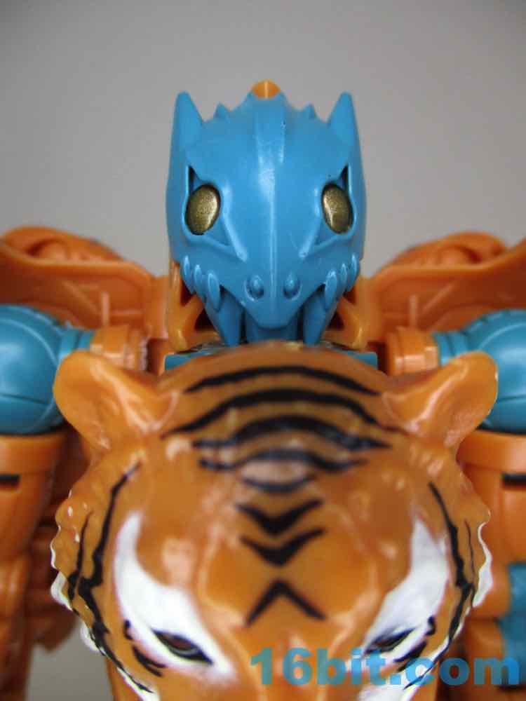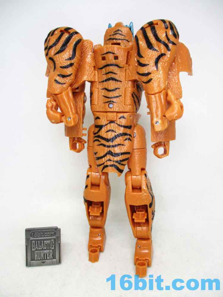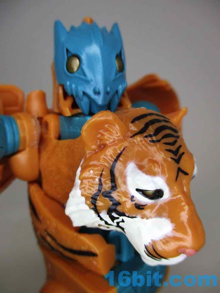 The robot is the same as regular Tigatron [FOTD #2,395], with the same great articulation and much of the same great deco. This robot has hte same black stripes, but you'll notice other new highlights. There are white patches on the face and legs, for example Also the head is a teal monster mask, which is an element from Beast Wars that tends to get forgotten as most of these faces weren't featured prominently in the TV show or subsequent marketing artwork. He has big gold eyes and a teal head with what look like various creature fangs and teeth, It's also painted, so be careful with it. Orange looks much better than white when it comes to showing off sculpted detail, so it's a lot easier to see some of the fur and mechanical bits. There just isn't a whole heck of a lot to see here - they didn't go overboard with the redesign.
