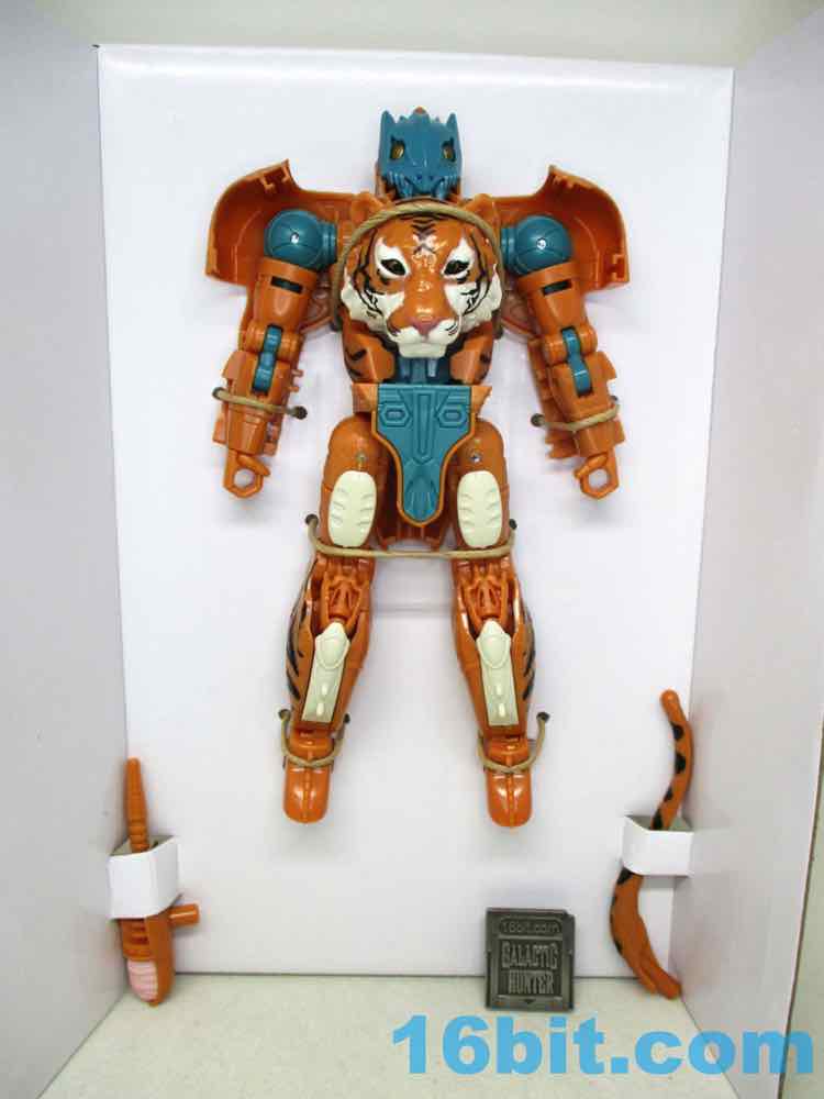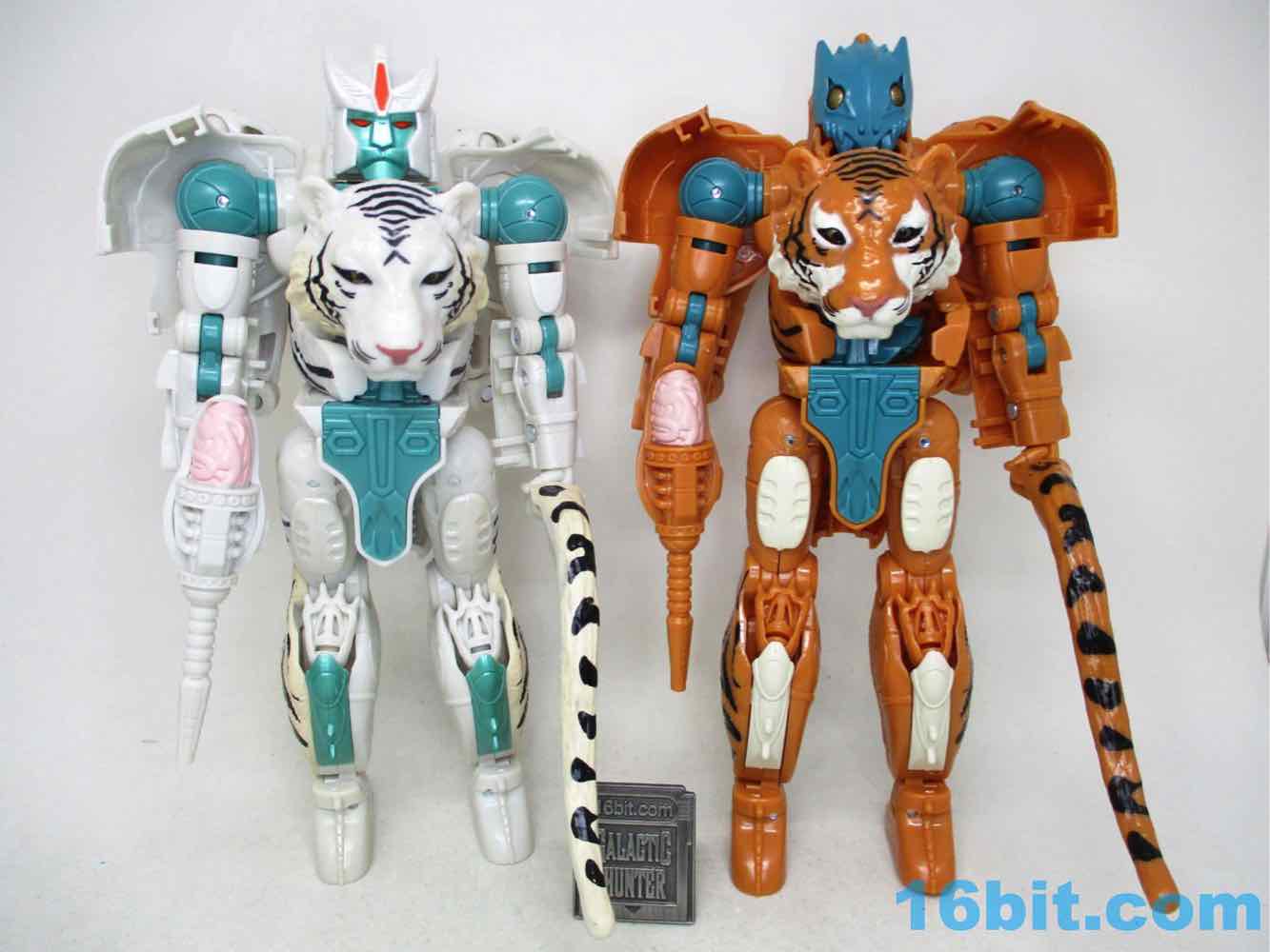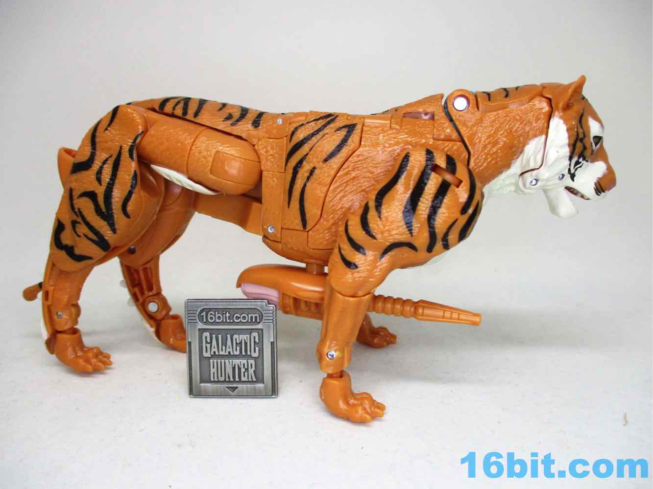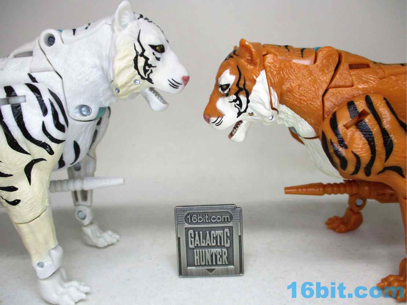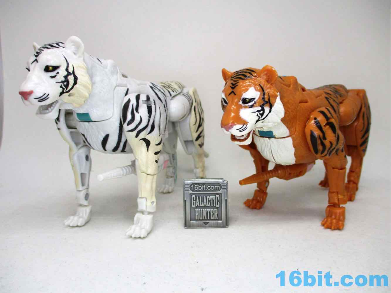 The robot is the same as regular Tigatron [FOTD #2,395], with the same great articulation and much of the same great deco. This robot has hte same black stripes, but you'll notice other new highlights. There are white patches on the face and legs, for example Also the head is a teal monster mask, which is an element from Beast Wars that tends to get forgotten as most of these faces weren't featured prominently in the TV show or subsequent marketing artwork. He has big gold eyes and a teal head with what look like various creature fangs and teeth, It's also painted, so be careful with it. Orange looks much better than white when it comes to showing off sculpted detail, so it's a lot easier to see some of the fur and mechanical bits. There just isn't a whole heck of a lot to see here - they didn't go overboard with the redesign.