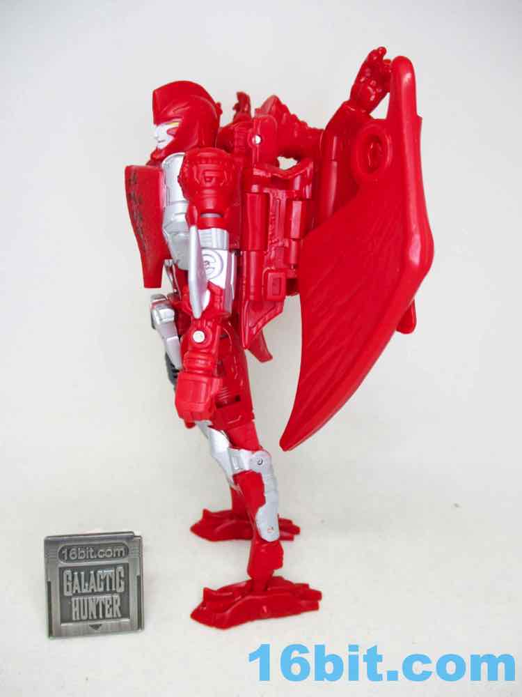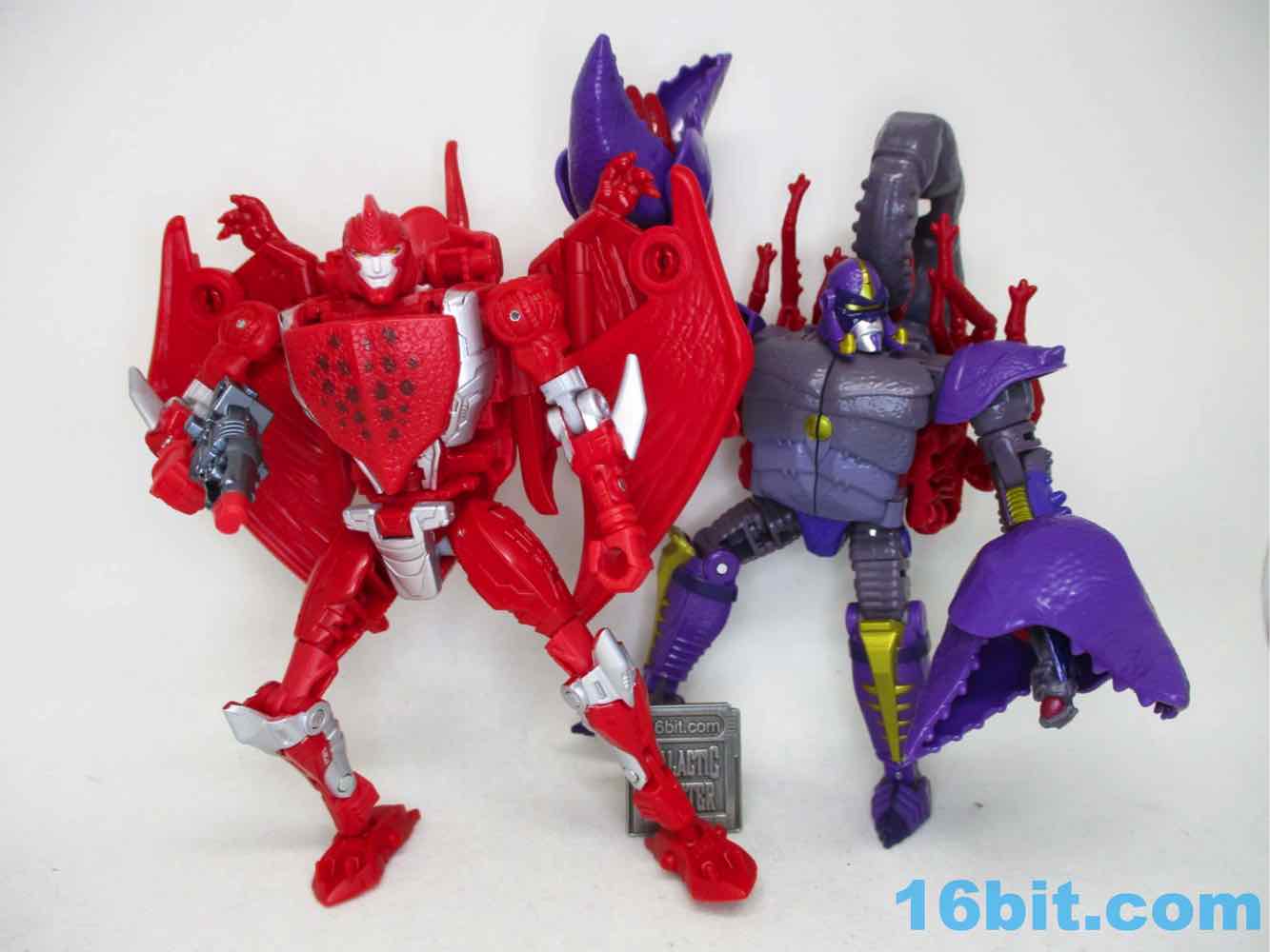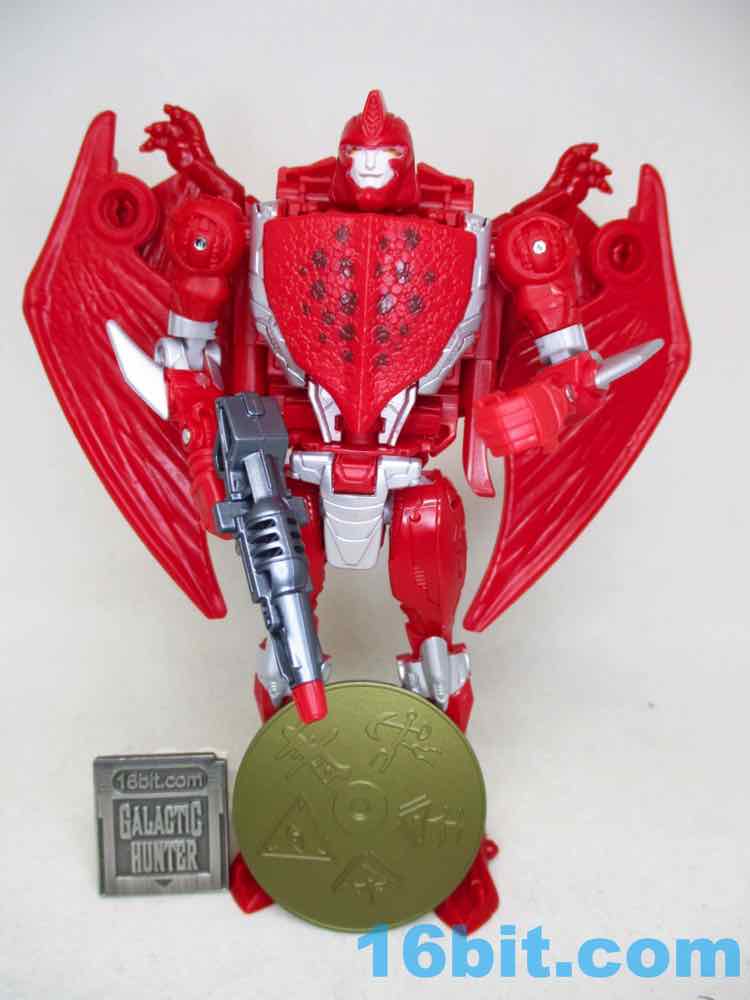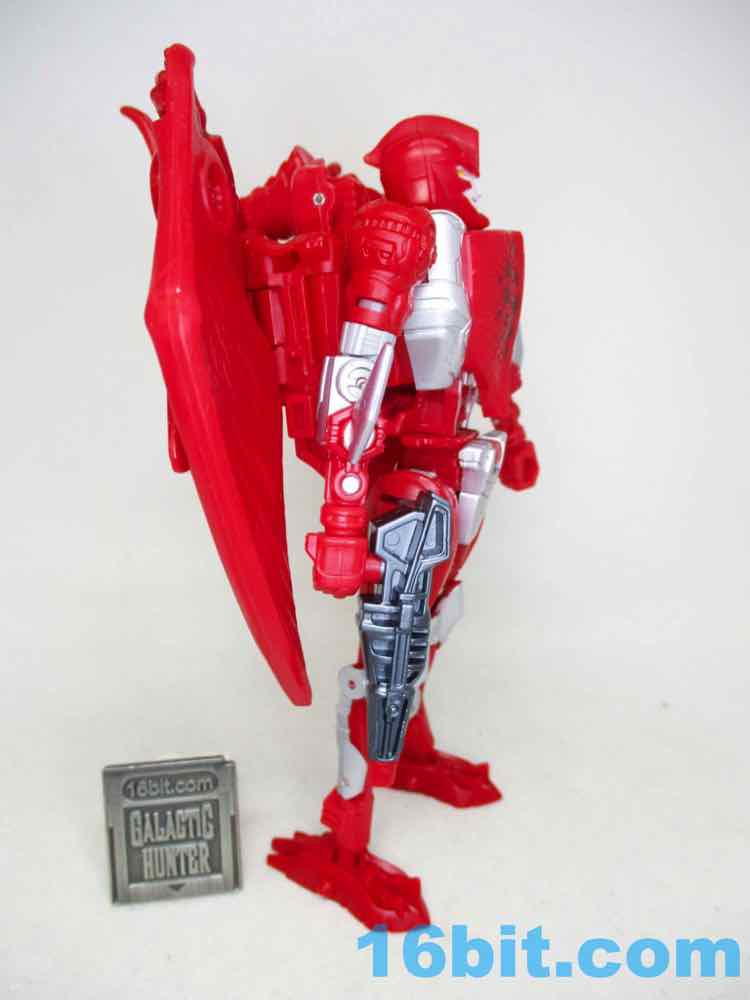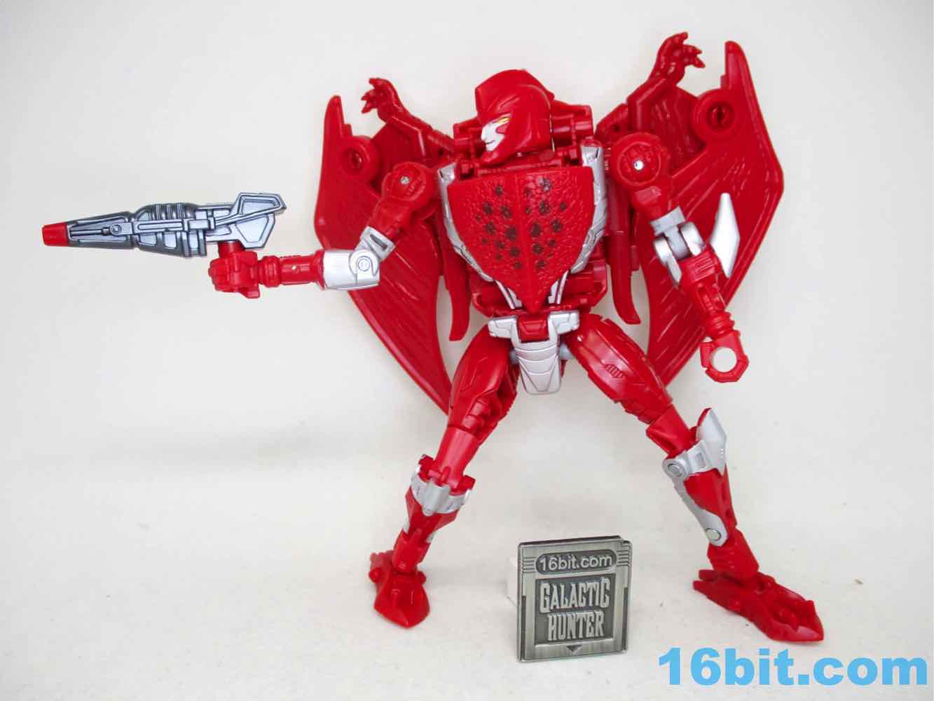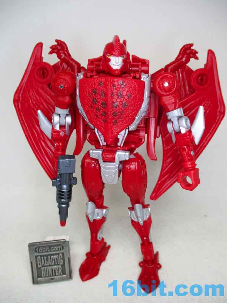 As a retool of Airazor, this is a clever toy with tons of new parts. Sure, the arms and legs are pretty similar to the Maximal bird, but the torso, feet, head, and backpack are now - you also get a swell blaster! It's not as fun as the original flipchanger toy (complete with gun storing backpack), but it's really simple to change and the articulation is, unsurprisingly, greatly improved at the larger size. The Predacon warrior now features 24 points of articulation thanks to tons of joints in his limbs, and the sculpting looks a lot like what you remember on the TV show. Obviously, it's not the same - there's no metallic reds, the shoulder spikes aren't there, and the toy has much less silver than what you saw on TV. This toy is so completely different from the TV show model that it shouldn't hurt any potential release for a Masterpiece toy, except for price. This is so much cheaper you might just get it and go "eh, good enough" - because it is. The chest freckles are there, the helmet looks right, the eyes look sinister, and it has big red wings. The robot feet do more or less look like what you saw on TV (minus some color), and as a new reinterpretation of Terrorsaur it just plain works. I really like the forearm spikes - removable if you prefer. The texture isn't too overpowering, and I love the blaster.