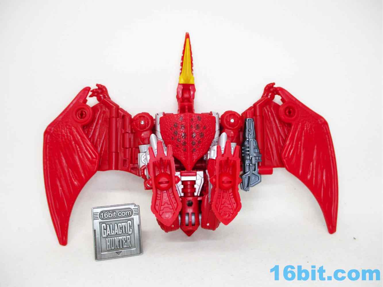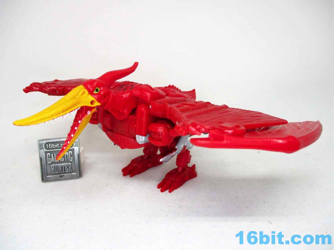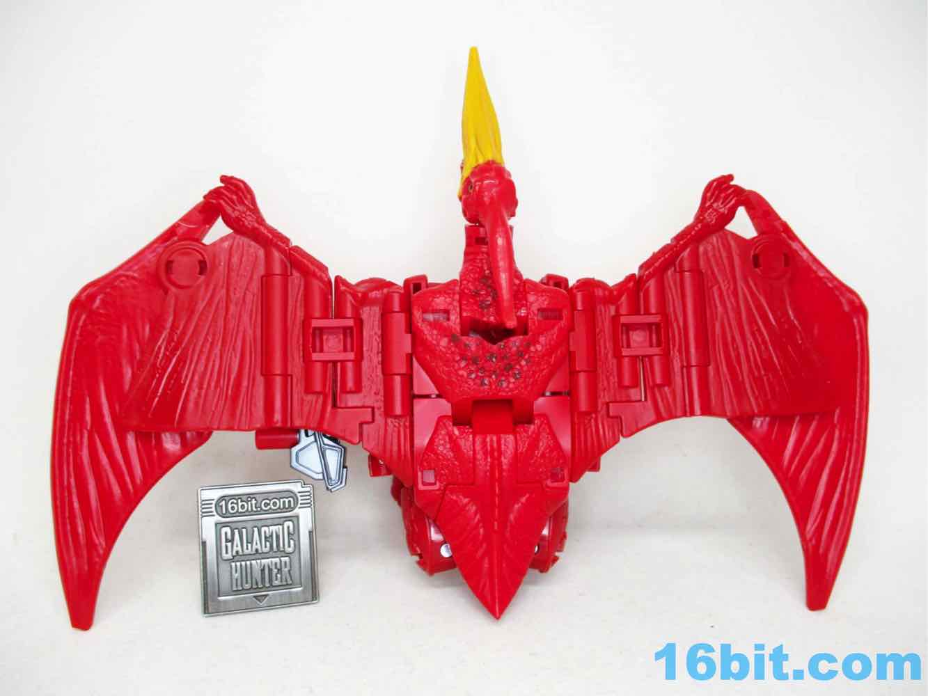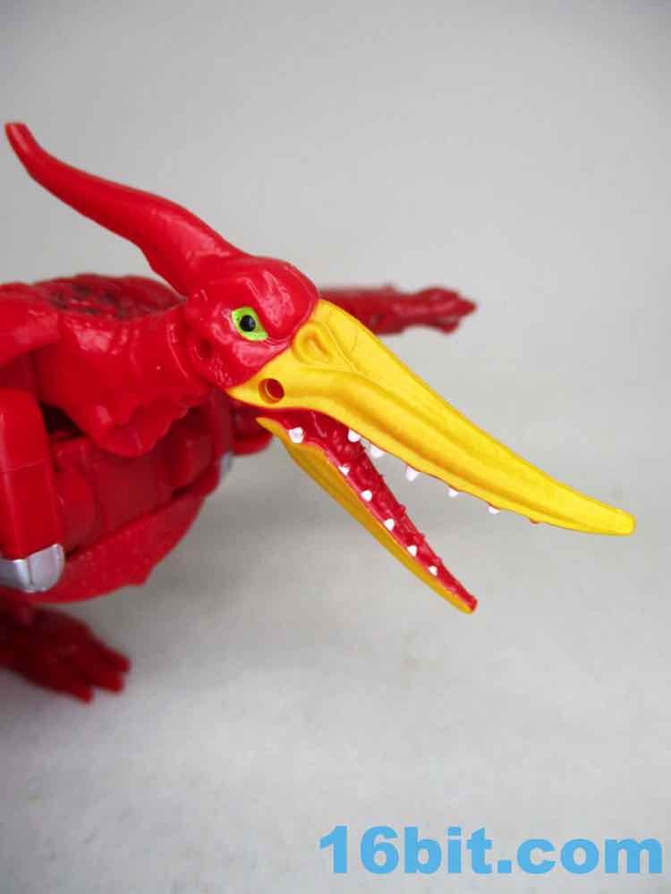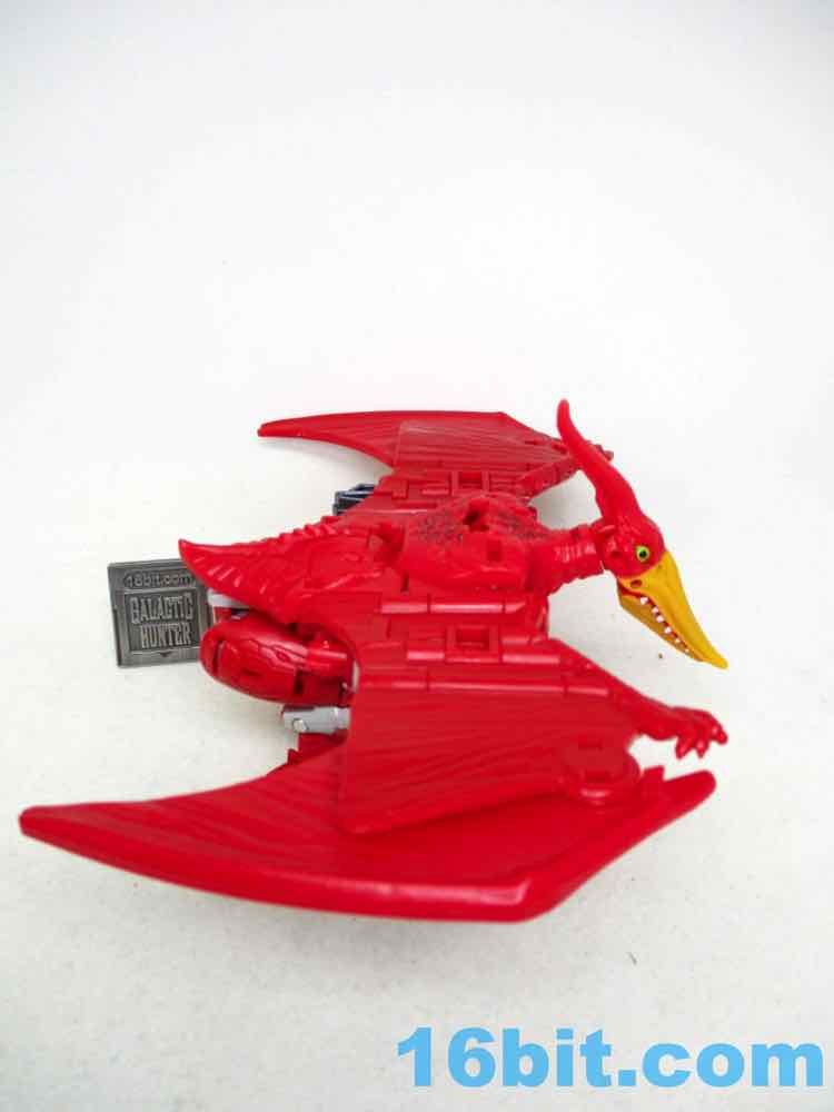 It's hard to make the prehistoric creature stand in reptile mode, but you can tilt him back and balance him to sort of, kind of stand upright. The design of the toy doesn't allow for him to have an animal chest like on the TV show, because physics probably would not permit such a thing without retractable cloth wing elements or something we haven't come up with yet. (Or a lot of moving parts at a high price point.) You do get yes, a toothy yellow back, articulated feet, and moving wings - that fall off if you aren't careful. I still like it. I also still like the original 1996 toy a lot, but this is good for different reasons. Aside from the opening mouth, it doesn't do a lot other than make you happy that you have it.