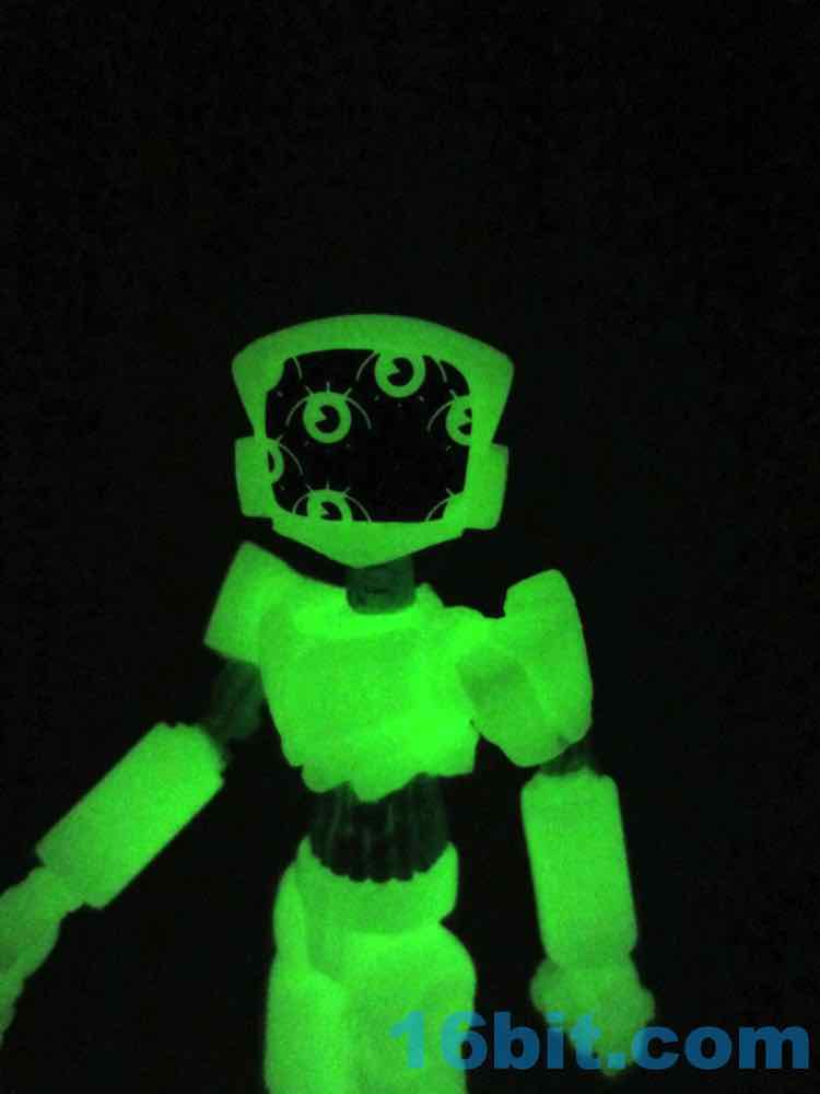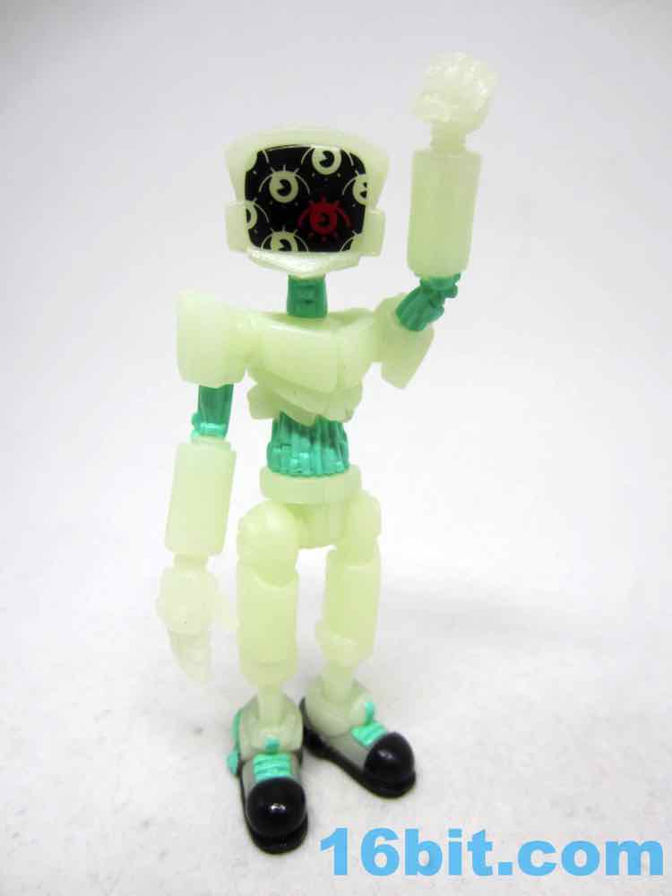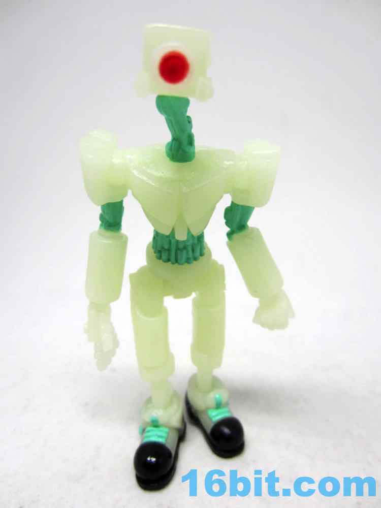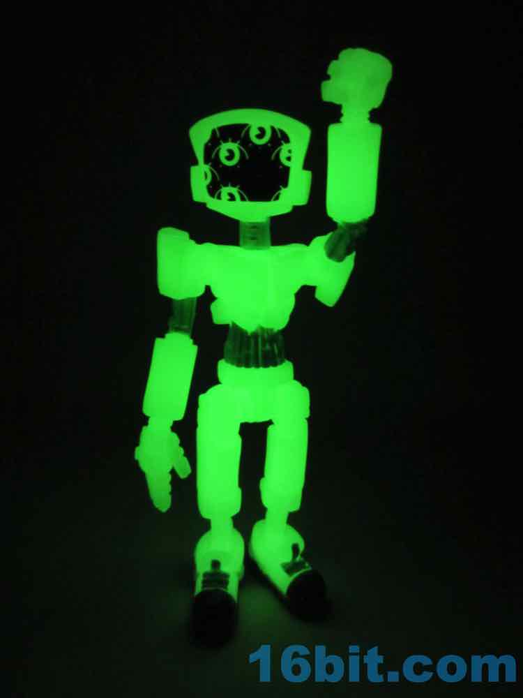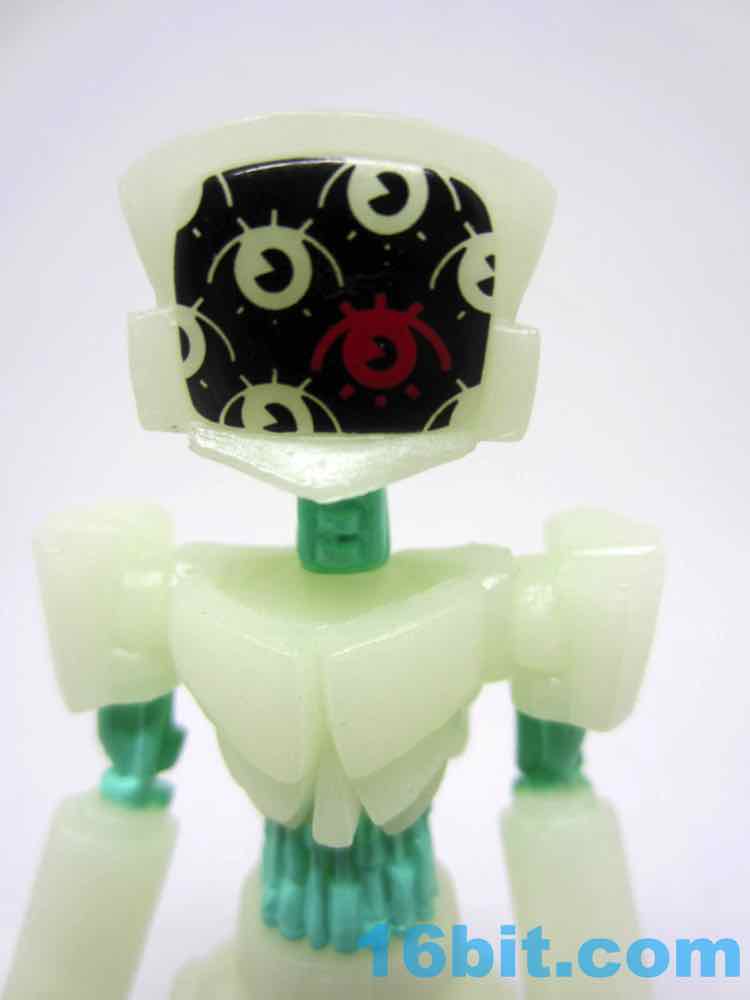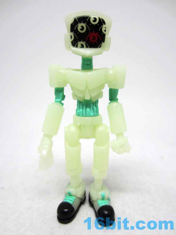 The 3 1/4-inch figure has a monitor head in his package, but also has a clown-like face on a flat panel head and a video camera noggin. You've got some swell options! I prefer the monitor head, mostly because it looks a lot like a couple of open CRT displays I have laying around. It's covered in eyeballs, plus has a bonus Glyos peg on the back for more building or an alternate configuration. The details are sculpted in well, but glow plastic eats detail alive. It's just a shape. The same is true of the camera head with its red lens and the flat-faced happy head.