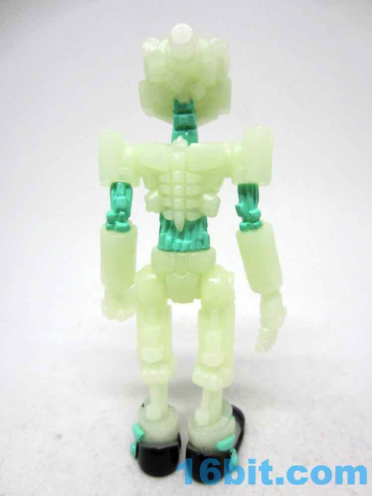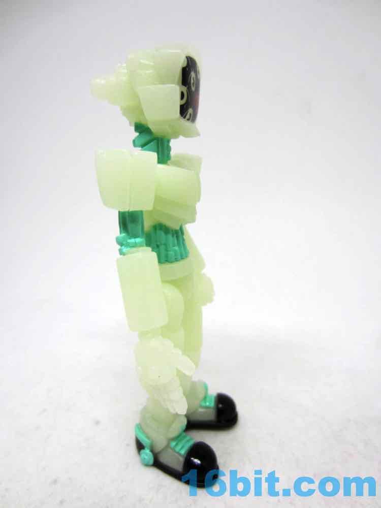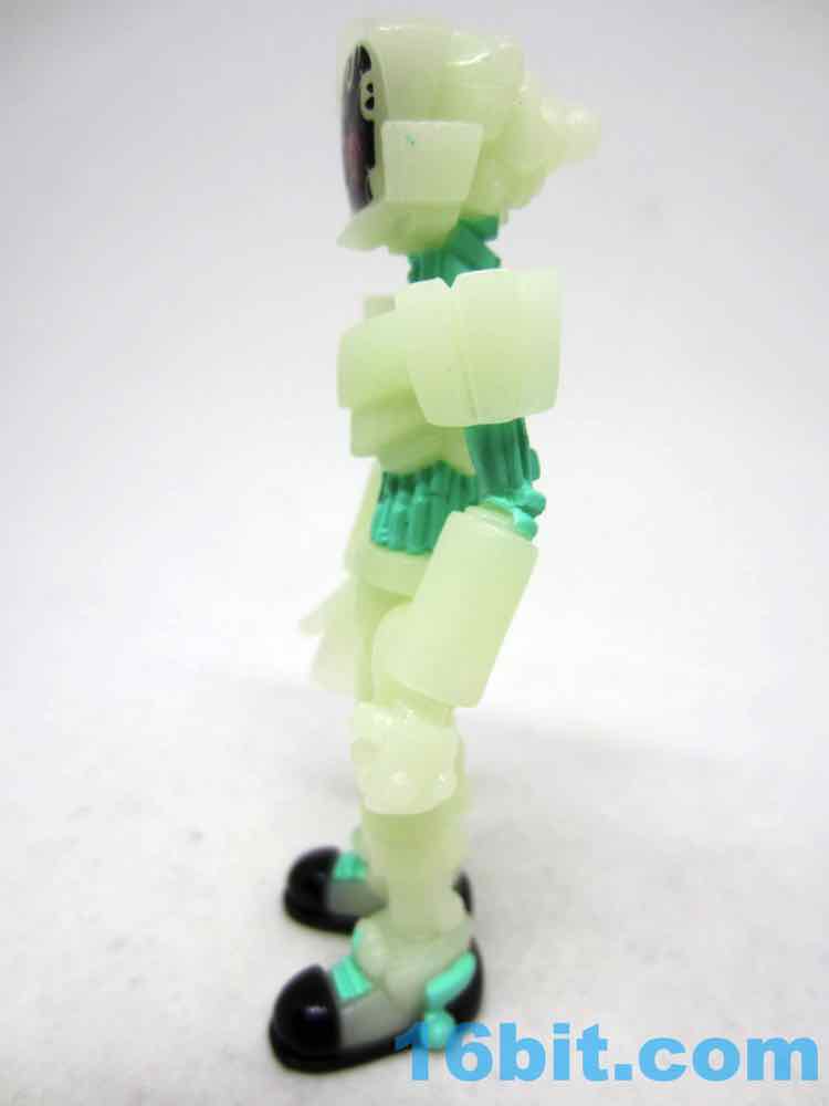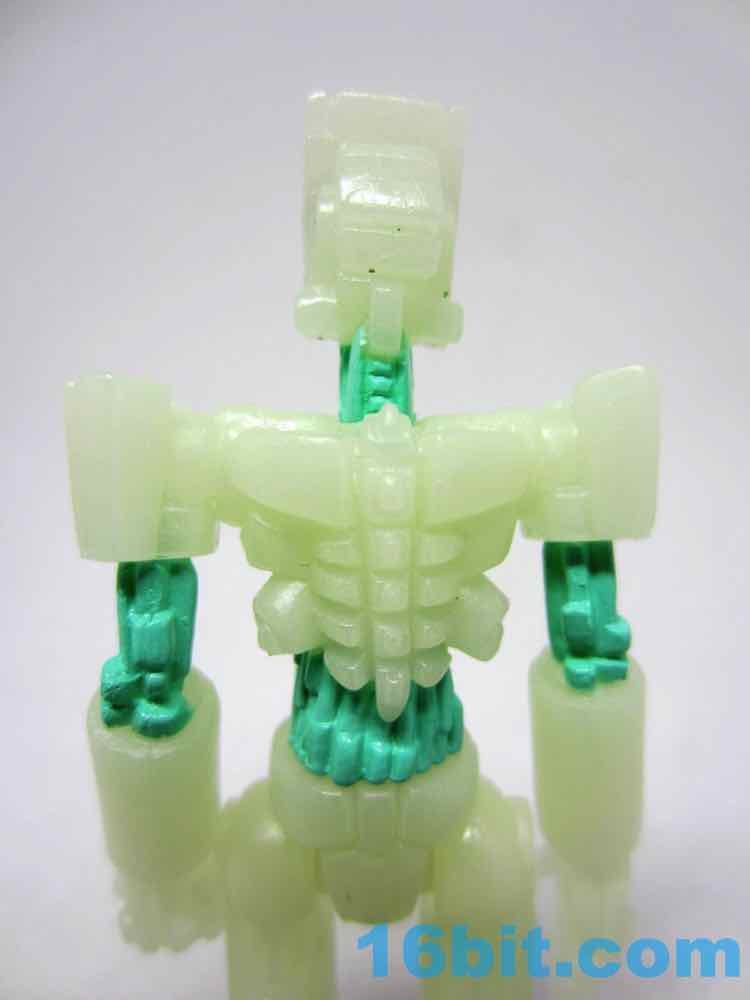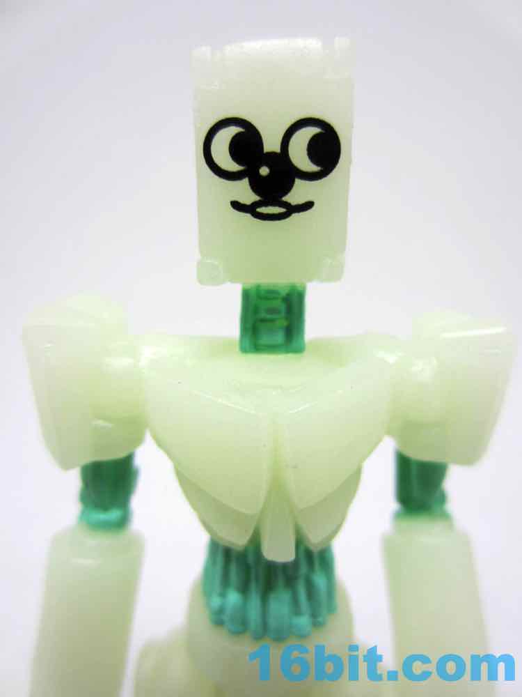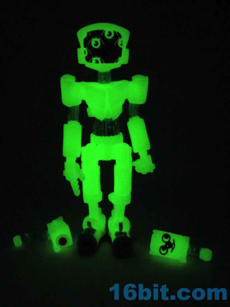 The 3 1/4-inch figure has a monitor head in his package, but also has a clown-like face on a flat panel head and a video camera noggin. You've got some swell options! I prefer the monitor head, mostly because it looks a lot like a couple of open CRT displays I have laying around. It's covered in eyeballs, plus has a bonus Glyos peg on the back for more building or an alternate configuration. The details are sculpted in well, but glow plastic eats detail alive. It's just a shape. The same is true of the camera head with its red lens and the flat-faced happy head.