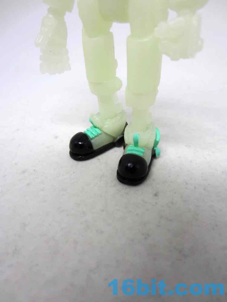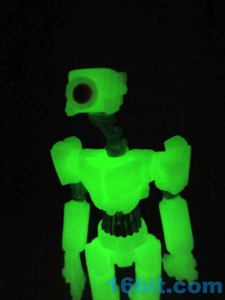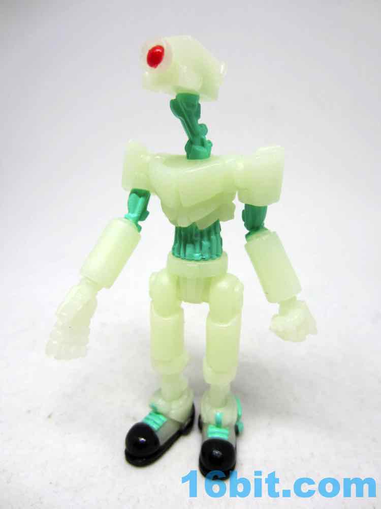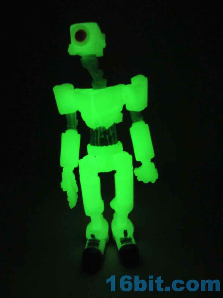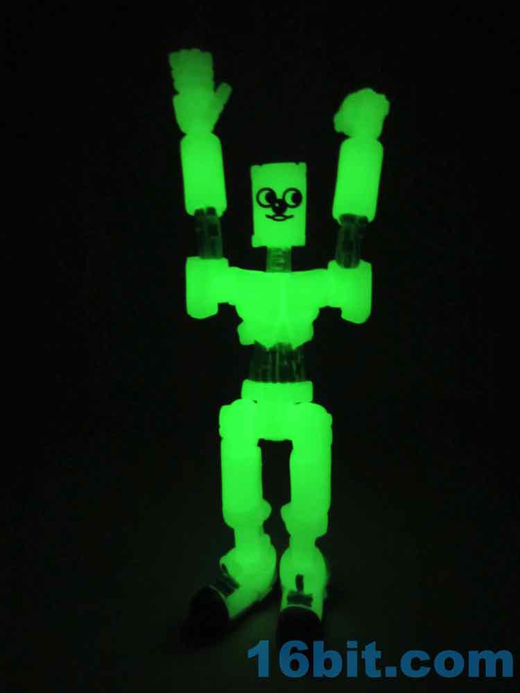 The figure itself is jointed in multiple spots with such great details as sneakers, wiring on the torso, a robot spine, and nice hands. One is open for slapping, the other is a fist for punching. The design is gleefully retro, and since it glows, it's right up my alley. He stands well and has proven to be a sturdy plastic pal who's fun to be with.