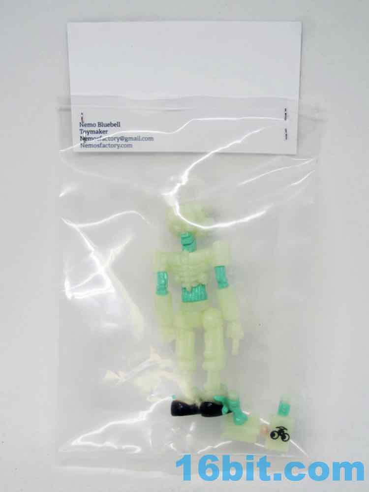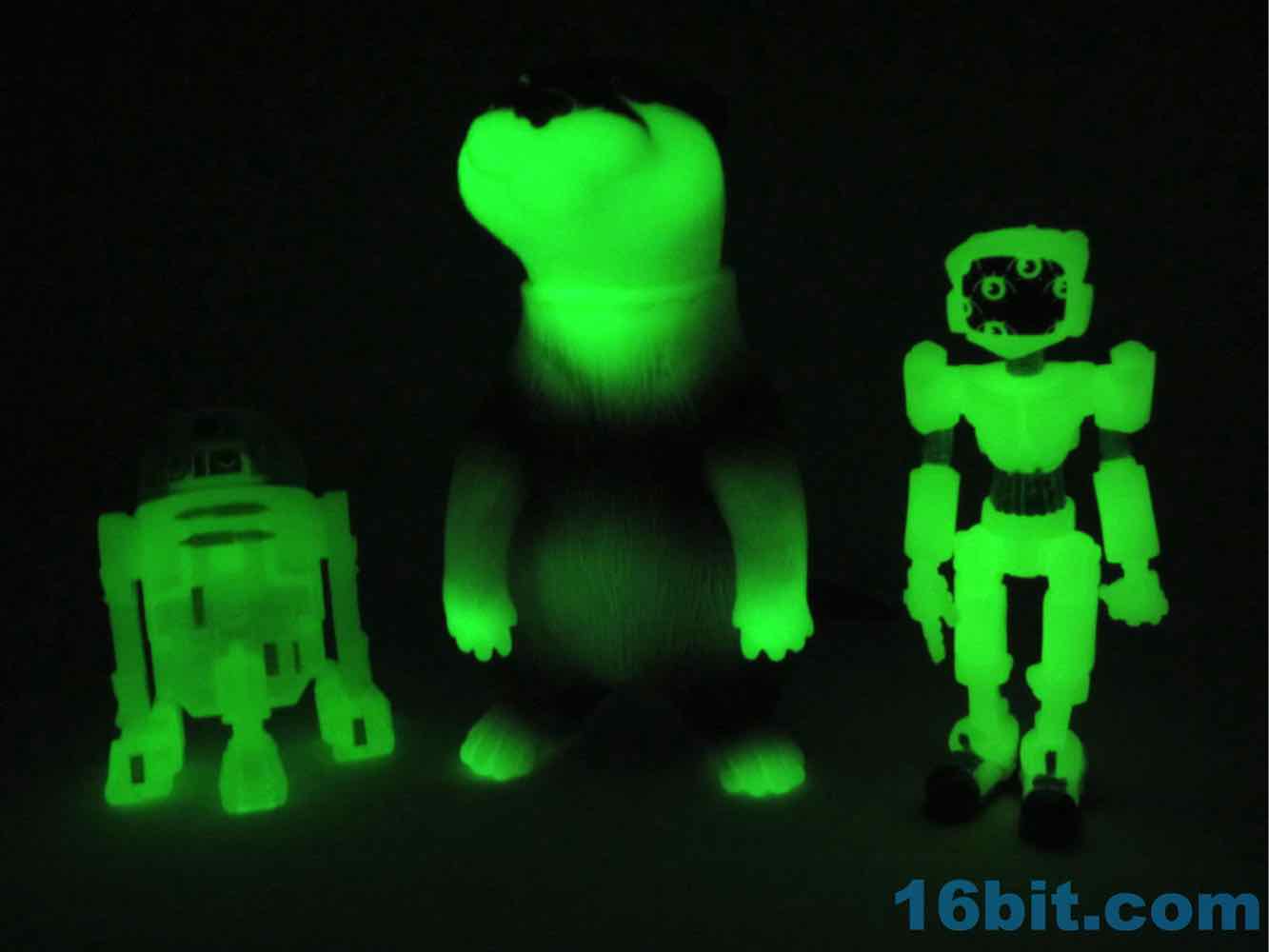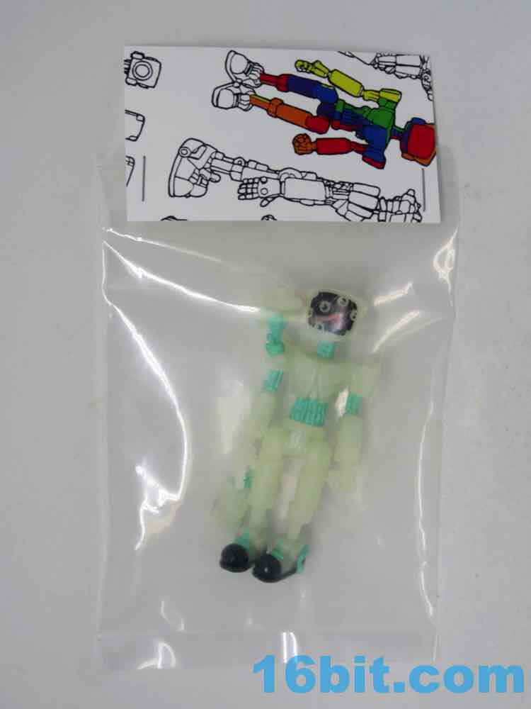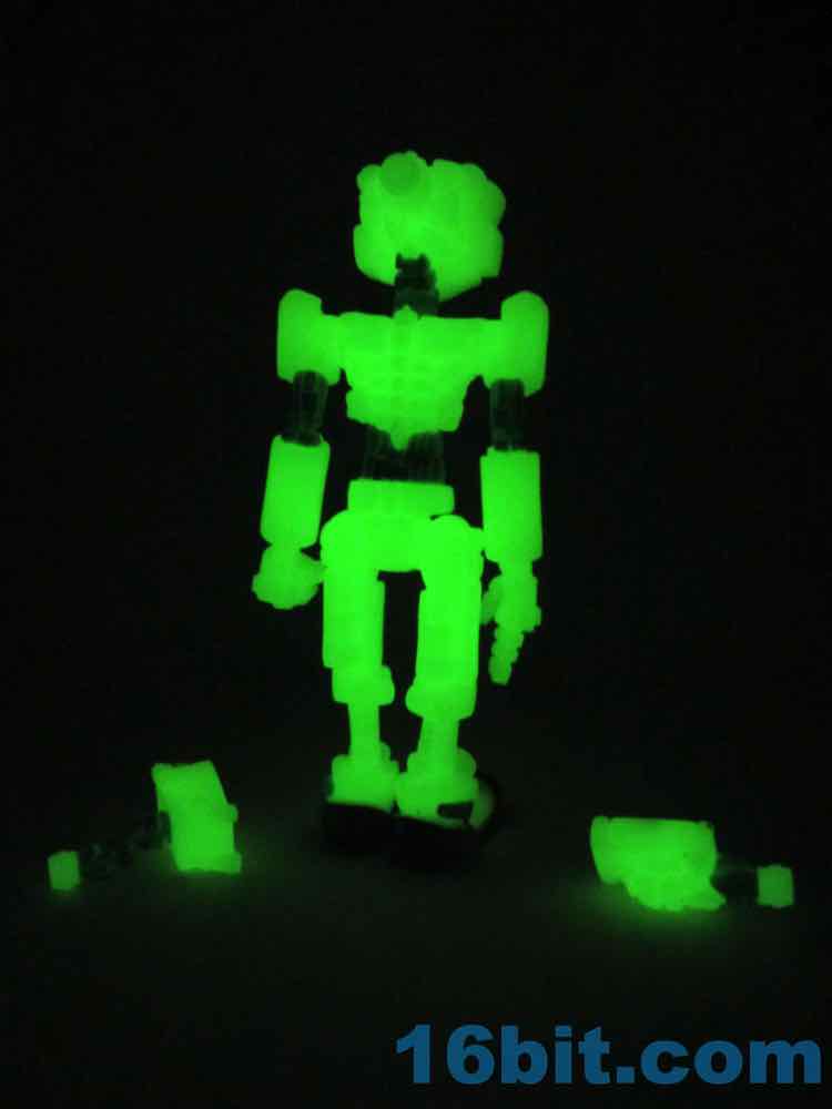 The figure itself is jointed in multiple spots with such great details as sneakers, wiring on the torso, a robot spine, and nice hands. One is open for slapping, the other is a fist for punching. The design is gleefully retro, and since it glows, it's right up my alley. He stands well and has proven to be a sturdy plastic pal who's fun to be with.