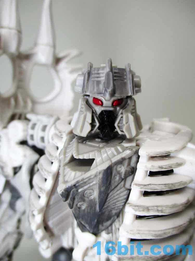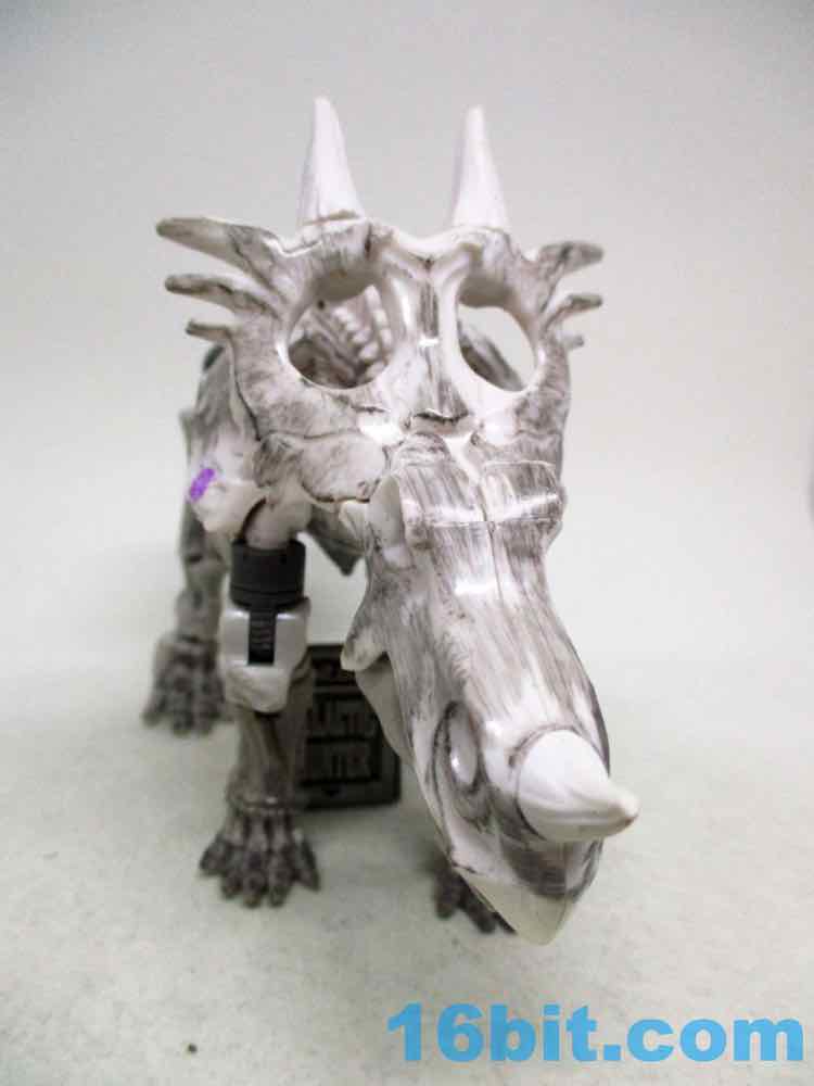 The skeleton is pretty cool - you get red eyes, a purple Predacon symbol, and a generally sturdy bony little guy. The skull has three removable, somewhat rubbery horns and an opening jaw. There's a 5mm peg that serves as a tongue, but there aren't many cool parts with which to connect. The frill is removable, and probably should have been glued down. Perhaps yours was - mine wasn't. The legs have some decent articulation, but on the whole what you see is what you get. Other than standard dinosaur articulation, there aren't many surprises here. I really would have liked some sort of fire-breathing element.