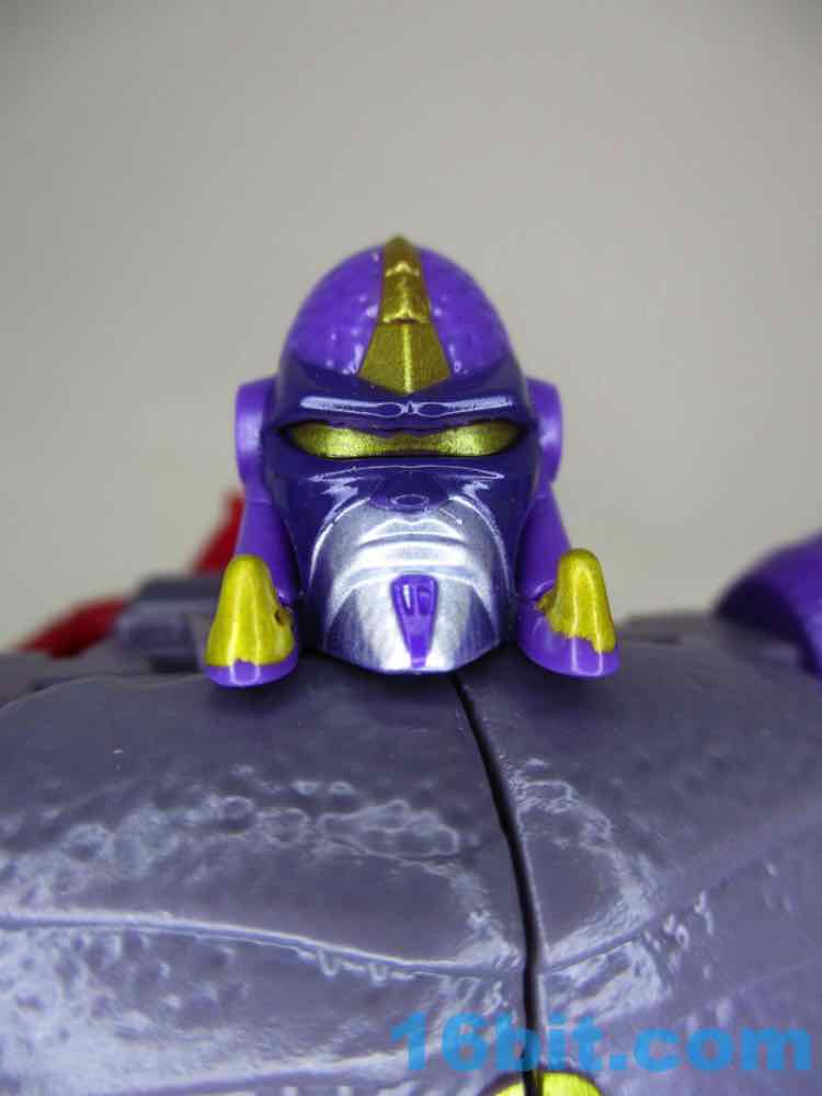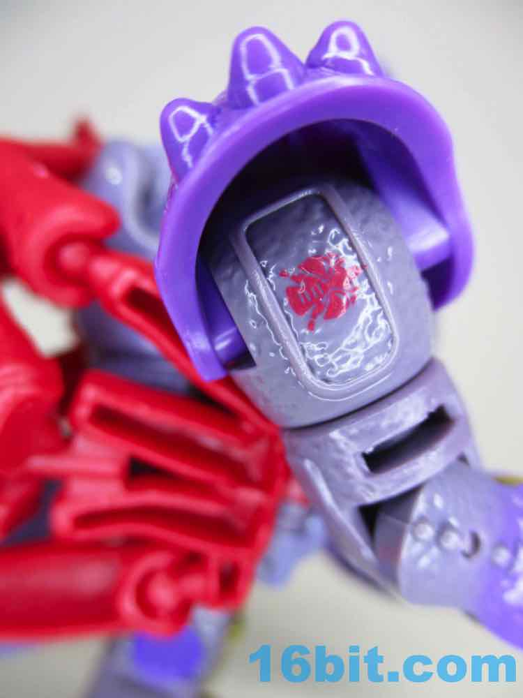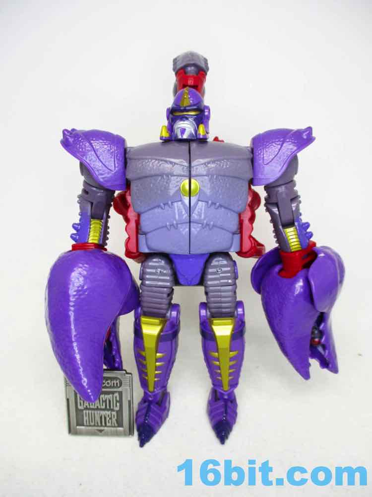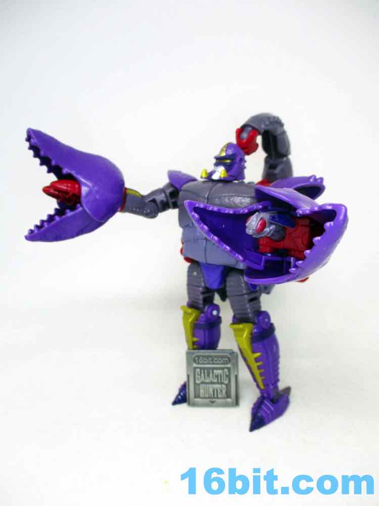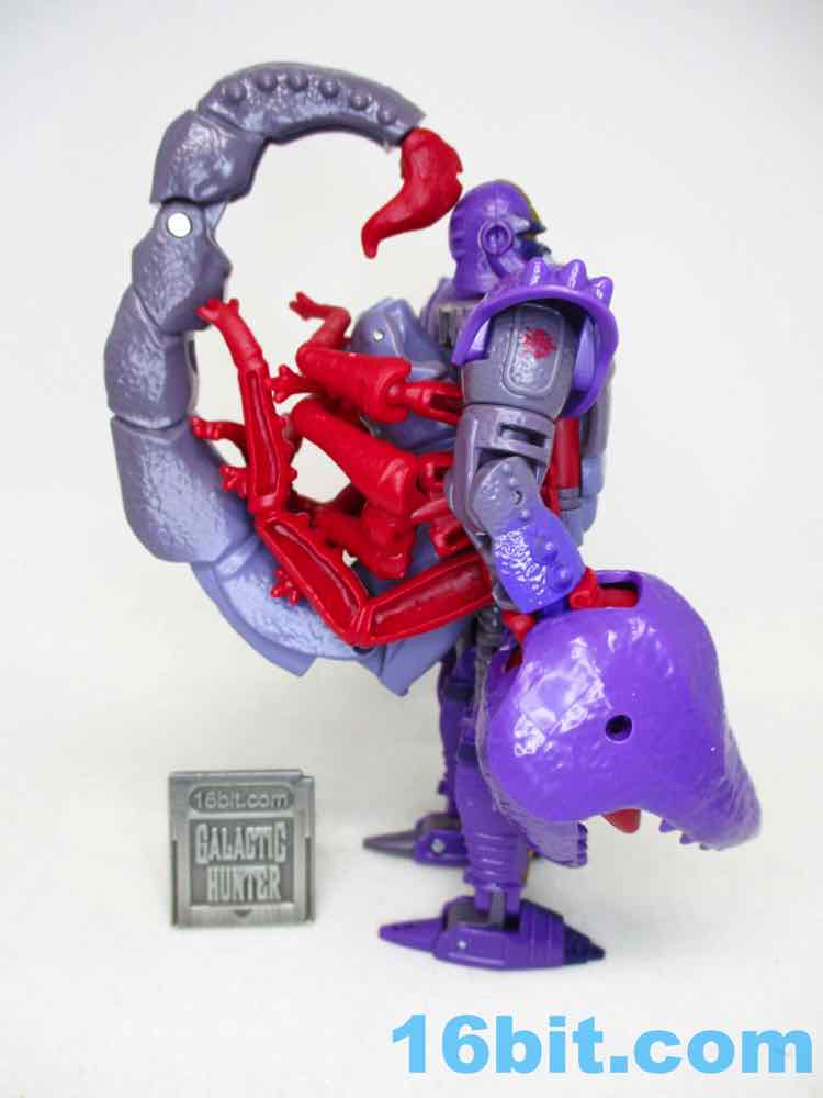 The robot for Scorponok borrows extensively from the 1990s cartoon, with a head and colors that'll make you say "I recognize that!" There are numerous changes to the figure, pike the shape of the pincers and the shape of the chest. Also the leg detail. And the colors of the tail. But a lot of elements, like the shoulders, the fangs on the helmet, and some of his accessories are inspired by that animation model, giving you a pretty good little toy. It's just not an exact replica of the Predacon stooge. The toy has some impressive texture and nice additions like a red stinger, but it's also very much a new thing. As redesigns go, it's pretty nice.
