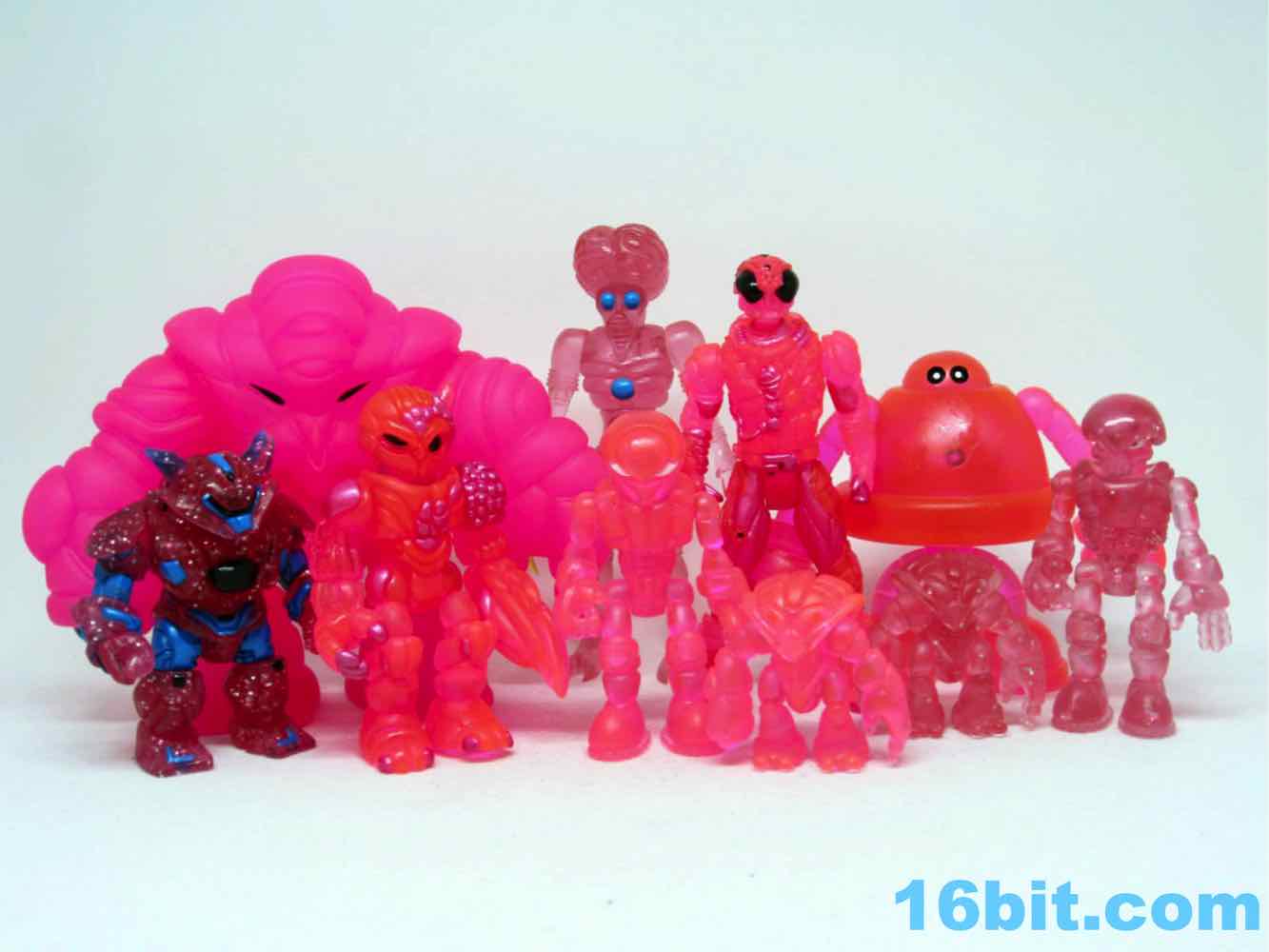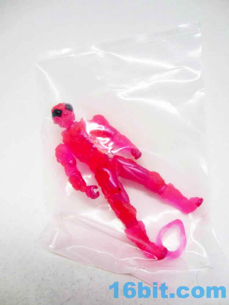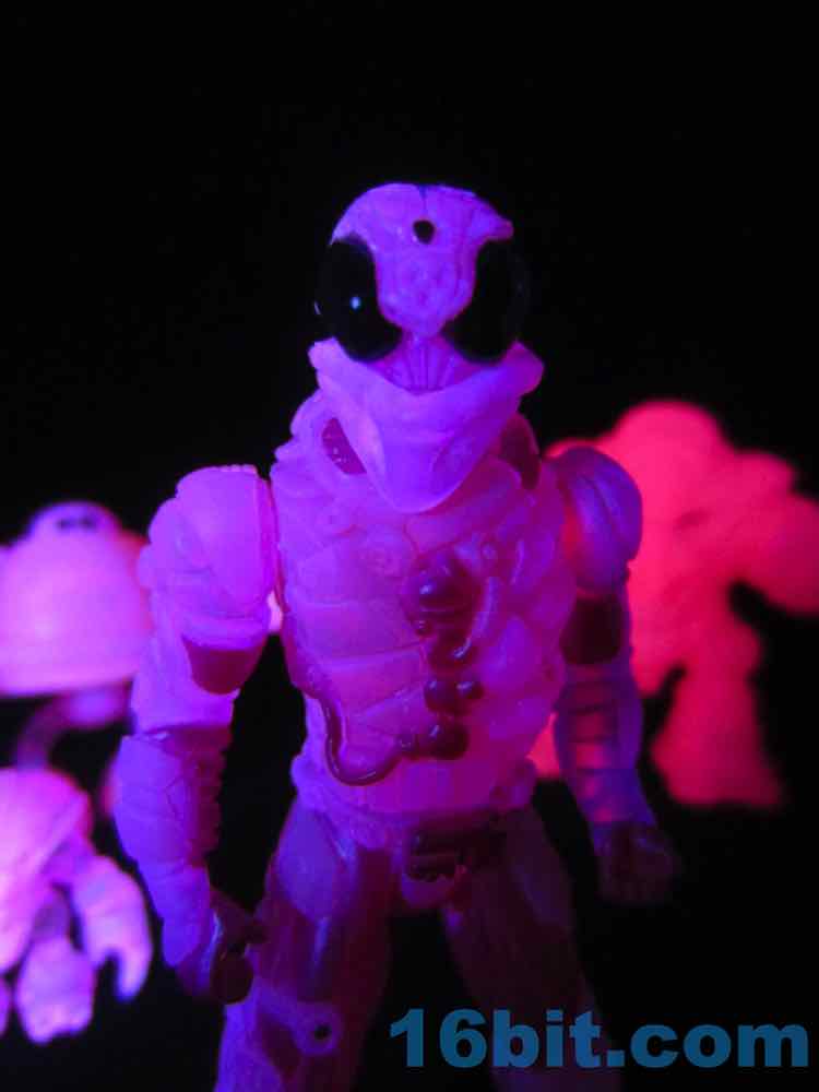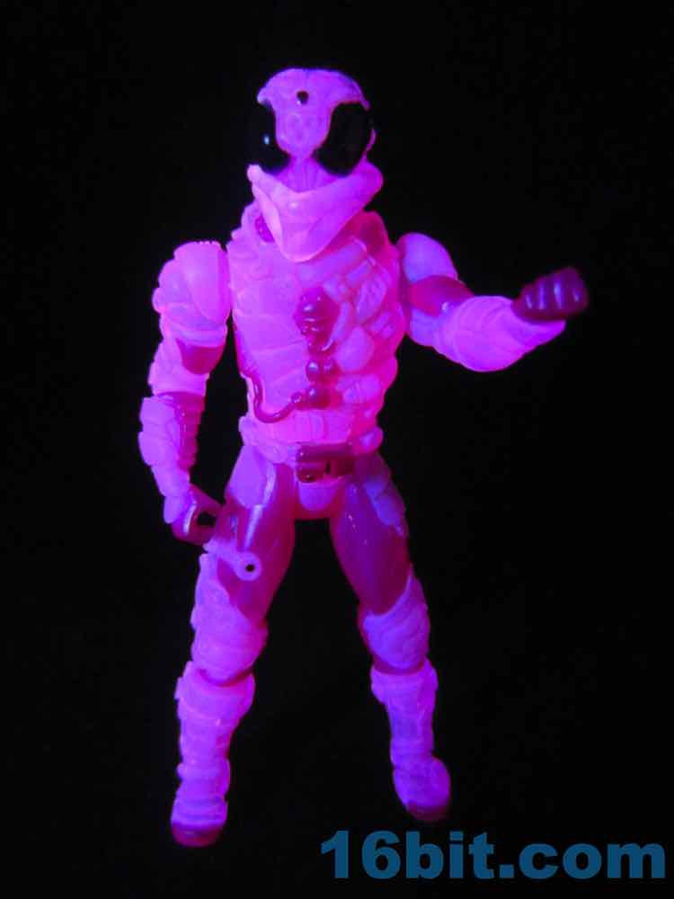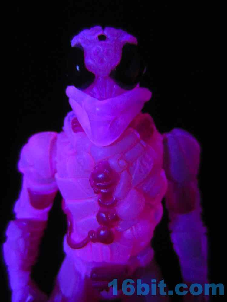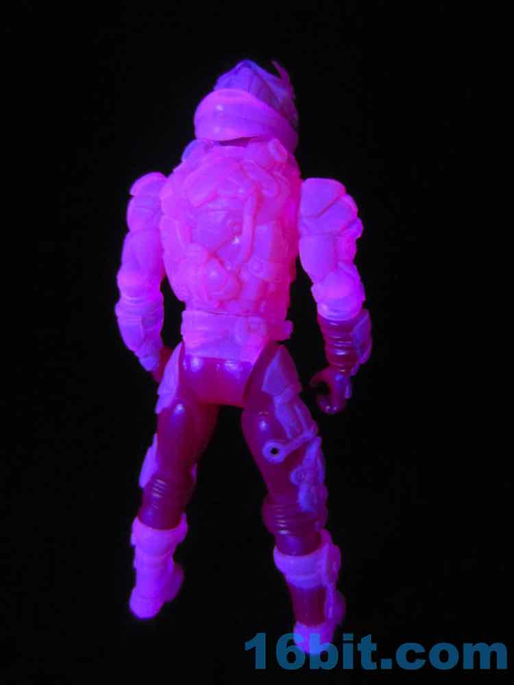 The 3 3/4-inch scale from the great Toy Pizza/Knights of the Slice line crossed over to Onell Design's shop, cast in a clear pink with metallic pink painted highlights. It's subtle - you may be able to make them out more easily in the UV light photos. The figure has some black highlights in the form of eyes and snaps, but the metallic pink is no slouch. If they left it off, you might not mess it, but in the right lighting conditions it helps to enhance the figure and show off a lot of extra detail by reflecting the light rather than gobbling it up.