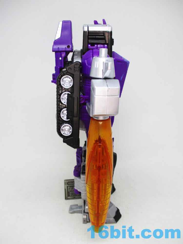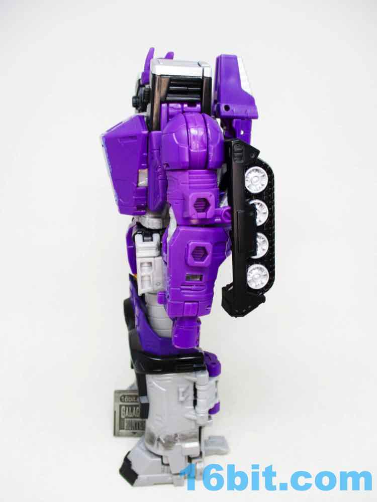 Everything mostly tabs together nicely, which is a mixed blessing. The tank treads fit in a hole in the back of the shoulder, but doing this restricts the bicep swivel. You can leave them untabbed too, but that's sort of annoying because the treads just sort of float around and get in the way. It's good to have the options, but it's a little chaotic. The double-jointed elbows are a nice touch, and wholly necessary for transformation. You also get things like the damage paint, but it's not too much of an eyesore. It's just kind of weird for a newly-rebuilt Decepticon leader. I have no problems getting him to stand around and look cool, and this is a huge step forward from previous robot modes for Galvatron. I still expect that someone has another model in the works for later that'll be even more amazing, mostly because we seem to get a new one every 6 or so years.