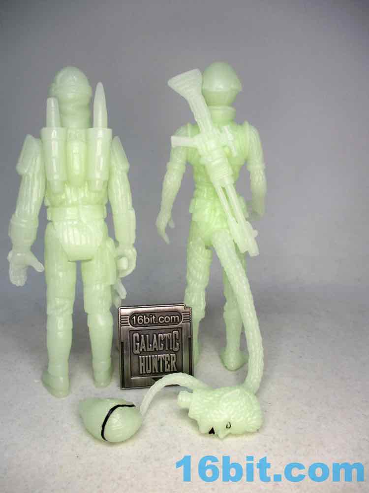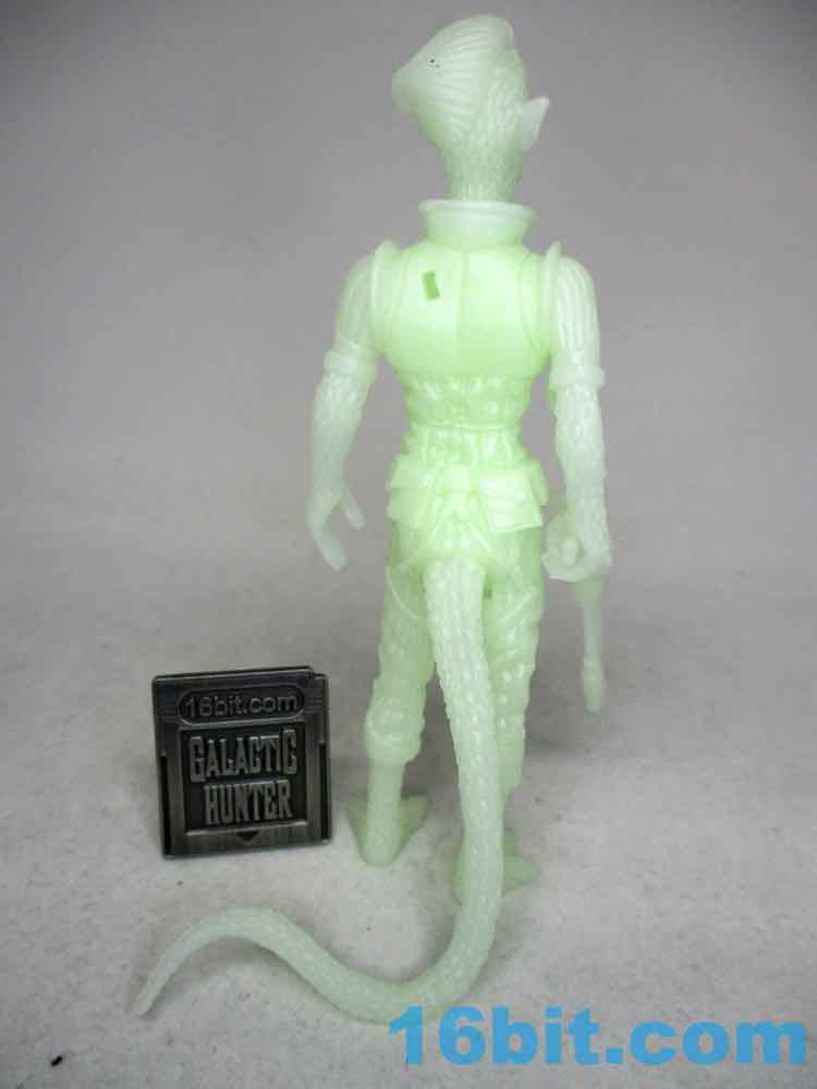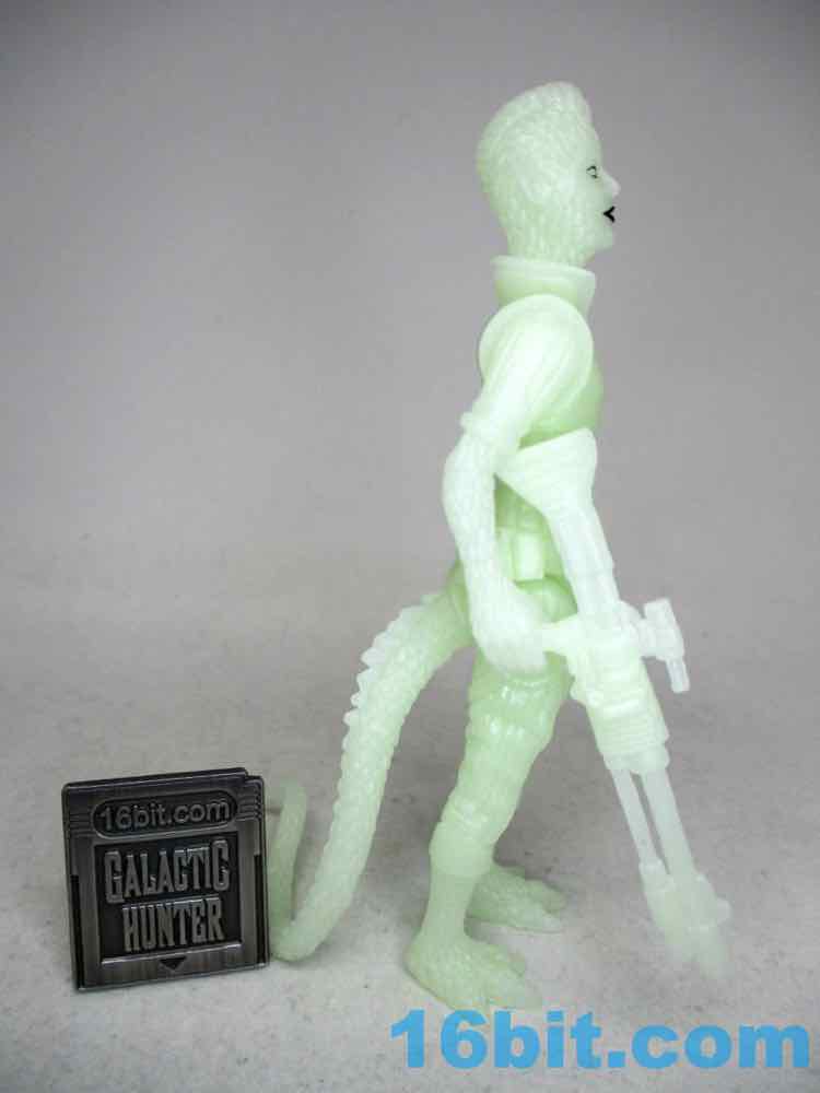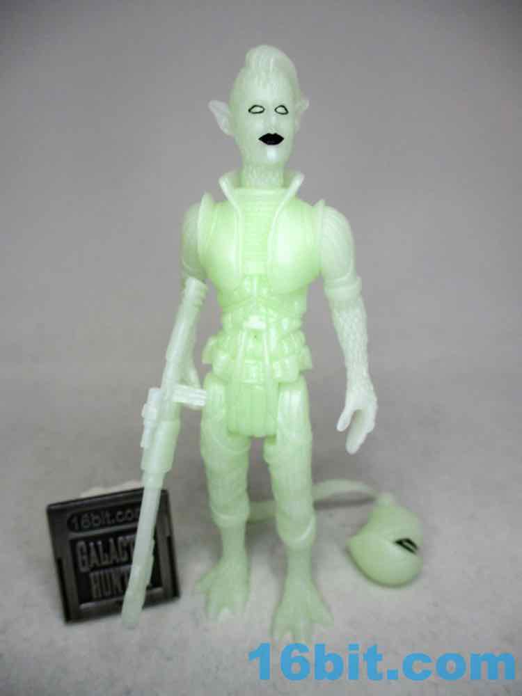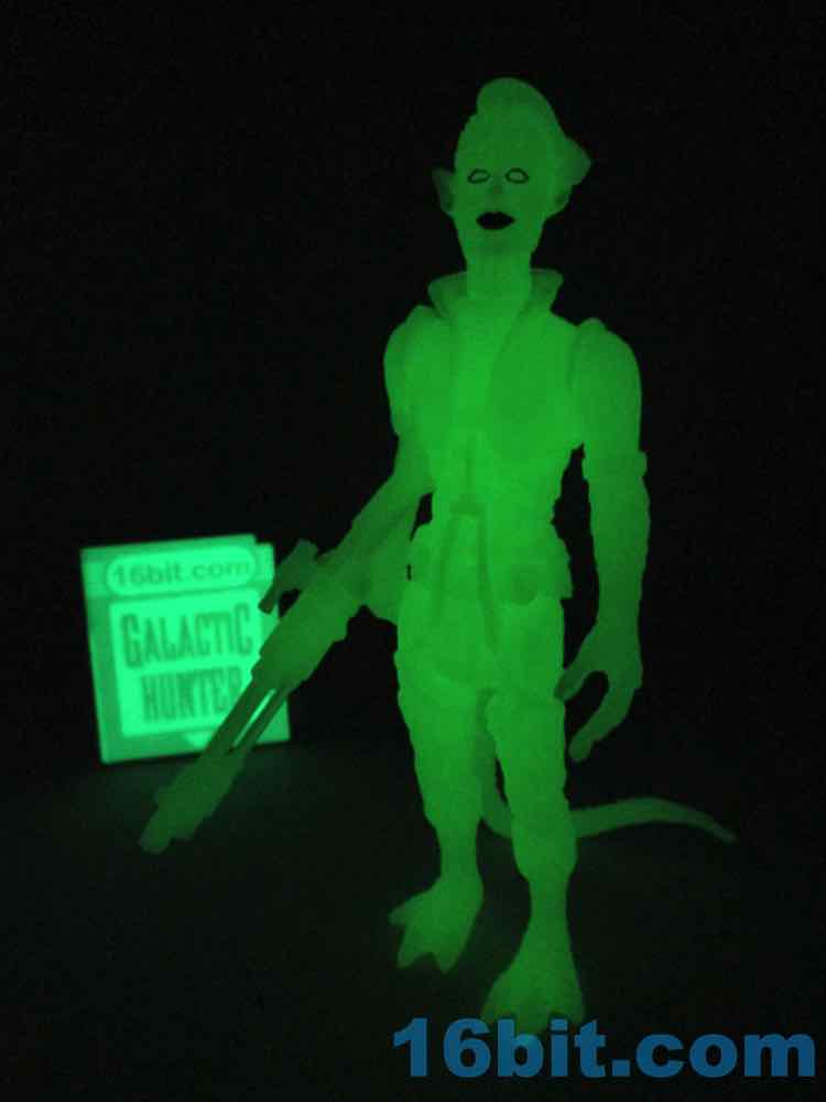 Our glowing friend also has a blaster that plugs in the back or fits in the fist, plus a tail that you have to plug in (or not use.) Like with most Glyos figures, all the fits are perfect, and the figure stands very well all be theirself. Surprisingly, the figure didn't immediately sell through - but it's also pretty easy to miss a drop if you weren't paying attention. (I am still irate I missed all news of the Trandoshan-color one.) I would hope and expect some day we'll see versions 2.0 of the Assassin and Raider in glow, but who can say for sure? If you have a crack at this one cheap, I'd say grab one. I'd also ask team Healey to give me one of these with red hair and a blue costume like Jann Tosh, but will my prayers be answered? We can hope!