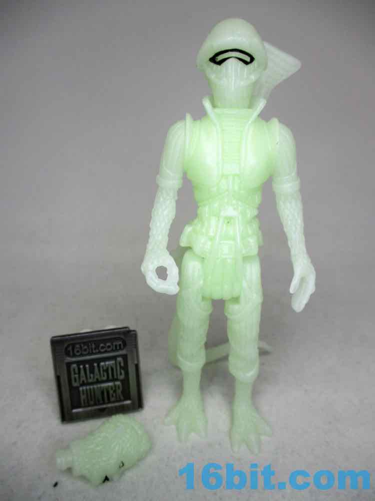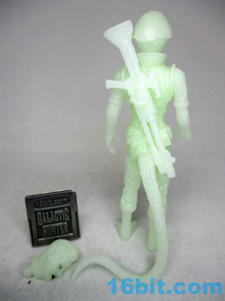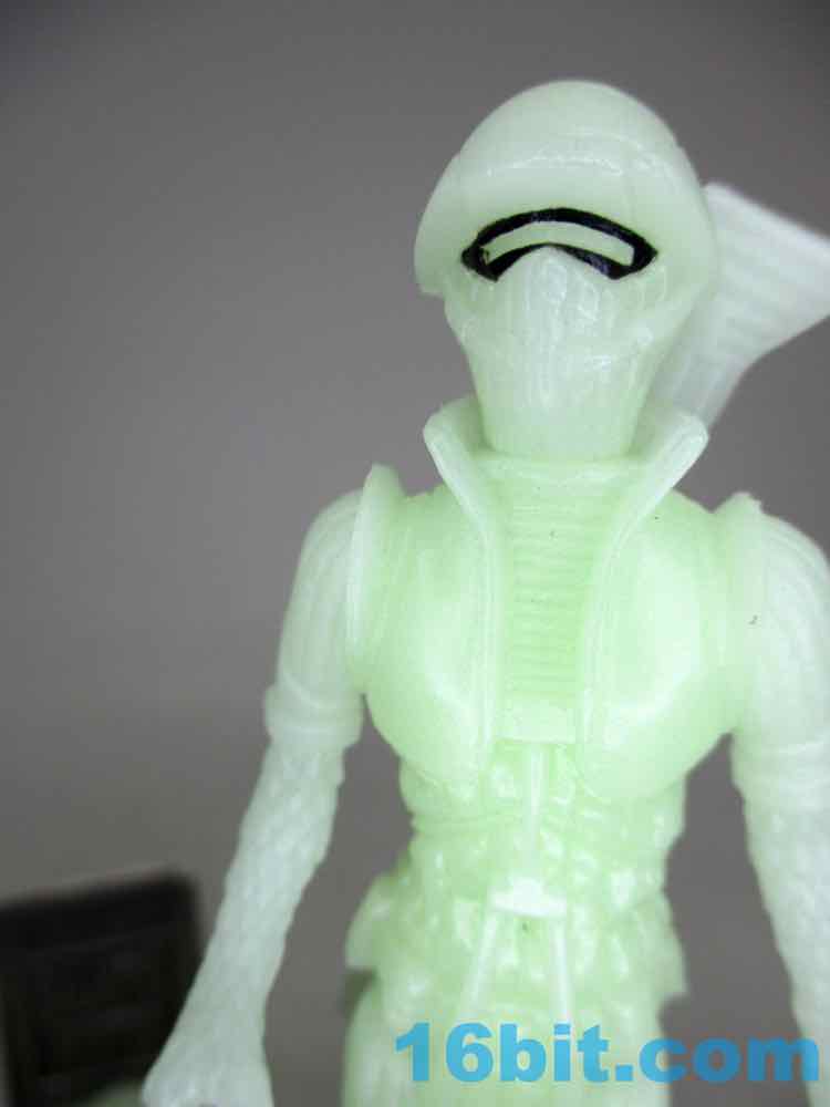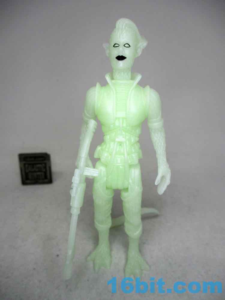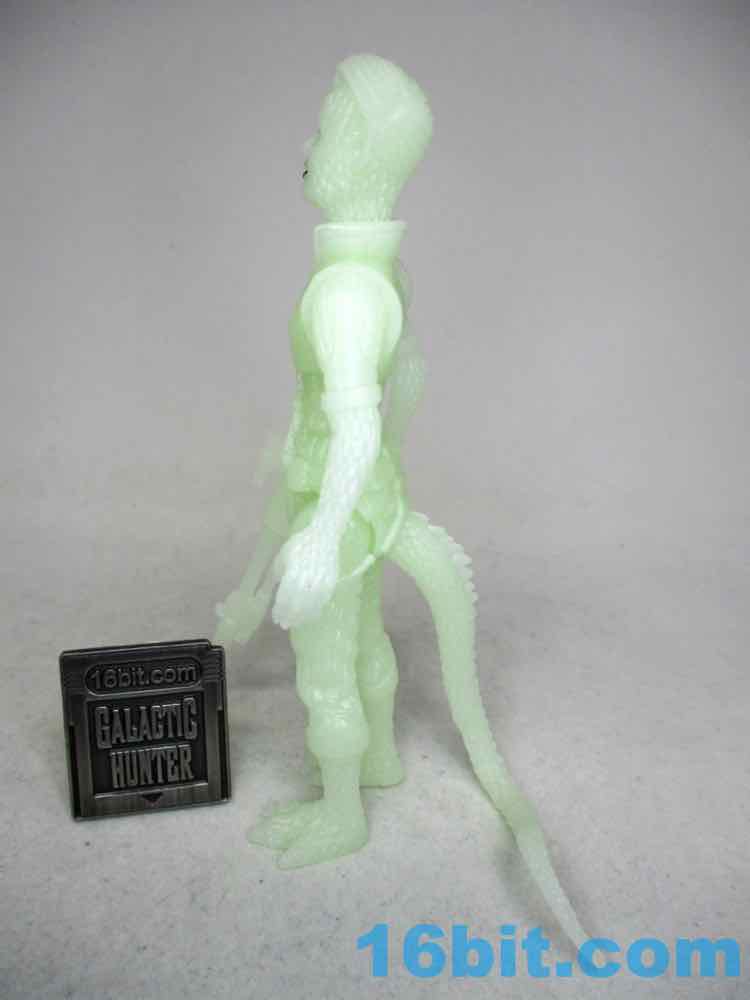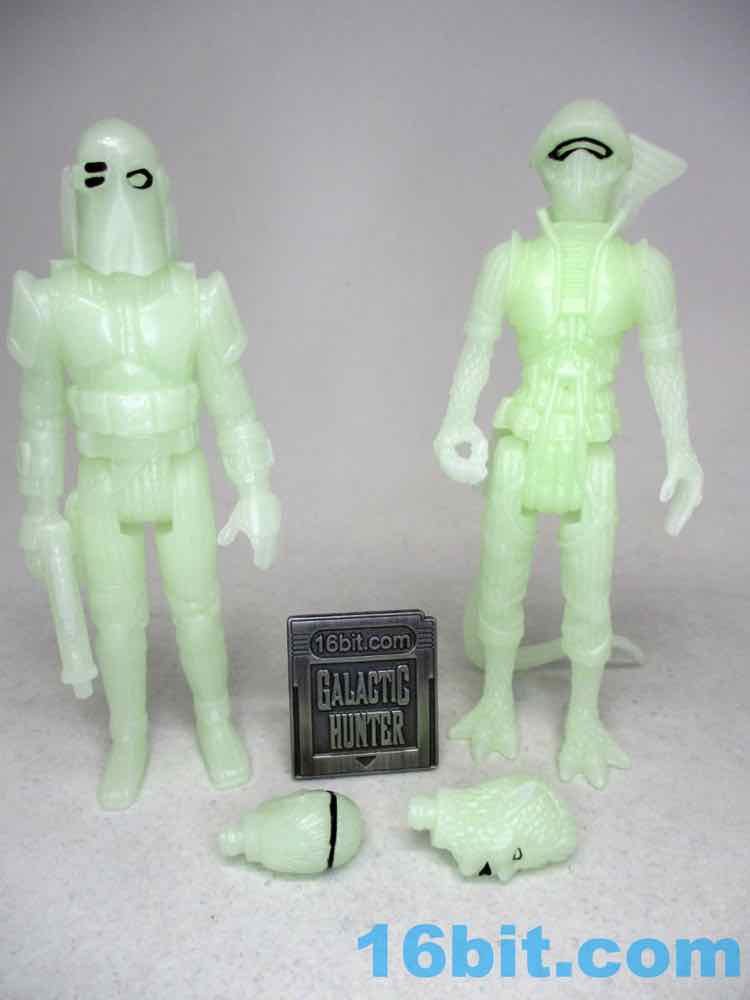 Our glowing friend also has a blaster that plugs in the back or fits in the fist, plus a tail that you have to plug in (or not use.) Like with most Glyos figures, all the fits are perfect, and the figure stands very well all be theirself. Surprisingly, the figure didn't immediately sell through - but it's also pretty easy to miss a drop if you weren't paying attention. (I am still irate I missed all news of the Trandoshan-color one.) I would hope and expect some day we'll see versions 2.0 of the Assassin and Raider in glow, but who can say for sure? If you have a crack at this one cheap, I'd say grab one. I'd also ask team Healey to give me one of these with red hair and a blue costume like Jann Tosh, but will my prayers be answered? We can hope!